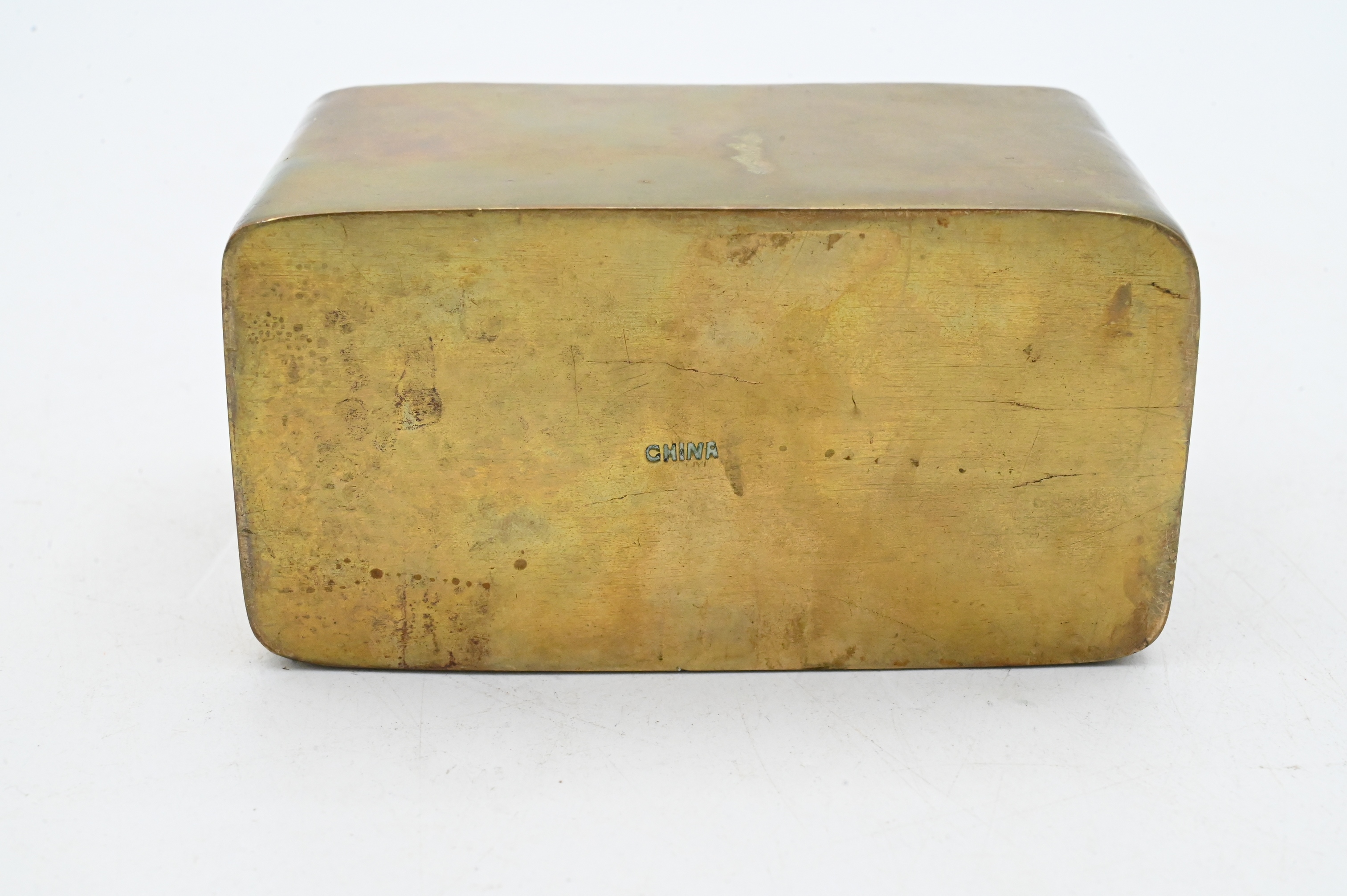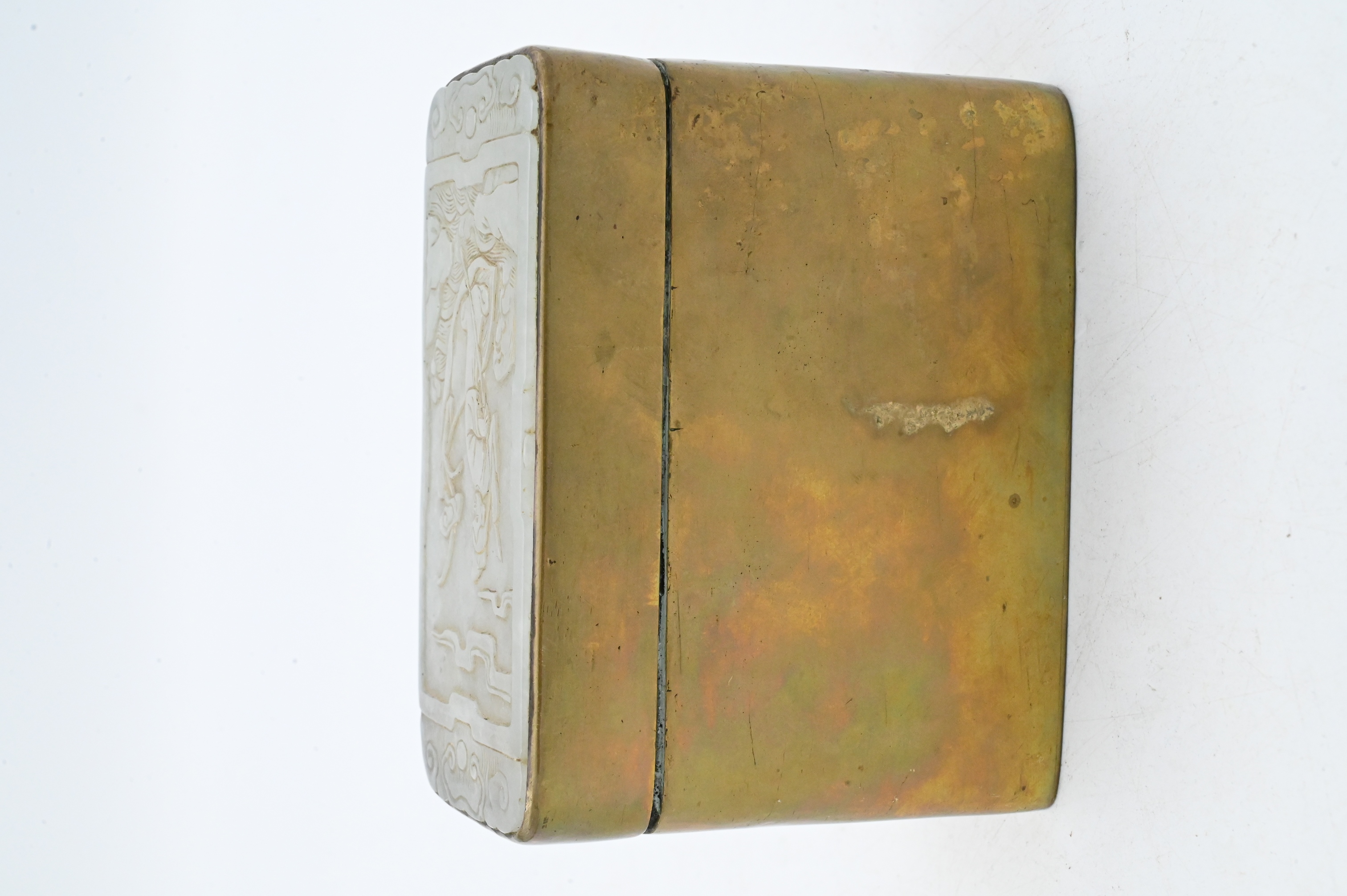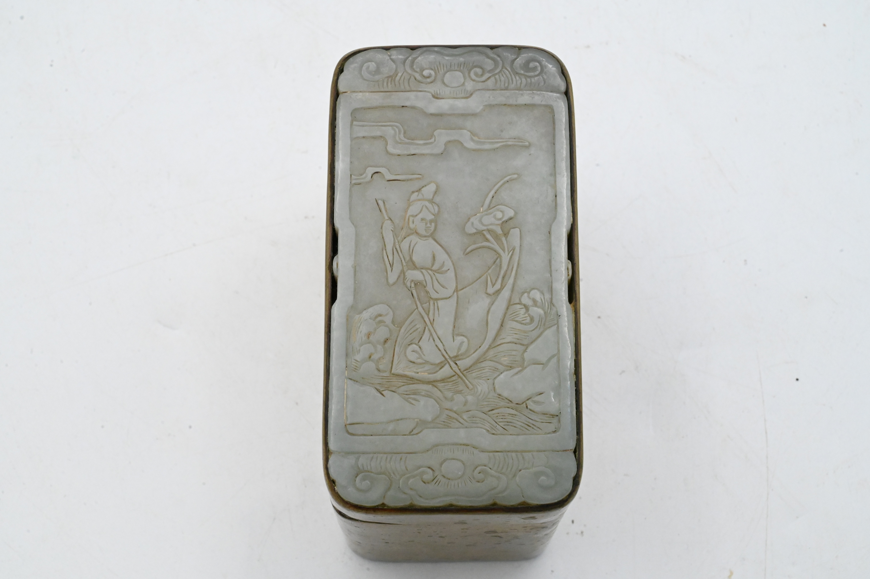 A rectangular Chinese brass box mounted with a celadon jade plaque, the plaque carved in relief with a female figure riding on a leafy vessel beneath clouds. The jade appears to predate the box and was later mounted into the cover.