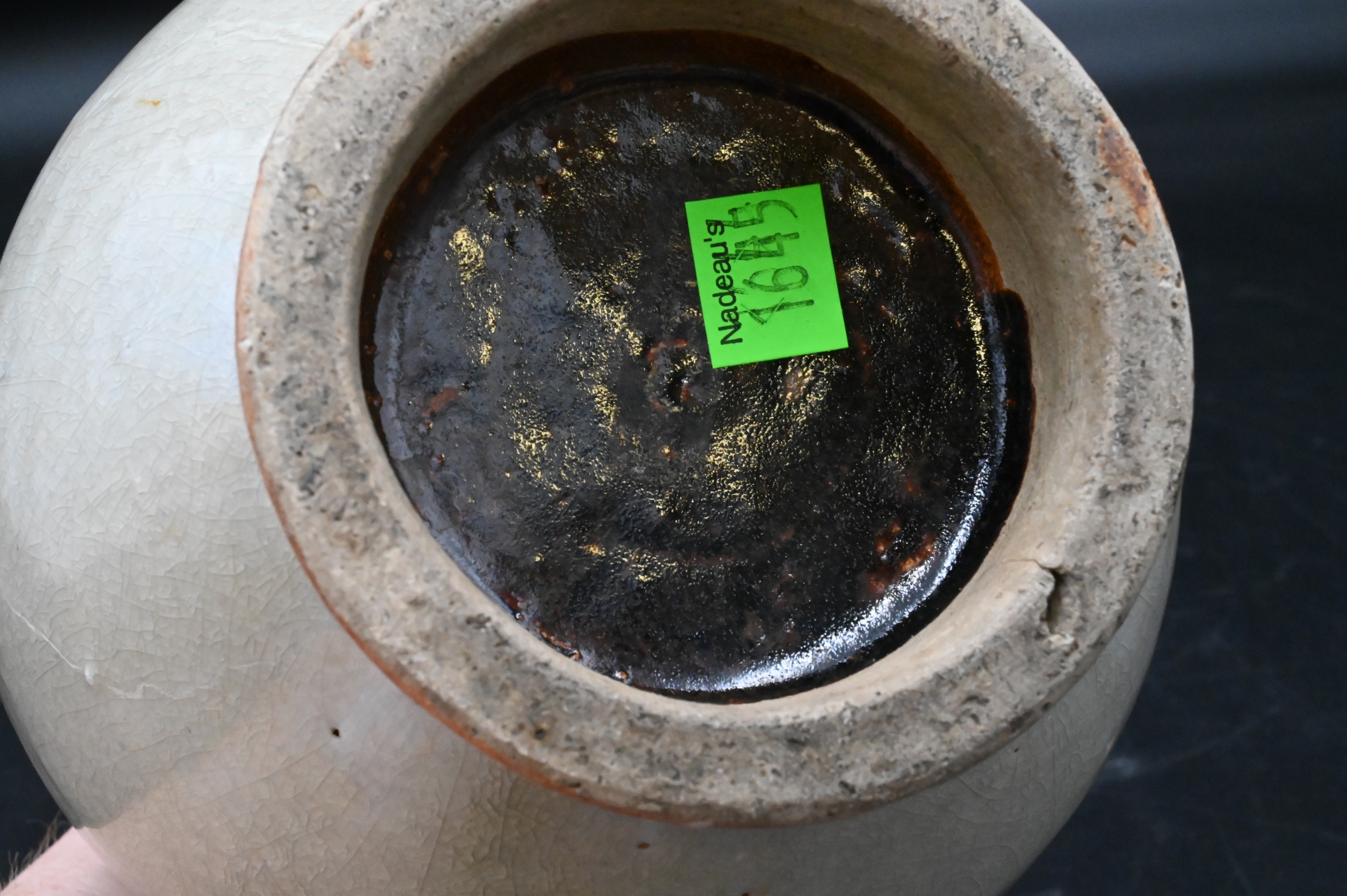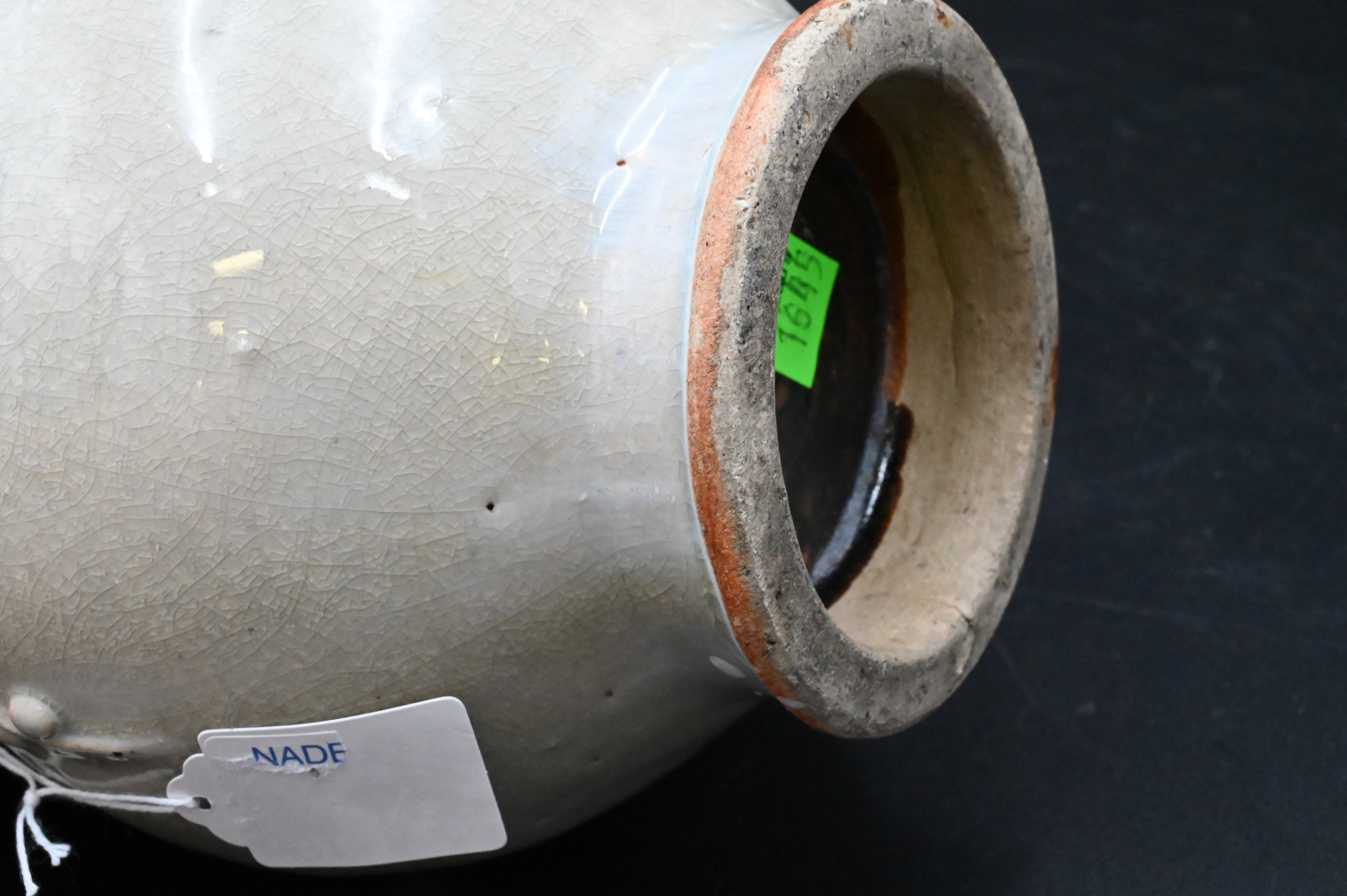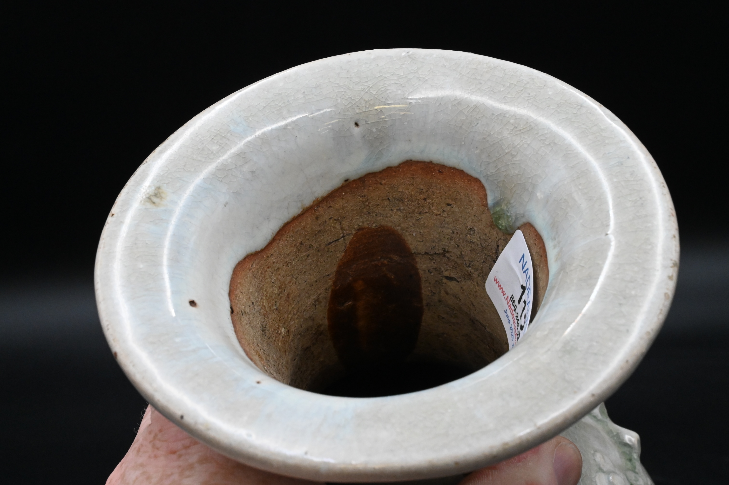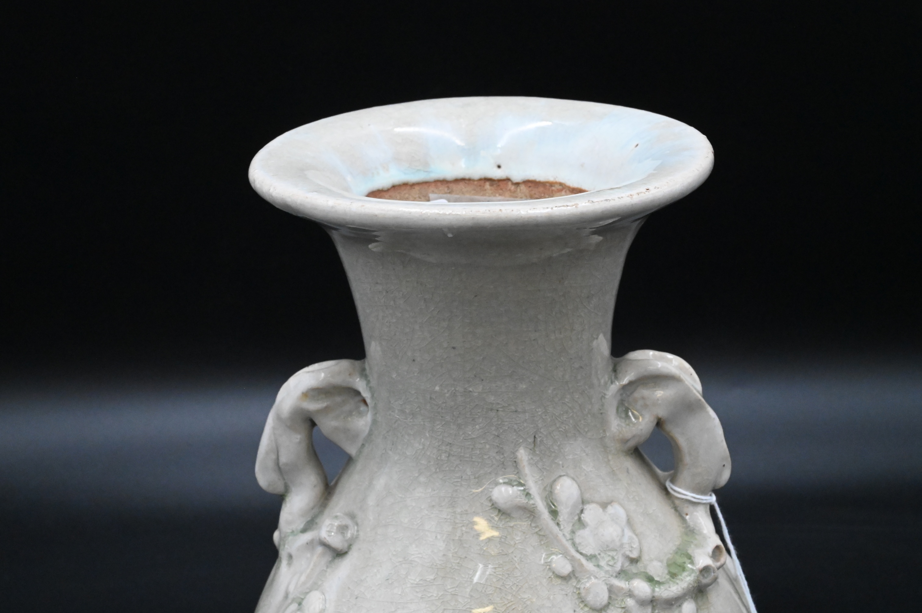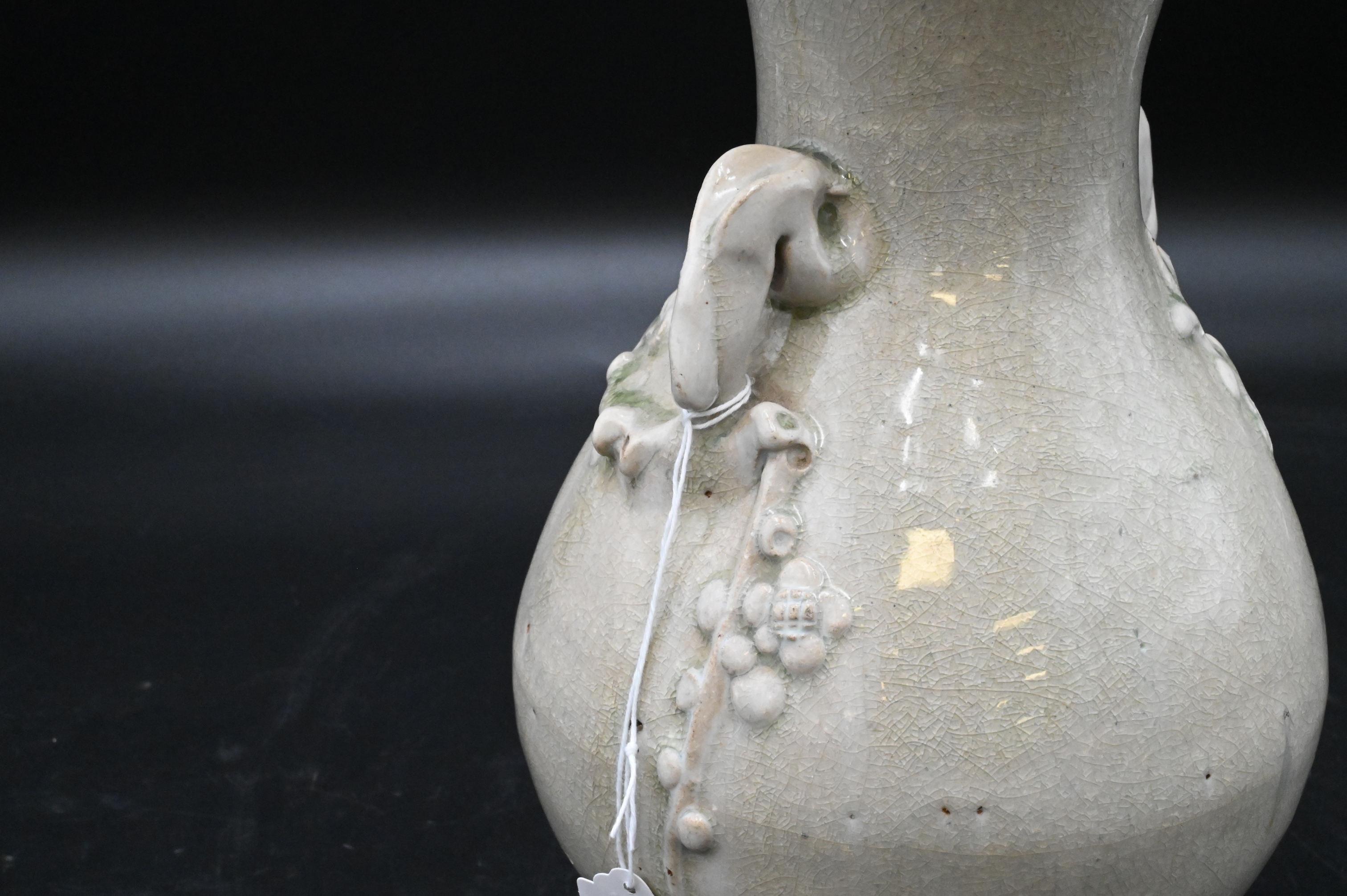 Chinese Celadon Glazed Vase, having molded handles of berries and flowers, height 10 1/2 inches, diameter 5 1/4 inches
