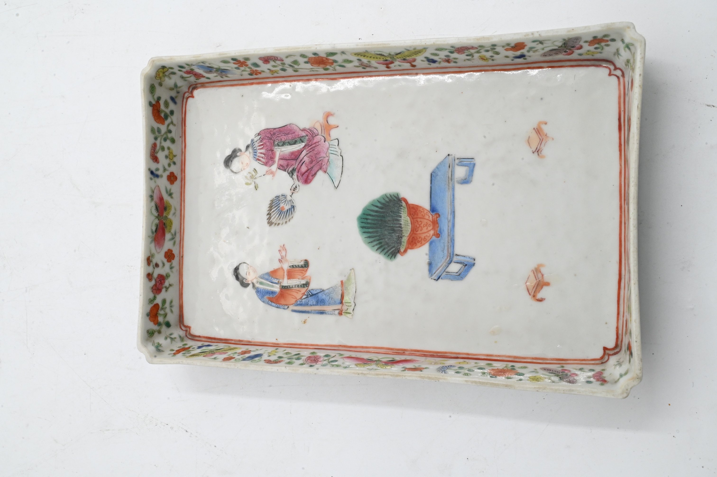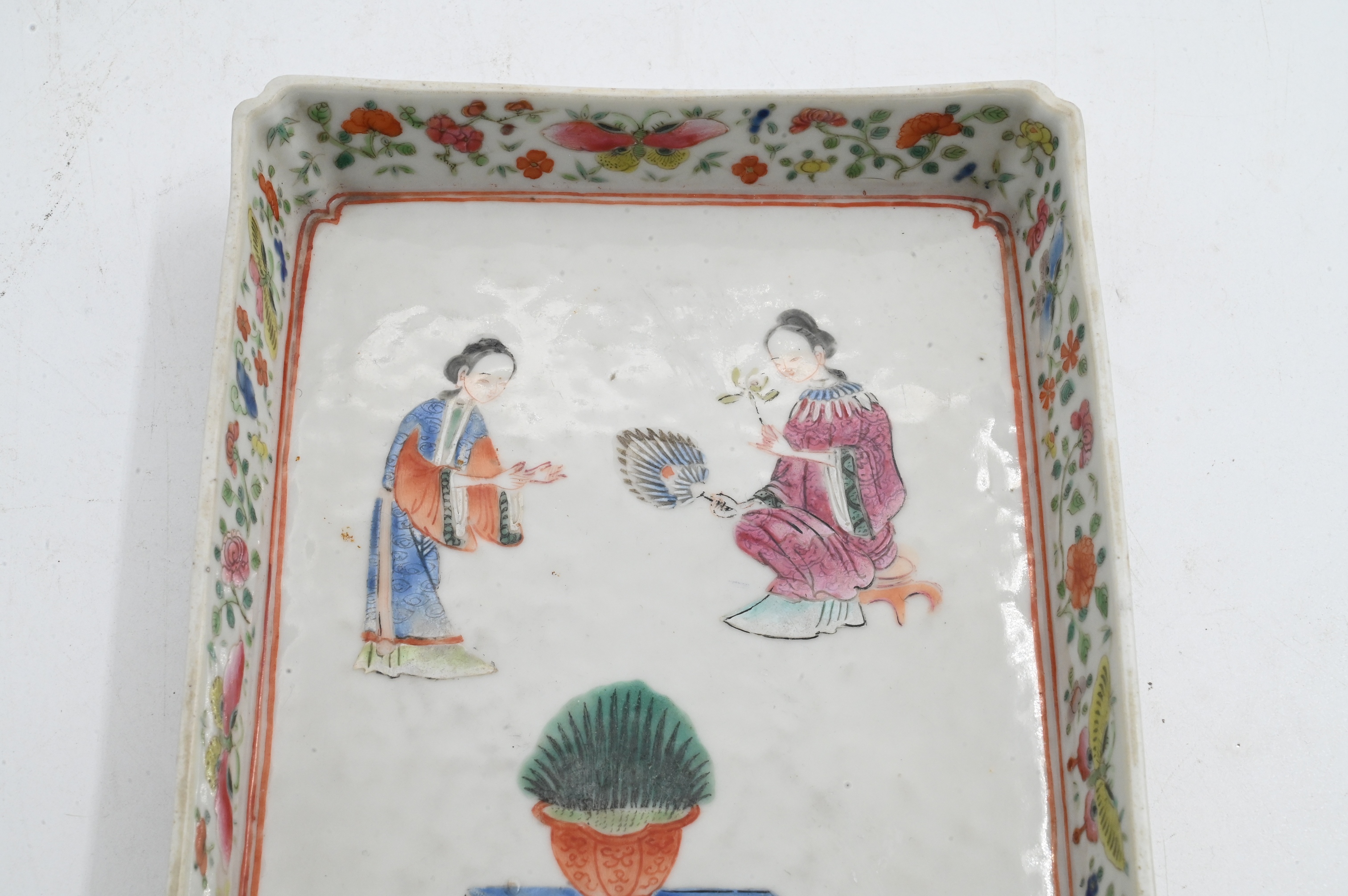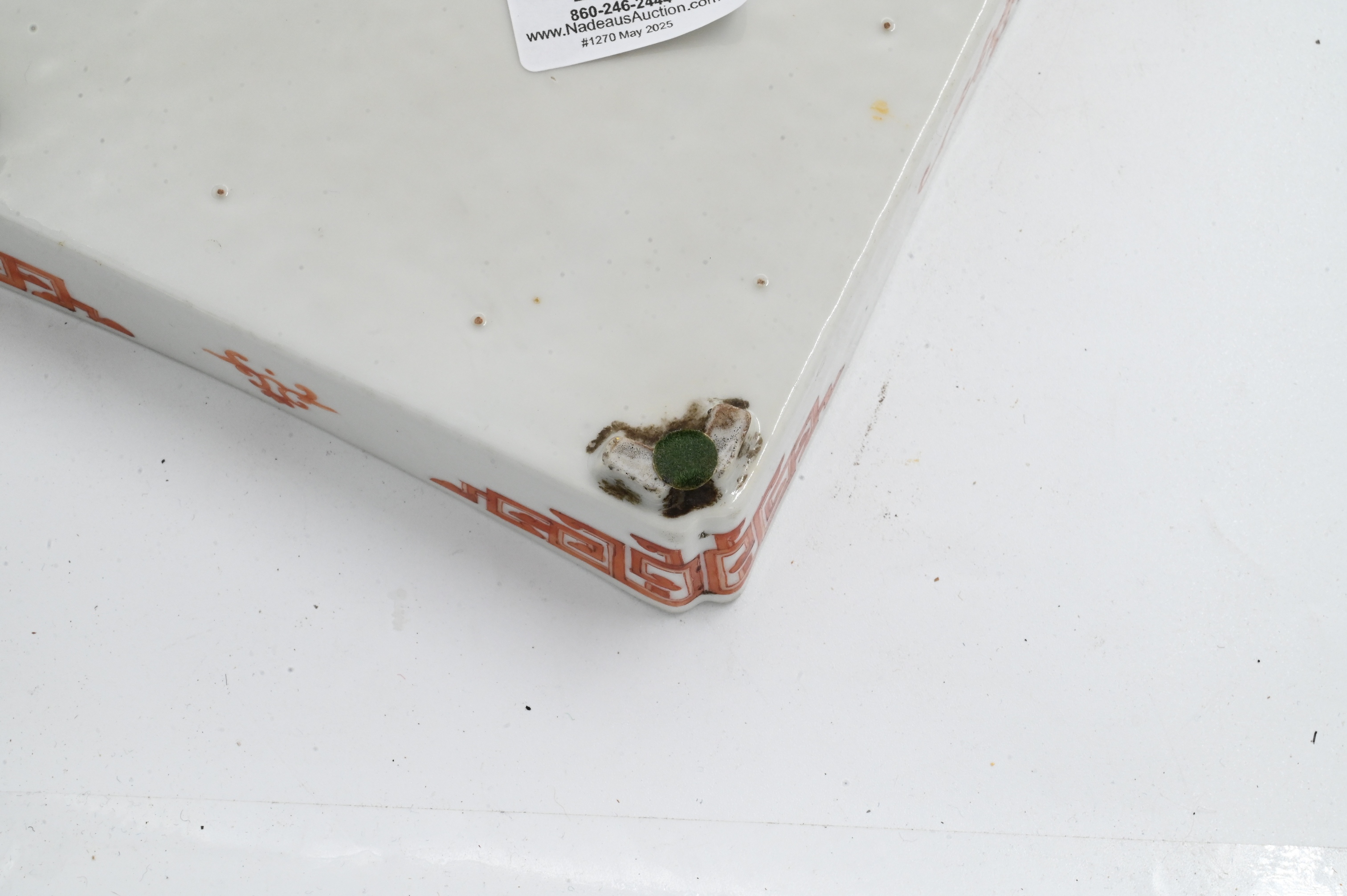 of rectangular form raised on four shaped feet, center depicting two Geishas, one woman with fan, the other bowing beside a potted plant on a bench bordered by butterfly and flower motif, exterior geometric design in iron red