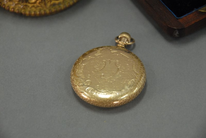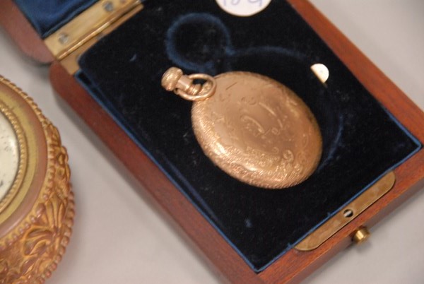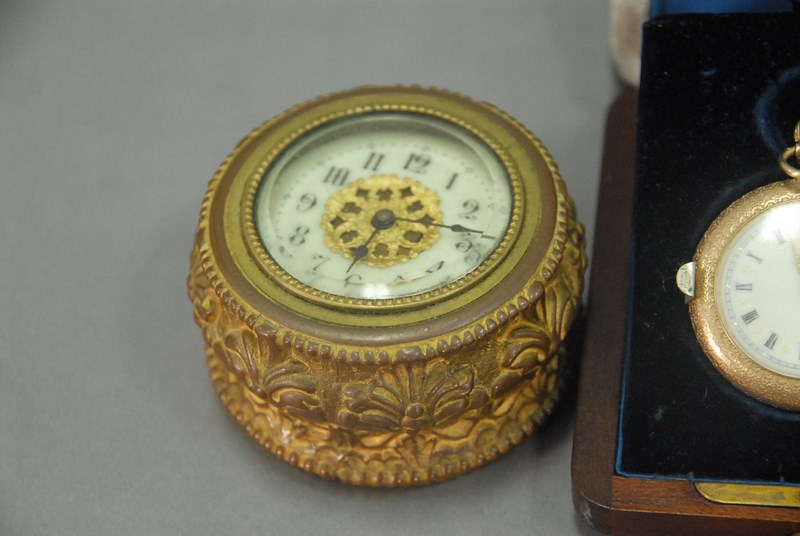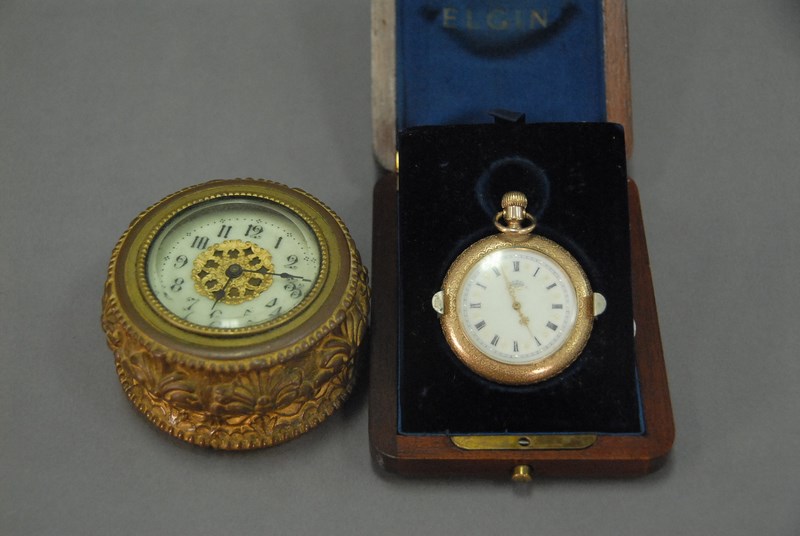 Elgin gold plated lady’s watch with porcelain dial and desk clock with porcelain dial.