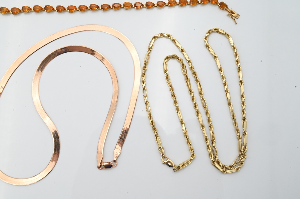 Lot 112: Four Piece Lot, to include three 14 karat yellow gold necklaces with pearls, along with a bracelet set with amber stones, 33 grams t…