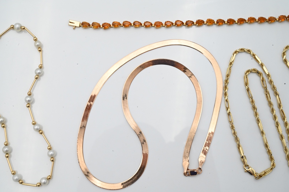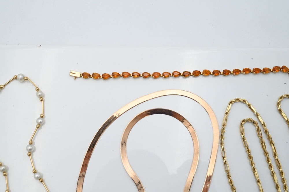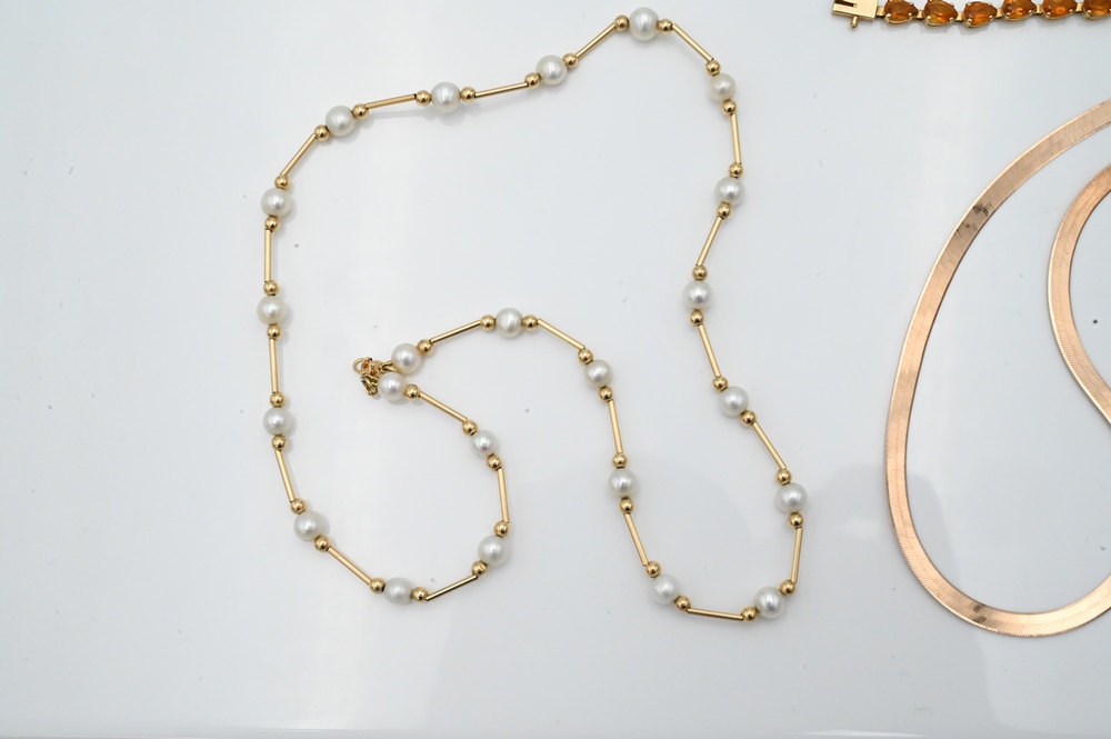 Four Piece Lot, to include three 14 karat yellow gold necklaces with pearls, along with a bracelet set with amber stones, 33 grams total weight.