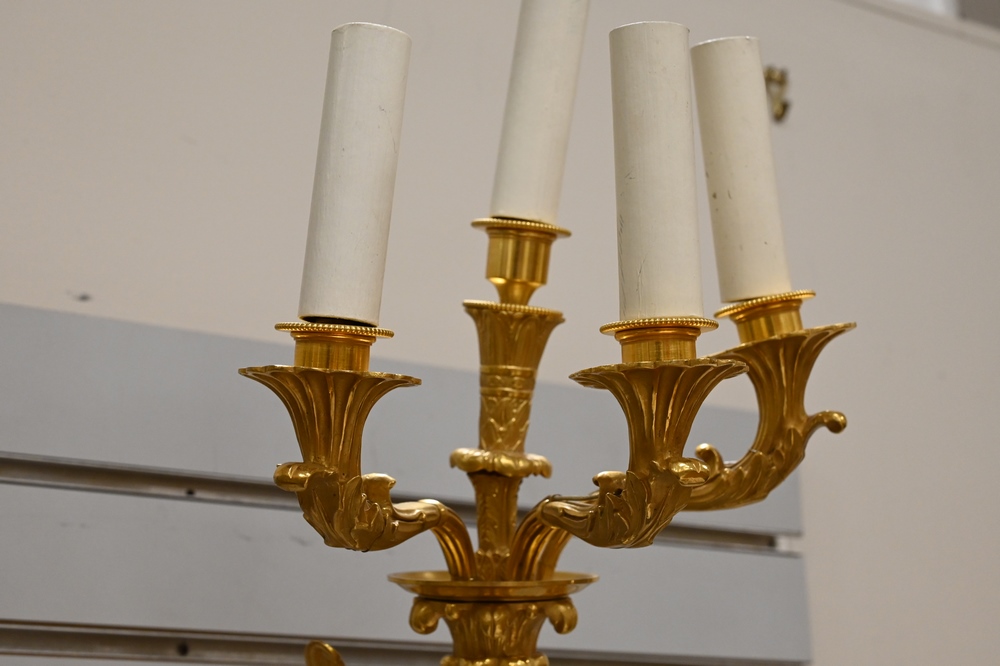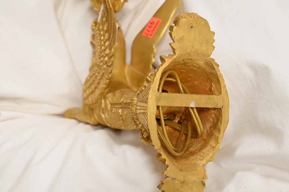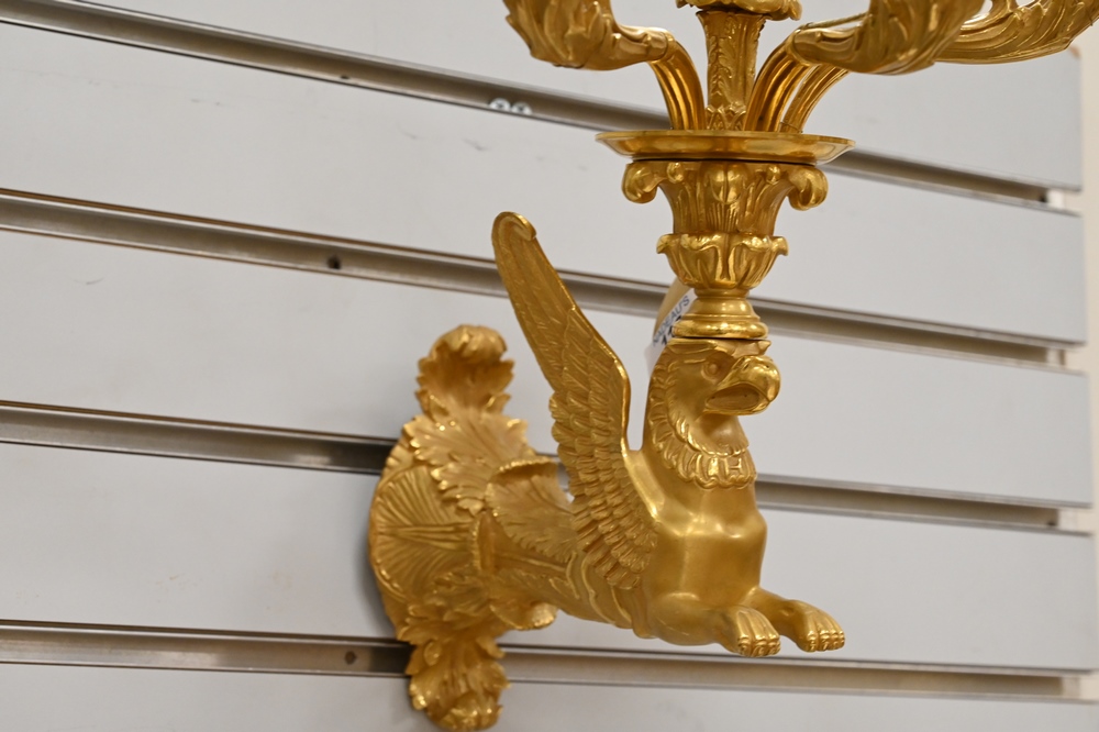 Lot 112: French Gilt Bronze Figural Sconce, having winged griffin support with four lights, height 18 inches, width 9 inches.