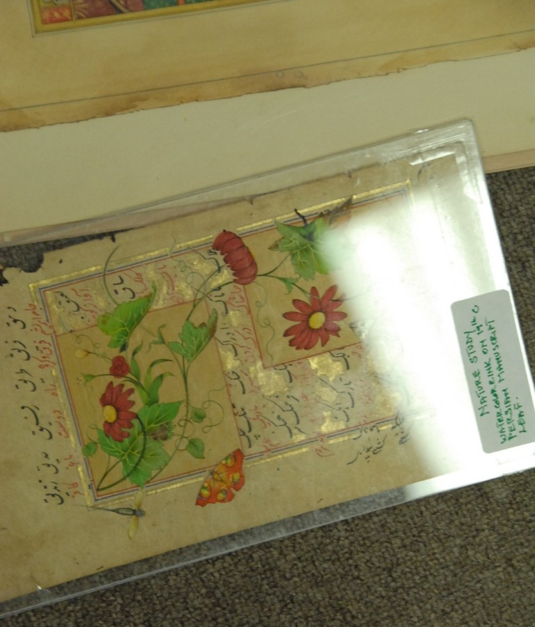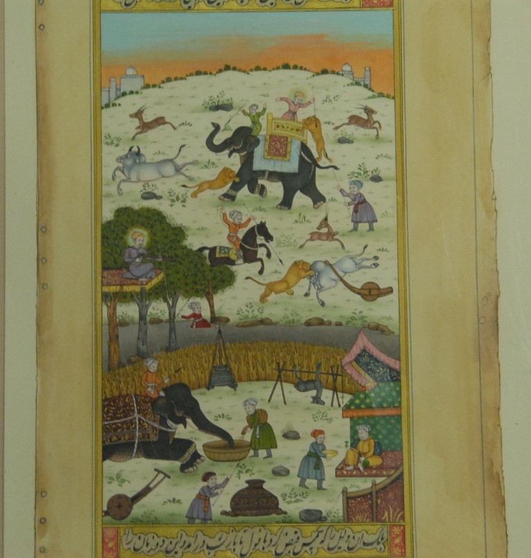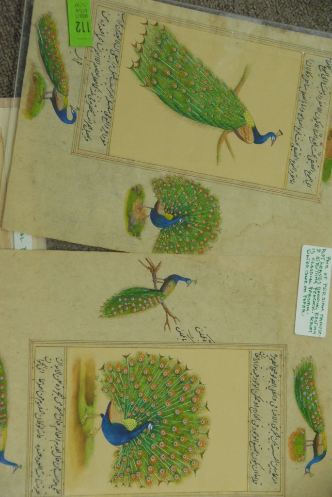 Group lot of four watercolor manuscript leaves 2 of birds, 1 of animals and people, and 1 of nature study, 1 reproduction signed Hayam.