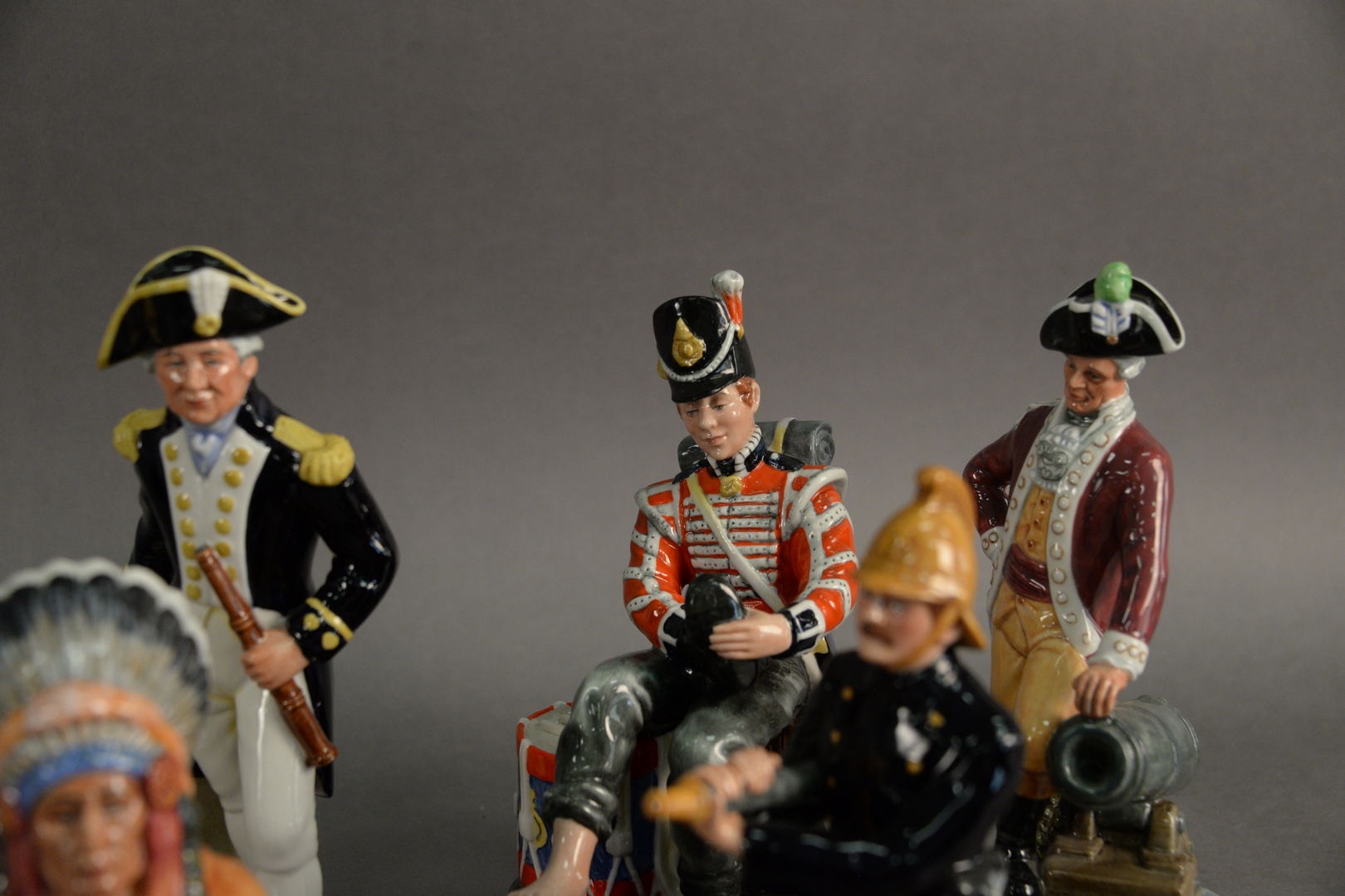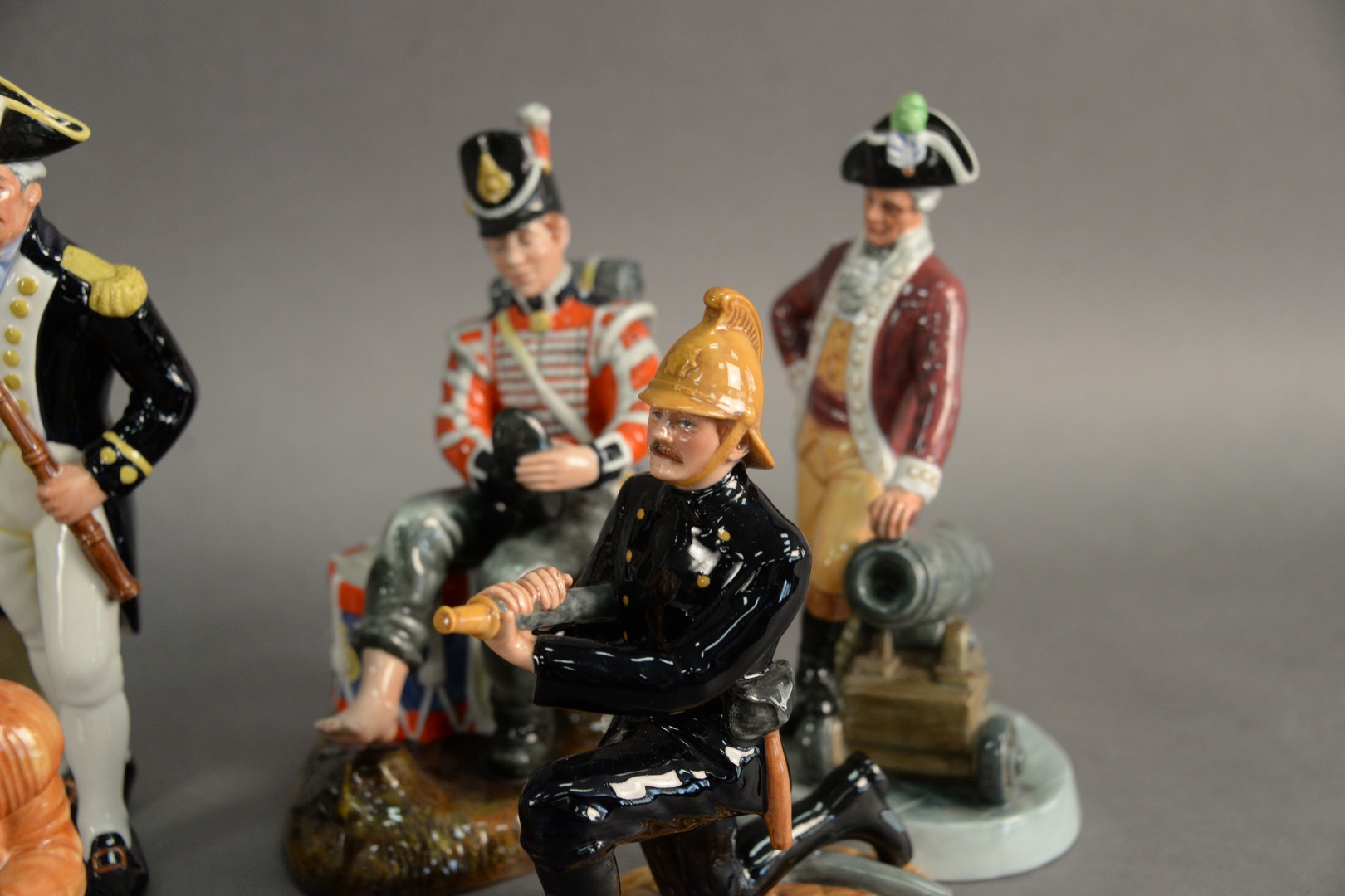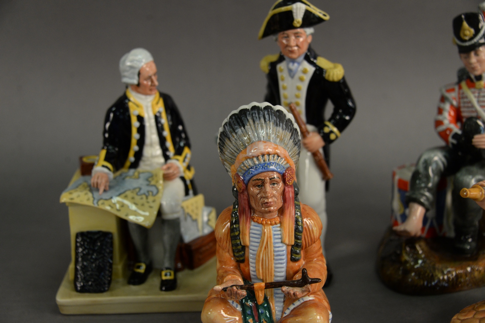 Lot 112: Group of Six Royal Doulton Porcelain Figures, to include “The Captain”, “Drummer Boy”, “Officer of the Line”, “Fireman”, “The Chief”, along with “Captain Cook”, each marked to the underside, height of tallest 9 1/2 inches. Provenance: Estate of James Wadhams.