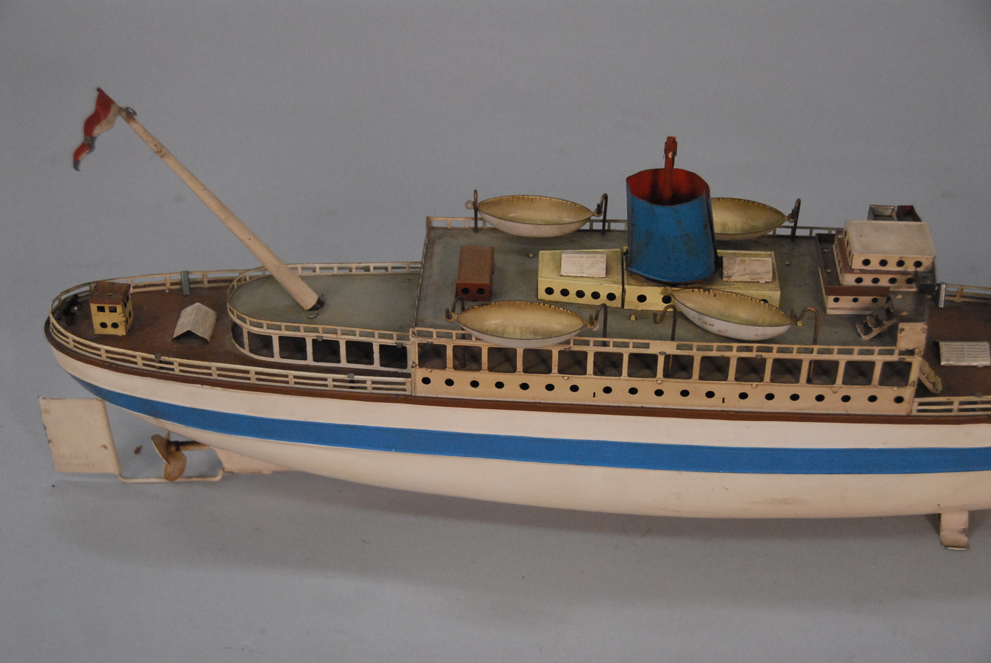 Lot 112: Large 1950’s Vintage German tin toy ocean liner boat, lifelike with life boats and American flag, original paint and decal Gebr. Fleischmann Numberg GFN. lg. 20in.