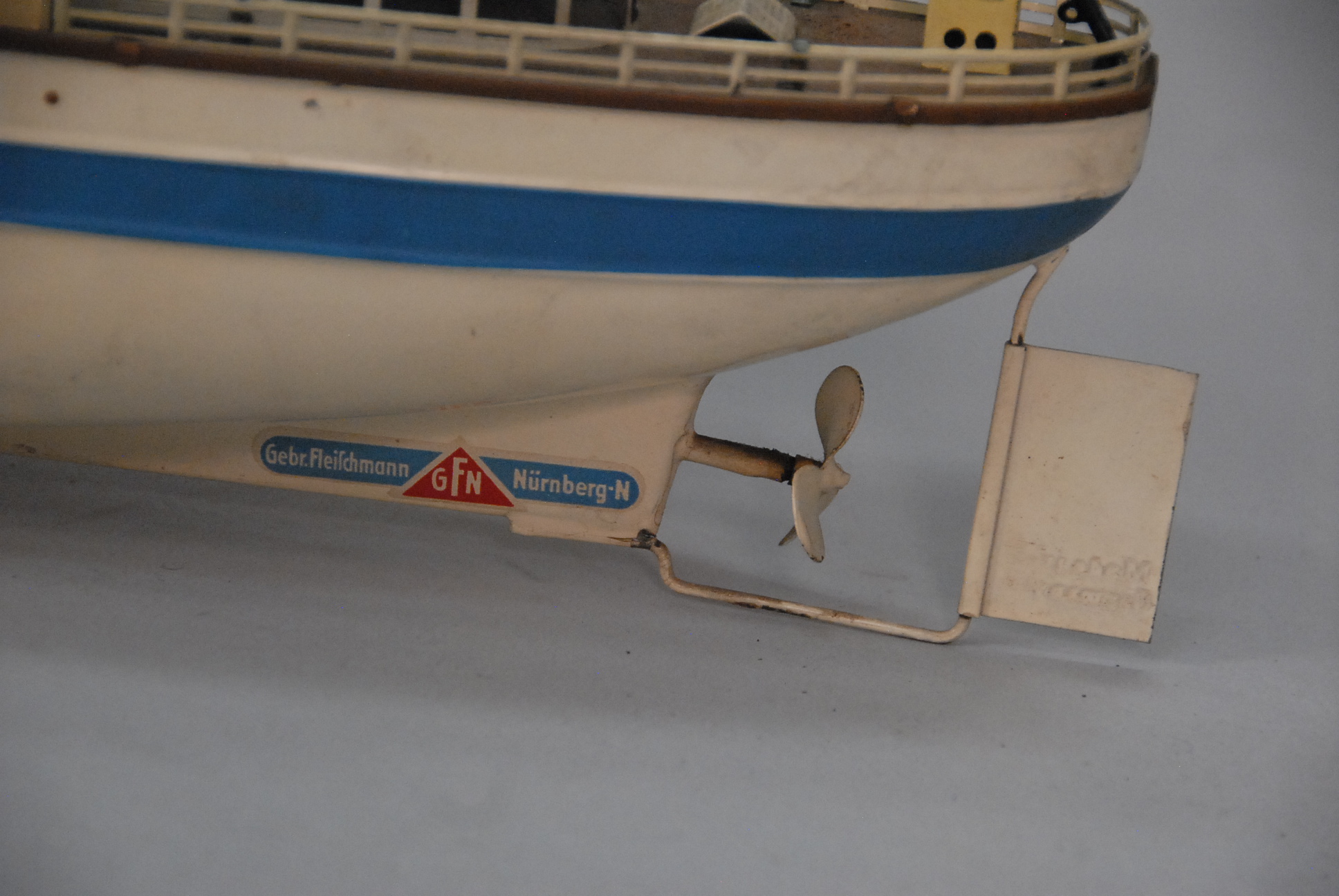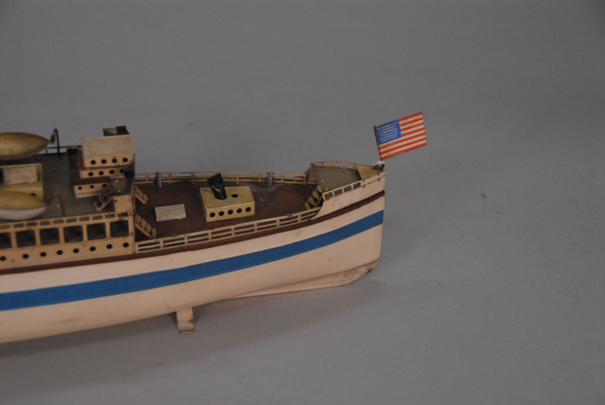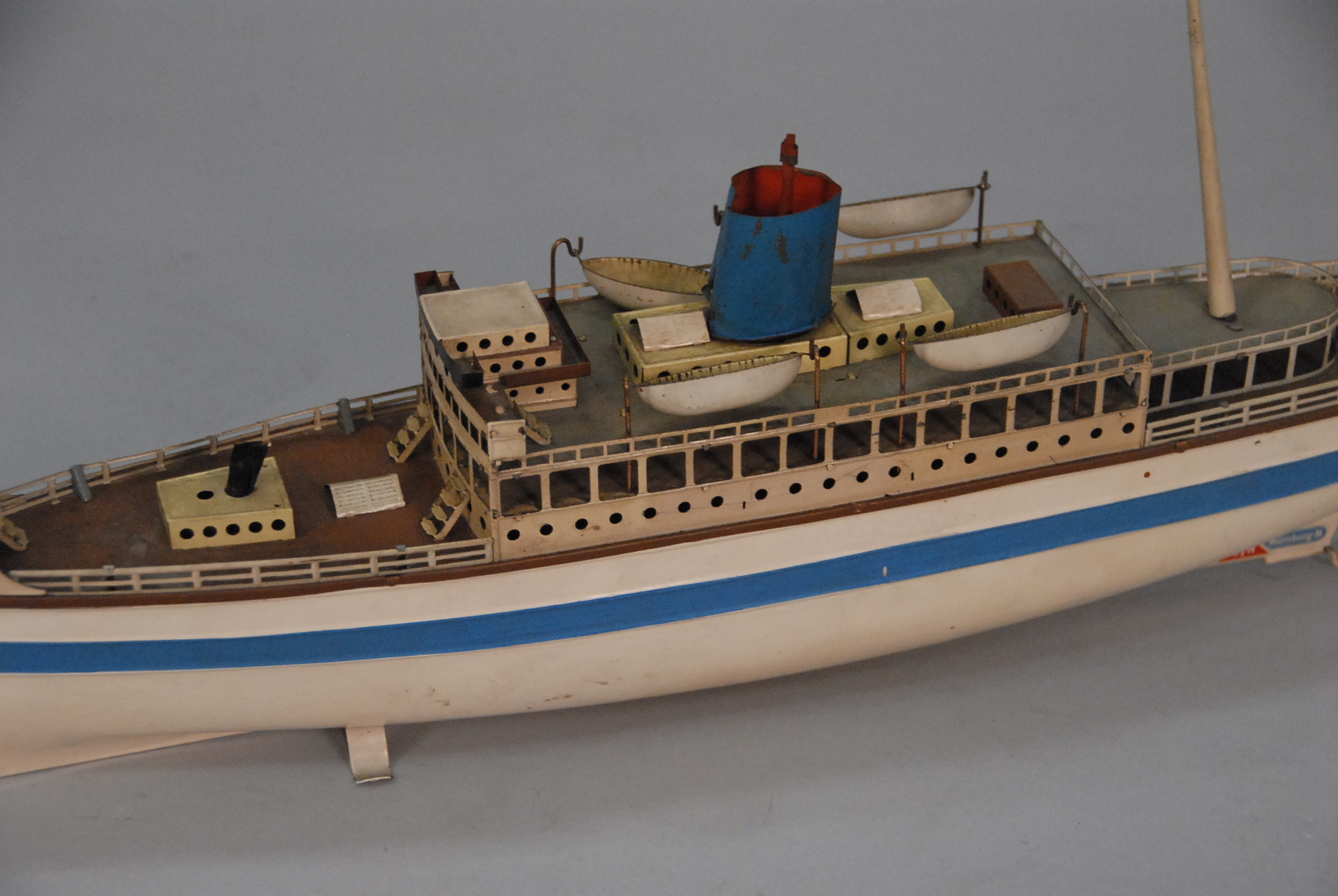 Large 1950’s Vintage German tin toy ocean liner boat, lifelike with life boats and American flag, original paint and decal Gebr. Fleischmann Numberg GFN. lg. 20in.