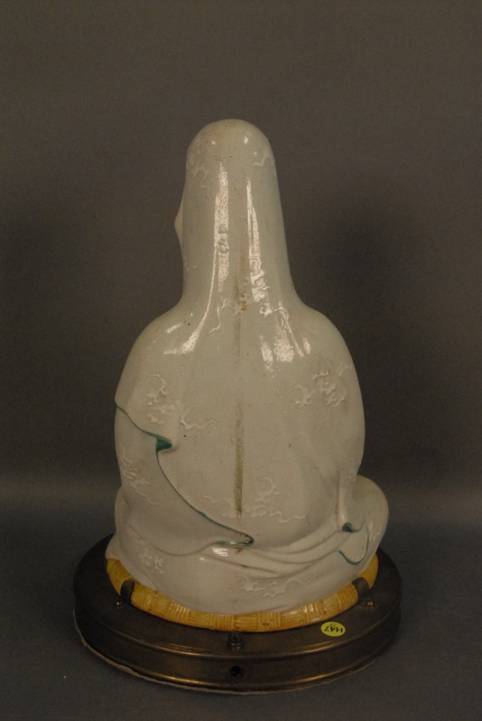 Lot 112: Large porcelain guanyin figure seated wearing a white robe and holding a scroll, all set on a brass base, ht. 16.