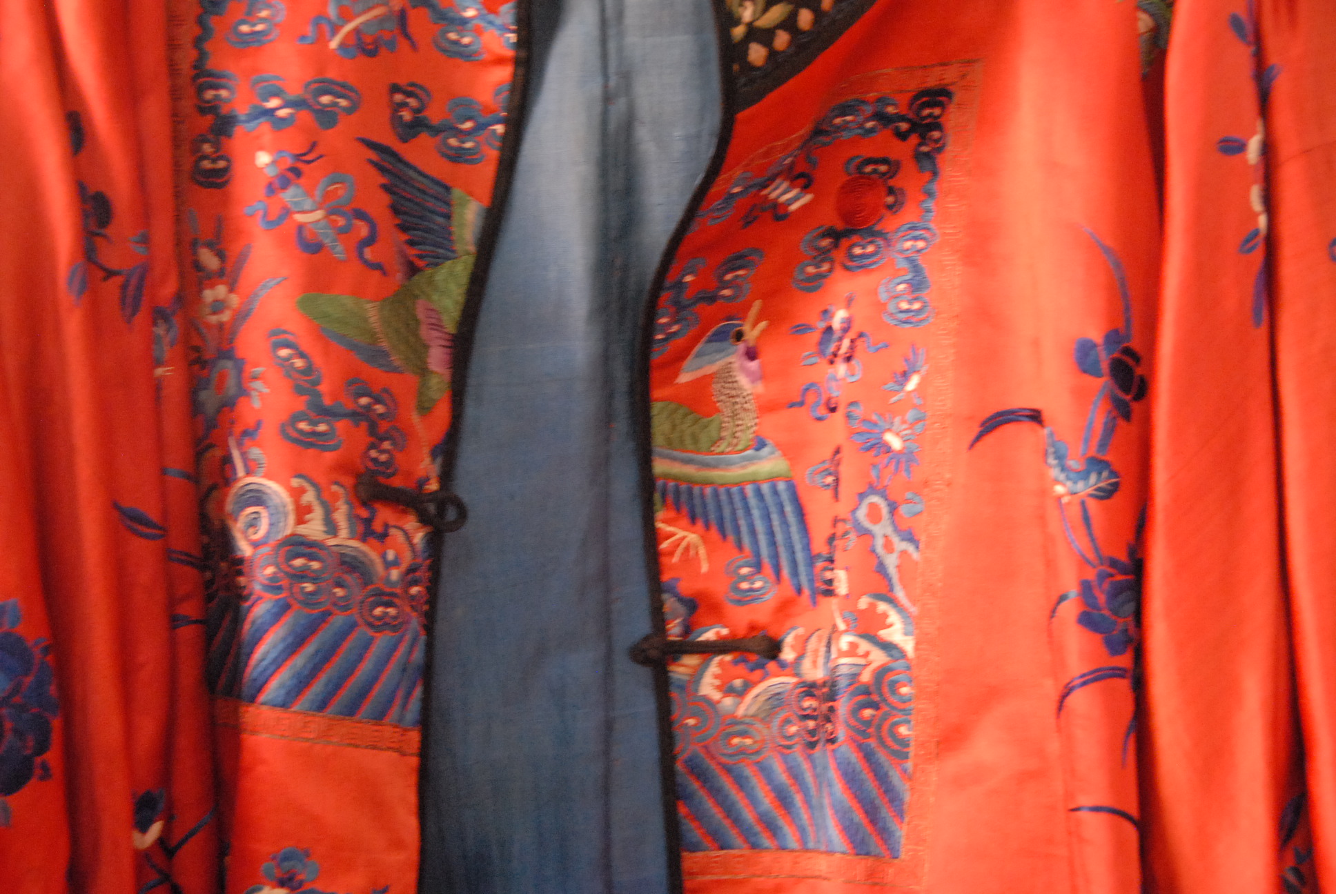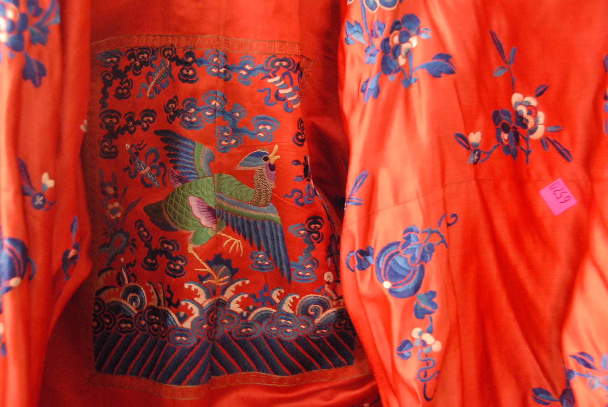 Lot 112: oriental silk robe with needlepoint ducks and wild flowers.