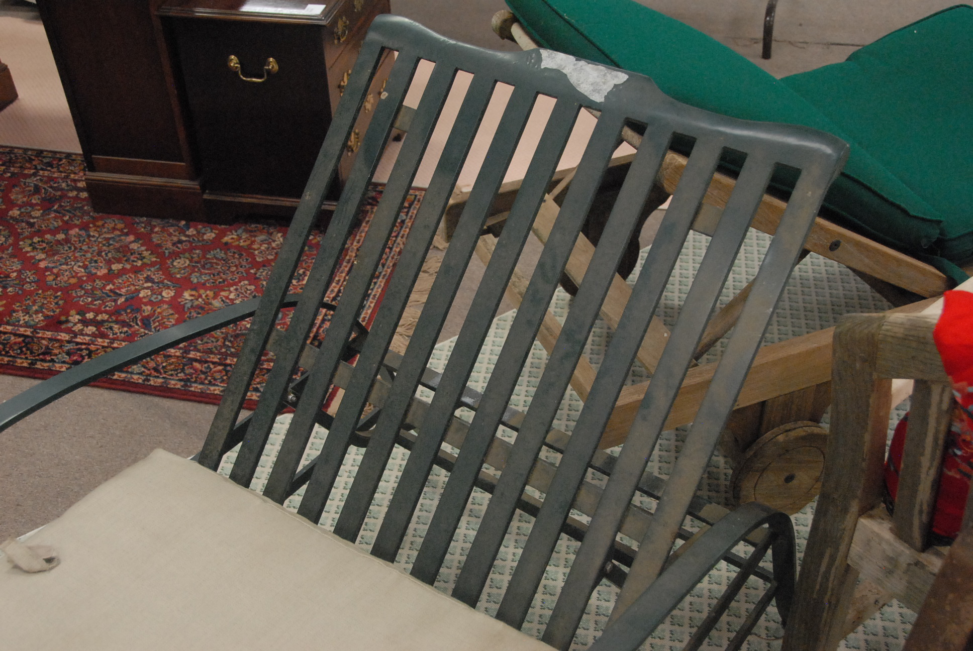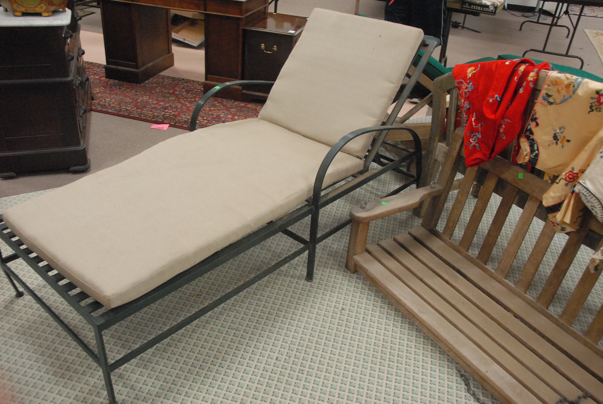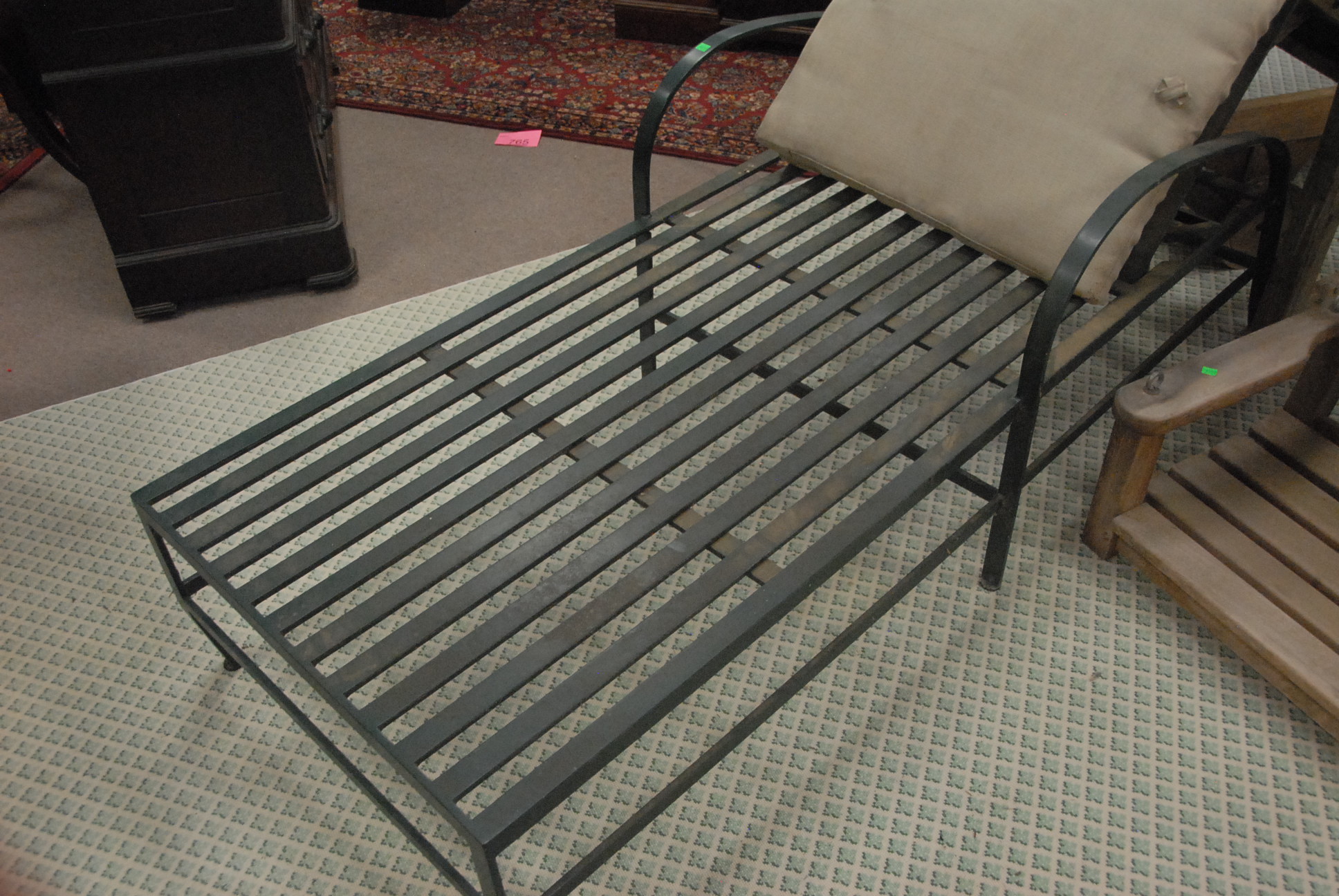 Lot 112: Pair McKinnon and Harris iron chaise lounges with adjustable head rests and custom cushions.