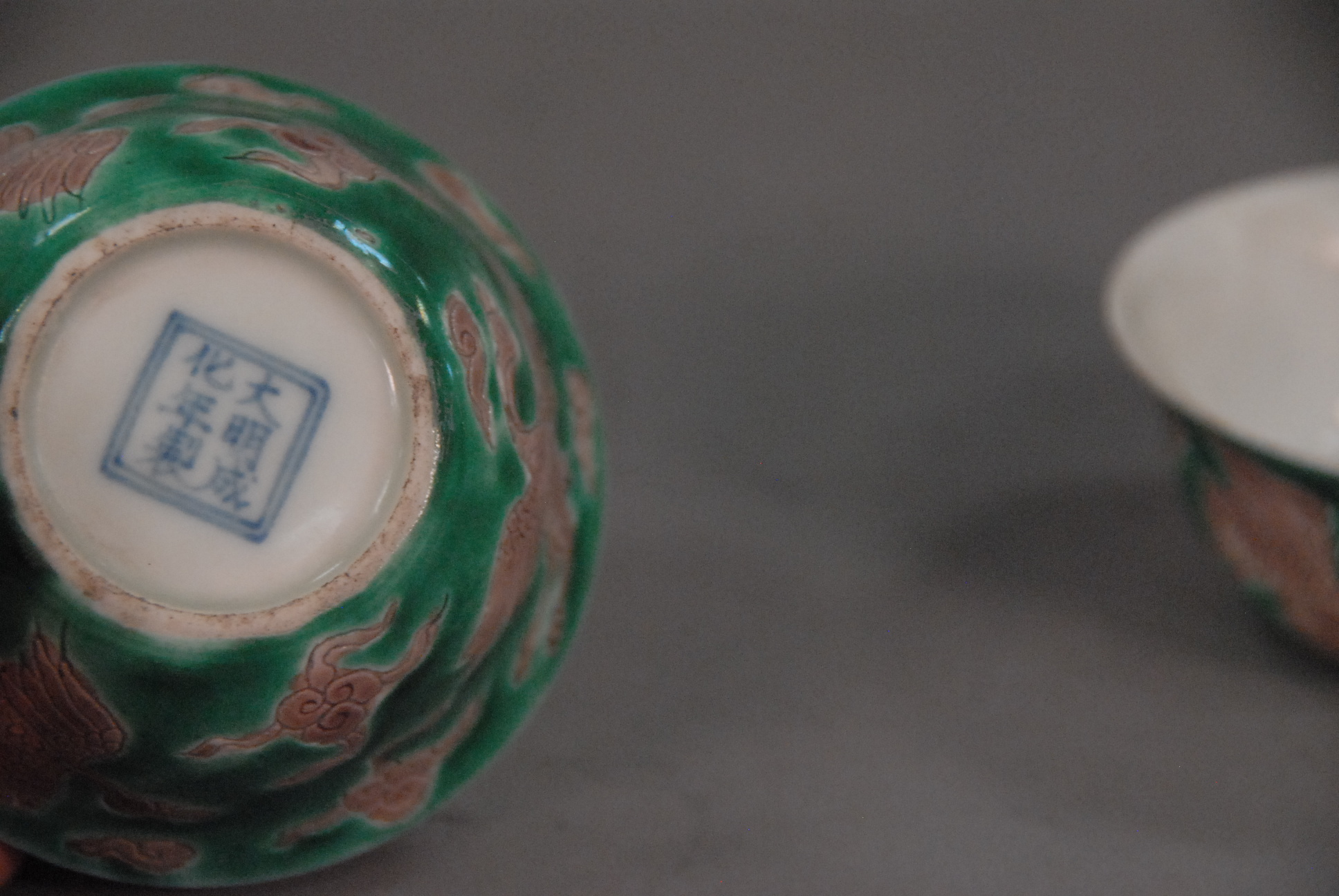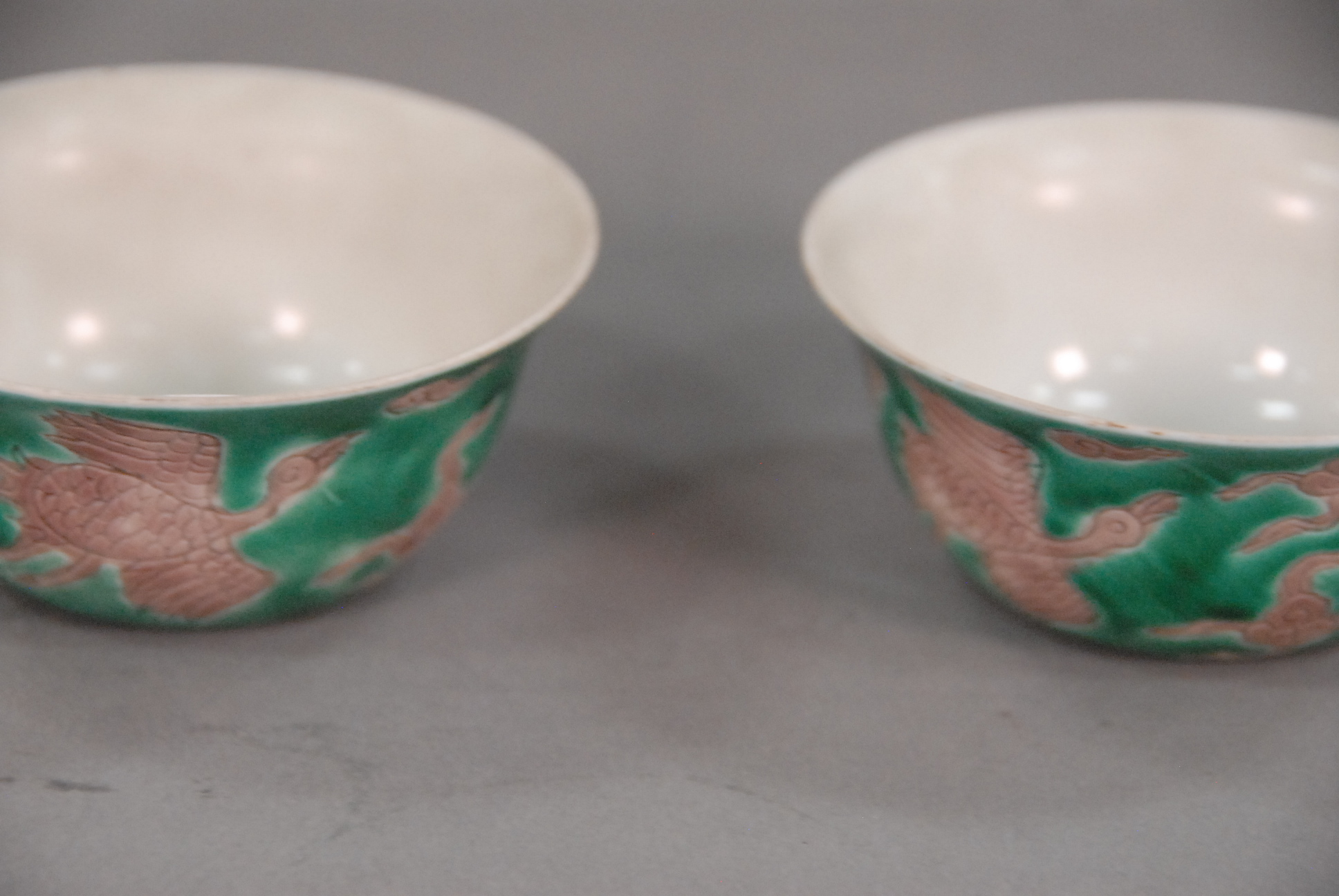Pair of green ground porcelain cups with flying cranes and flaming clouds, seal mark on bottom.