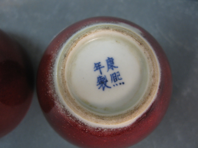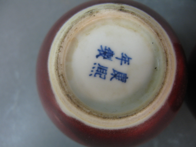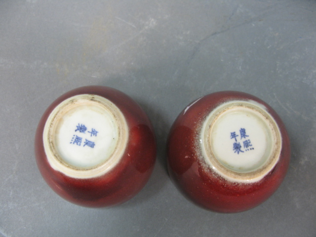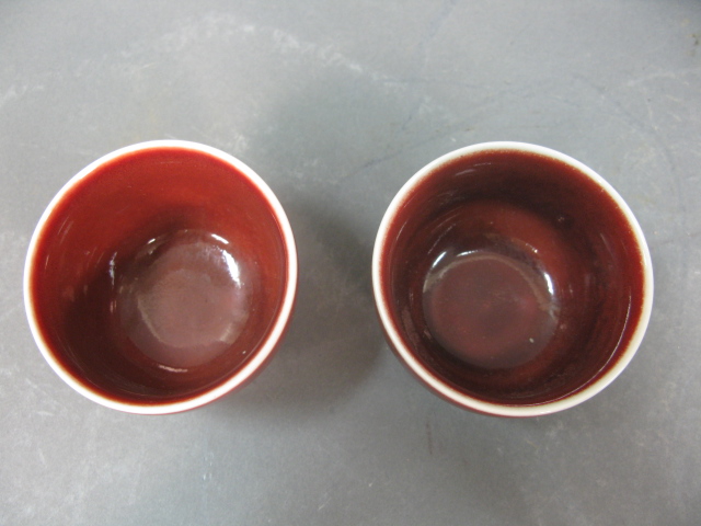 Pair of small red glazed porcelain cups with four character marks on bottom.