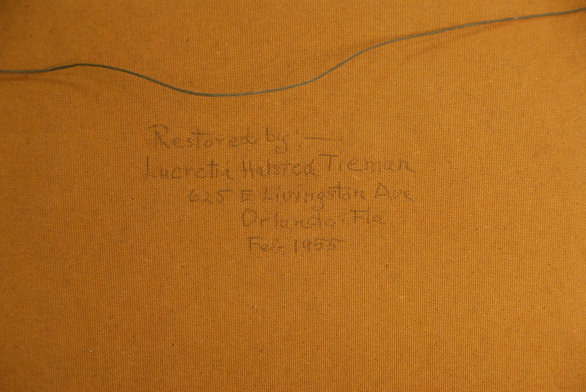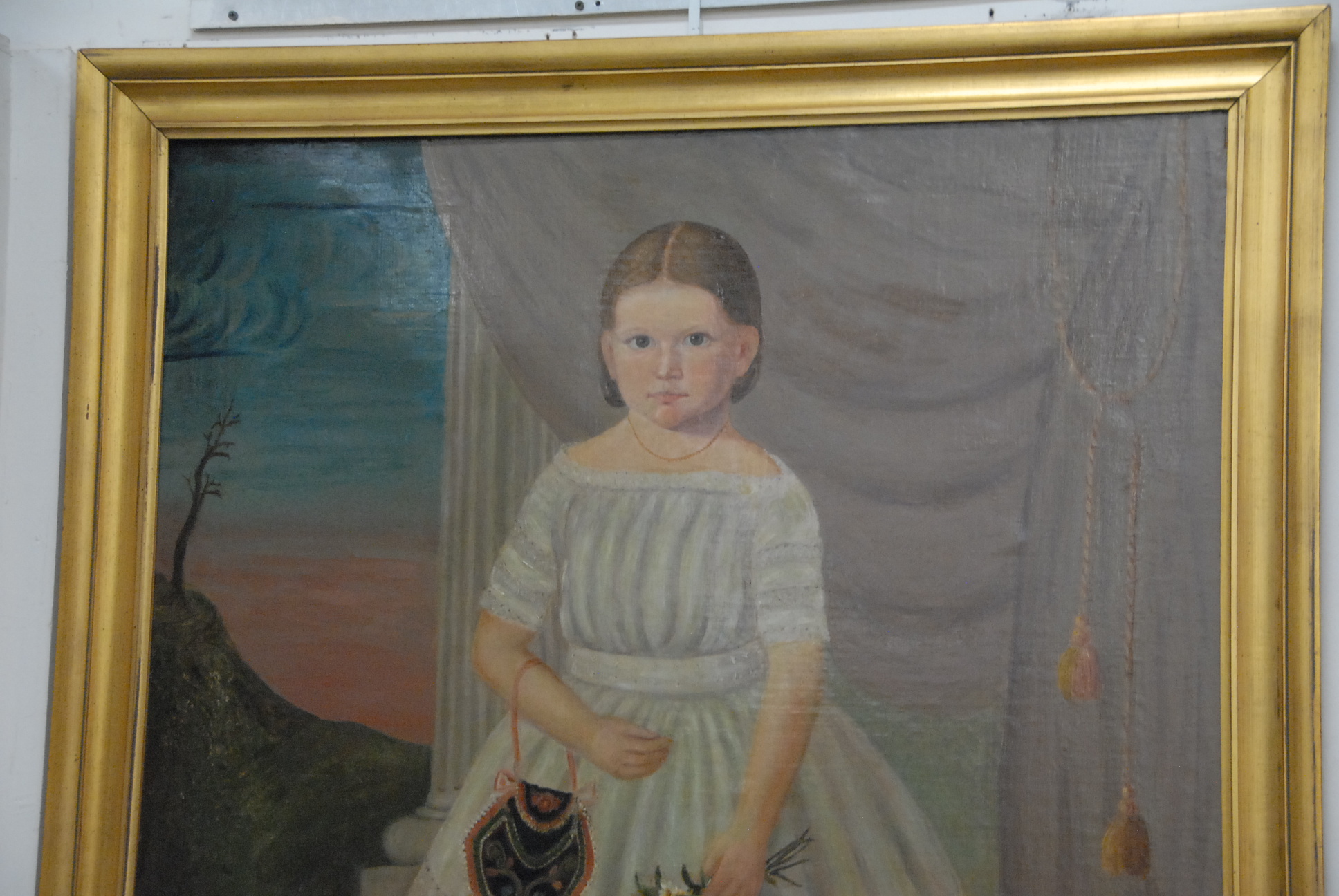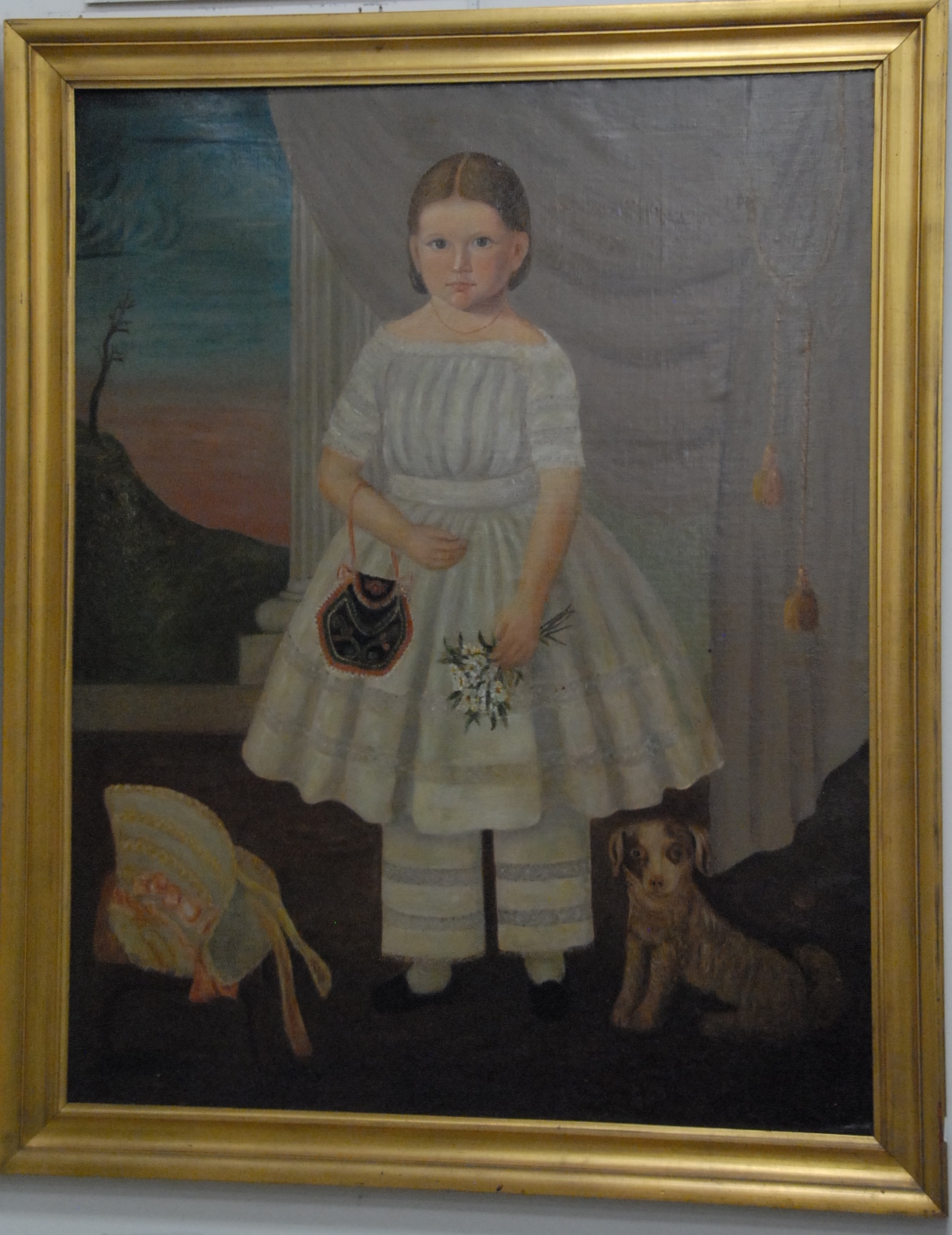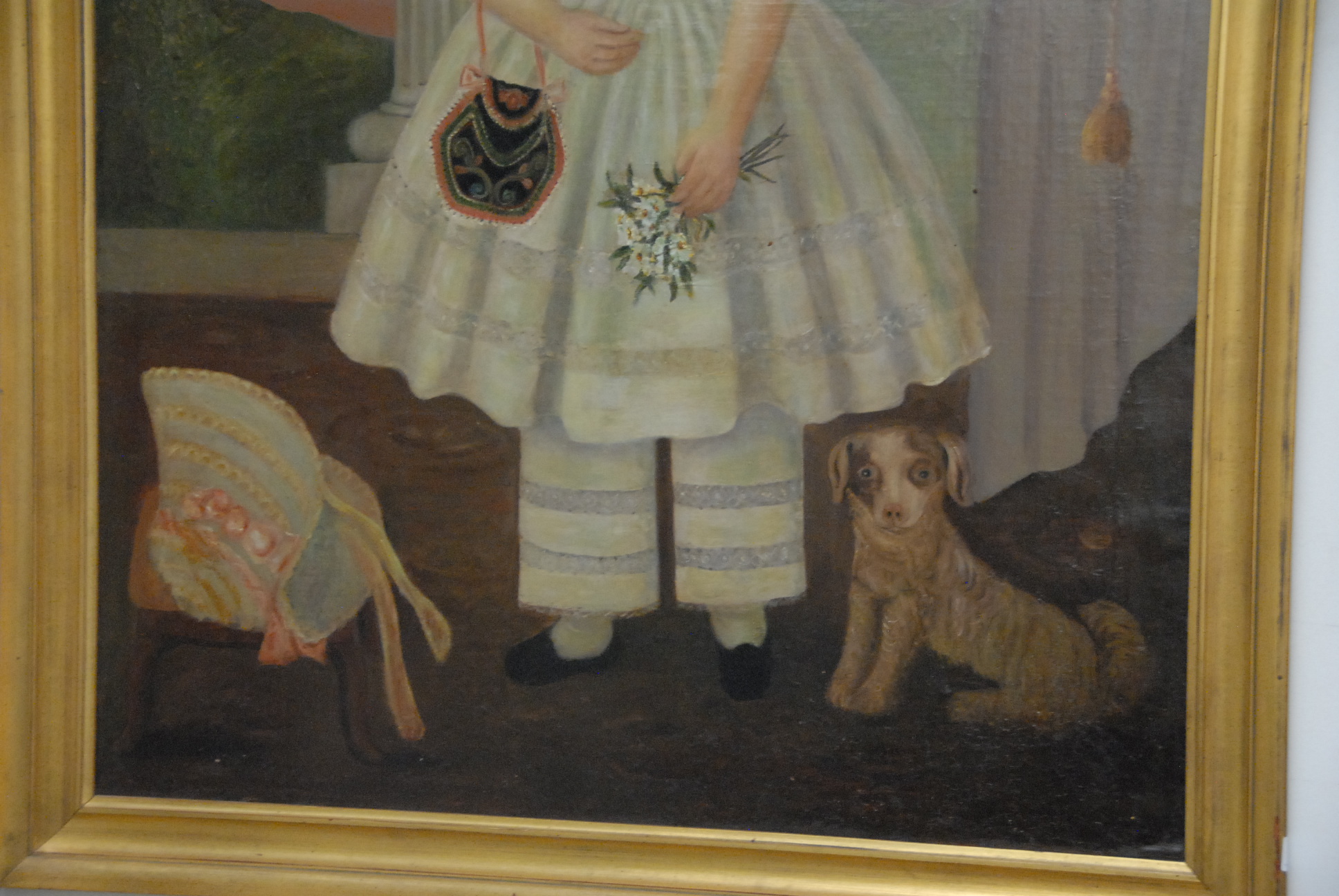 Lot 112: PORTRAIT OF A GIRL STANDING holding purse and flowers with dog oil on masonite unsigned 45 x 35 1/2