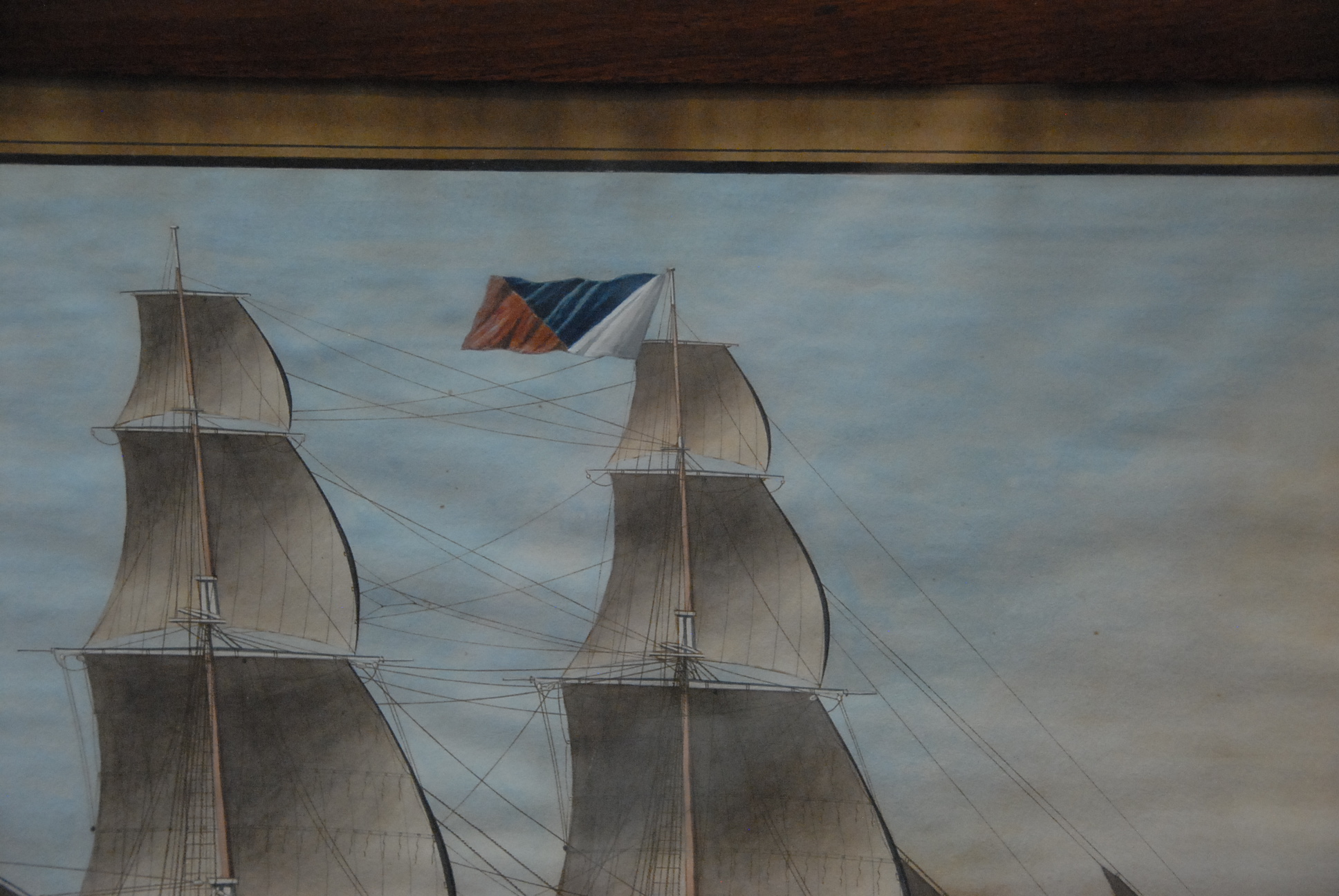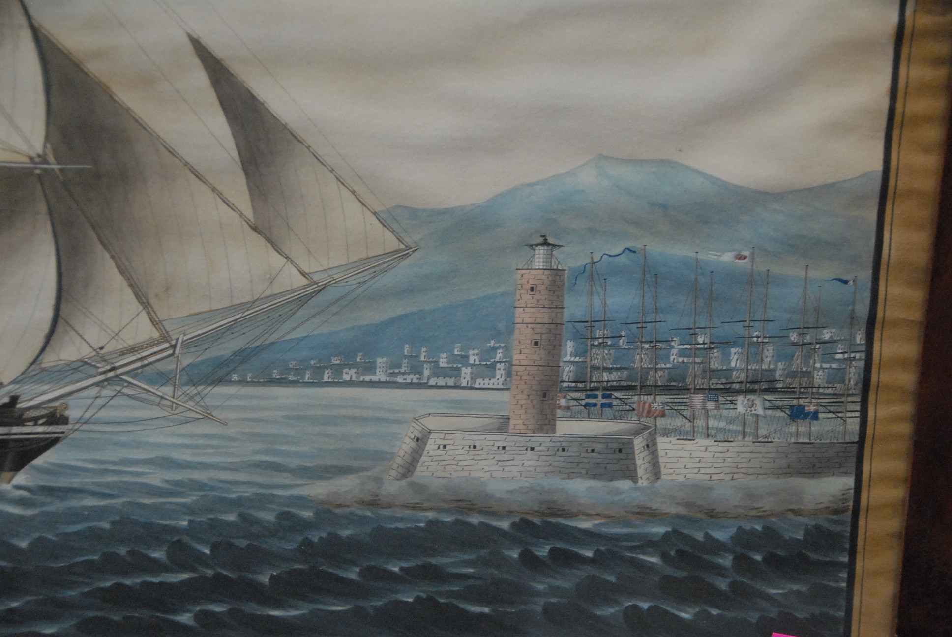 Lot 112: SHIP PORTRAIT FALCON. I. SOMES PALERMO. NOV. 1827 watercolor, this two masted schooner entering Palermo Harbor from the left flying the flag of America. 16 1/2 x 23 sight size