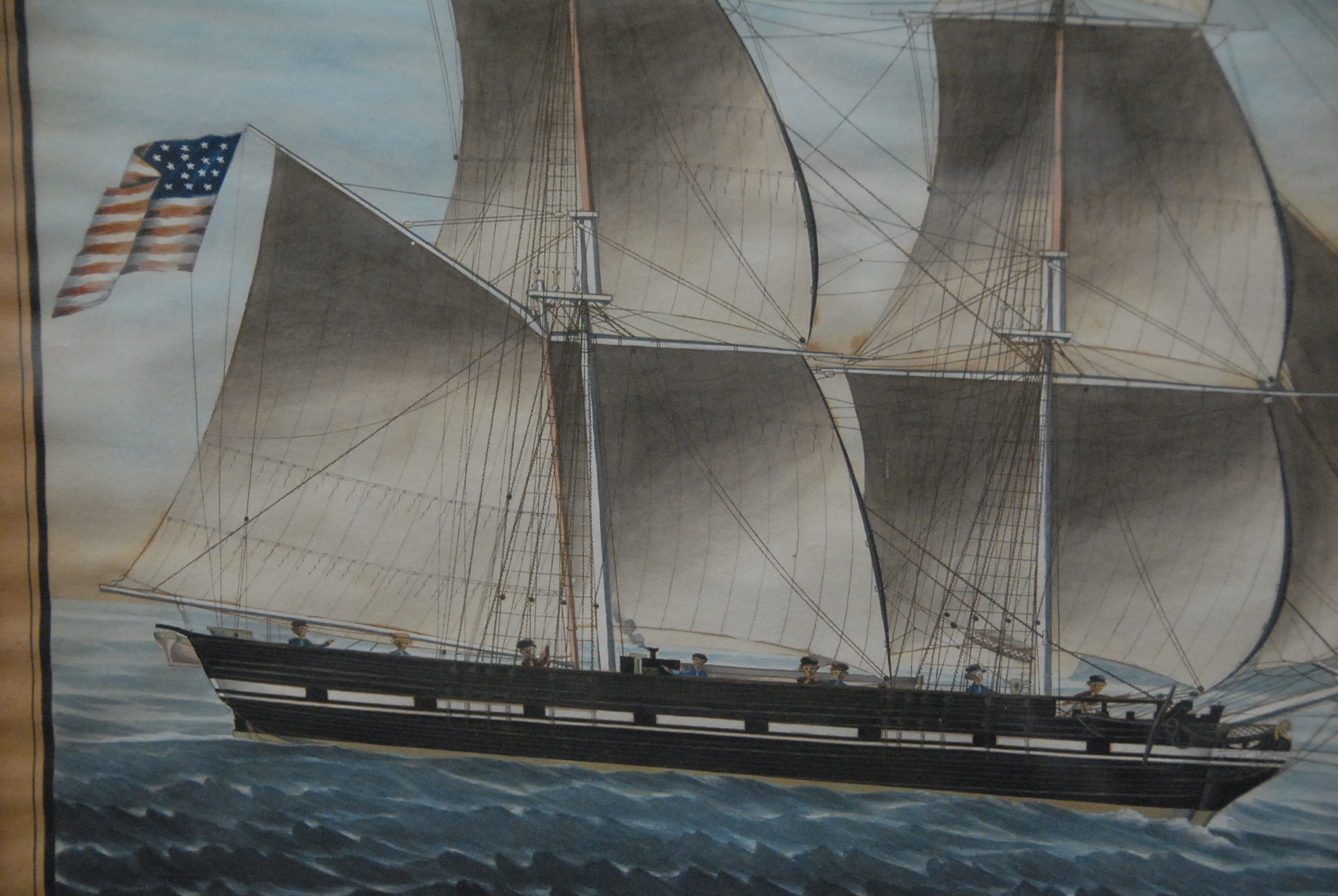 SHIP PORTRAIT FALCON. I. SOMES PALERMO. NOV. 1827 watercolor, this two masted schooner entering Palermo Harbor from the left flying the flag of America. 16 1/2 x 23 sight size