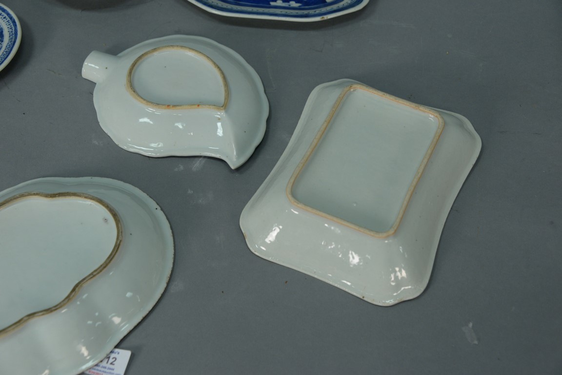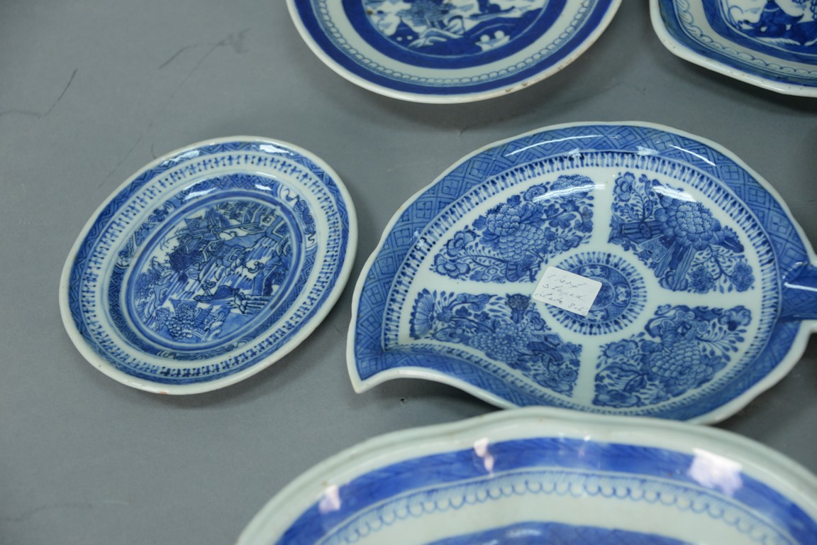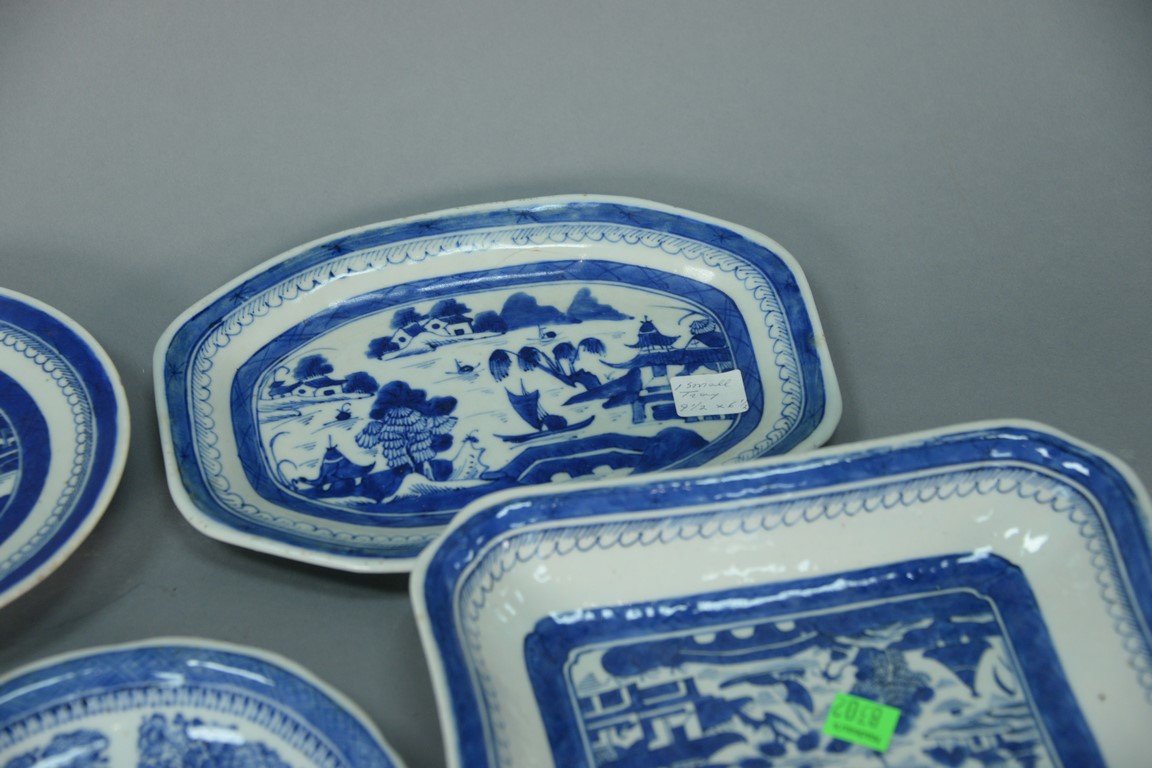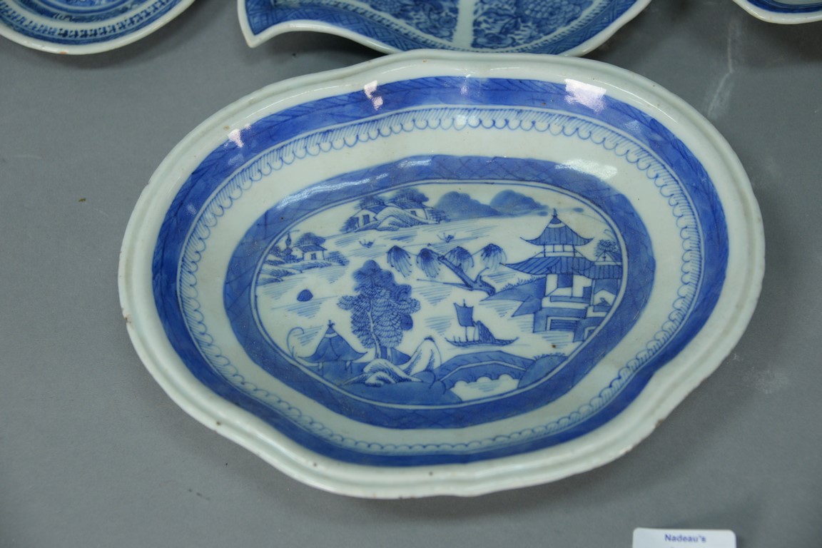 Six piece group of Chinese export porcelain blue and white Canton to include rectangular serving dish, oval tray, small oblong tray, leaf form dish, round footed dish, and small oval dish.