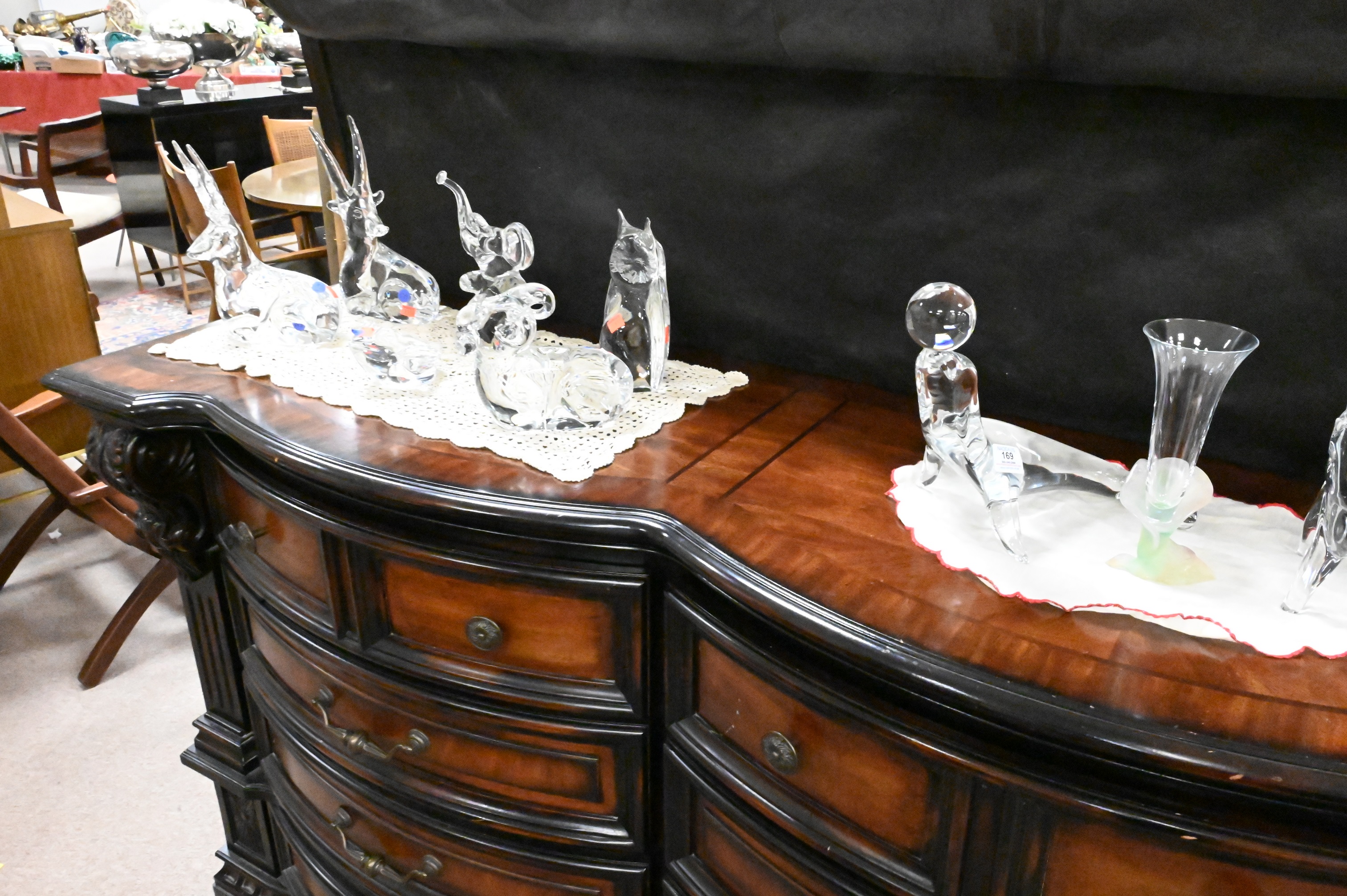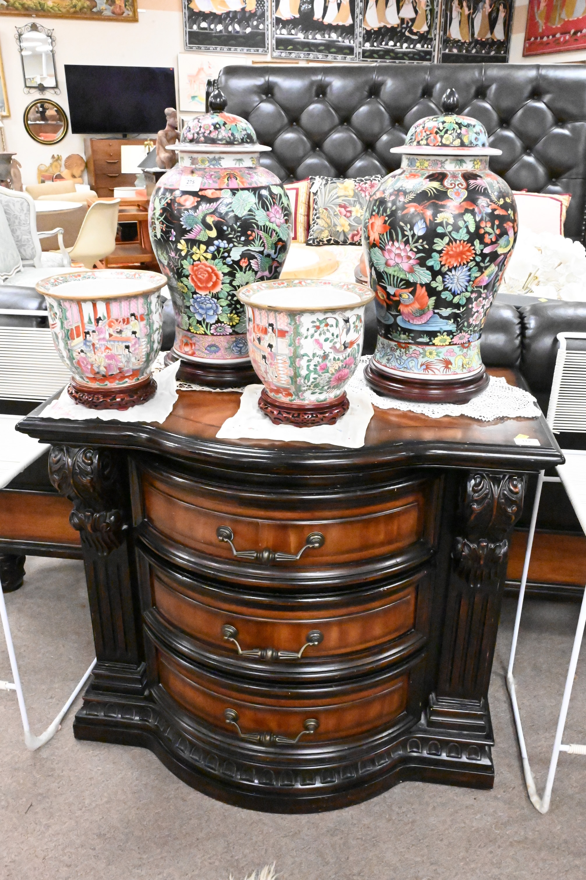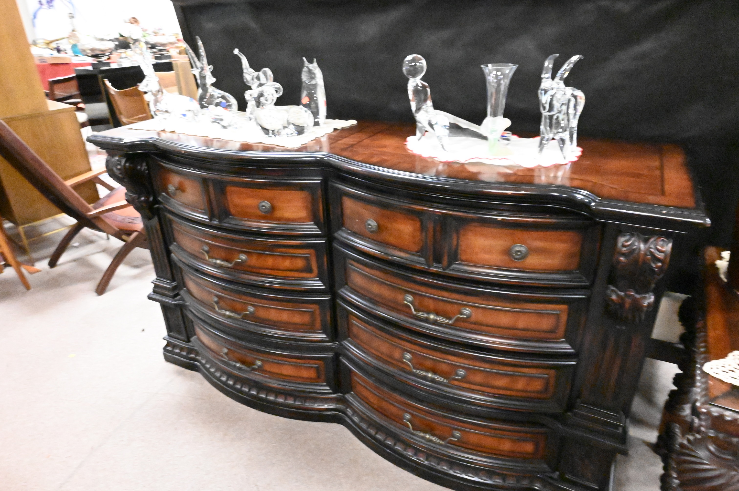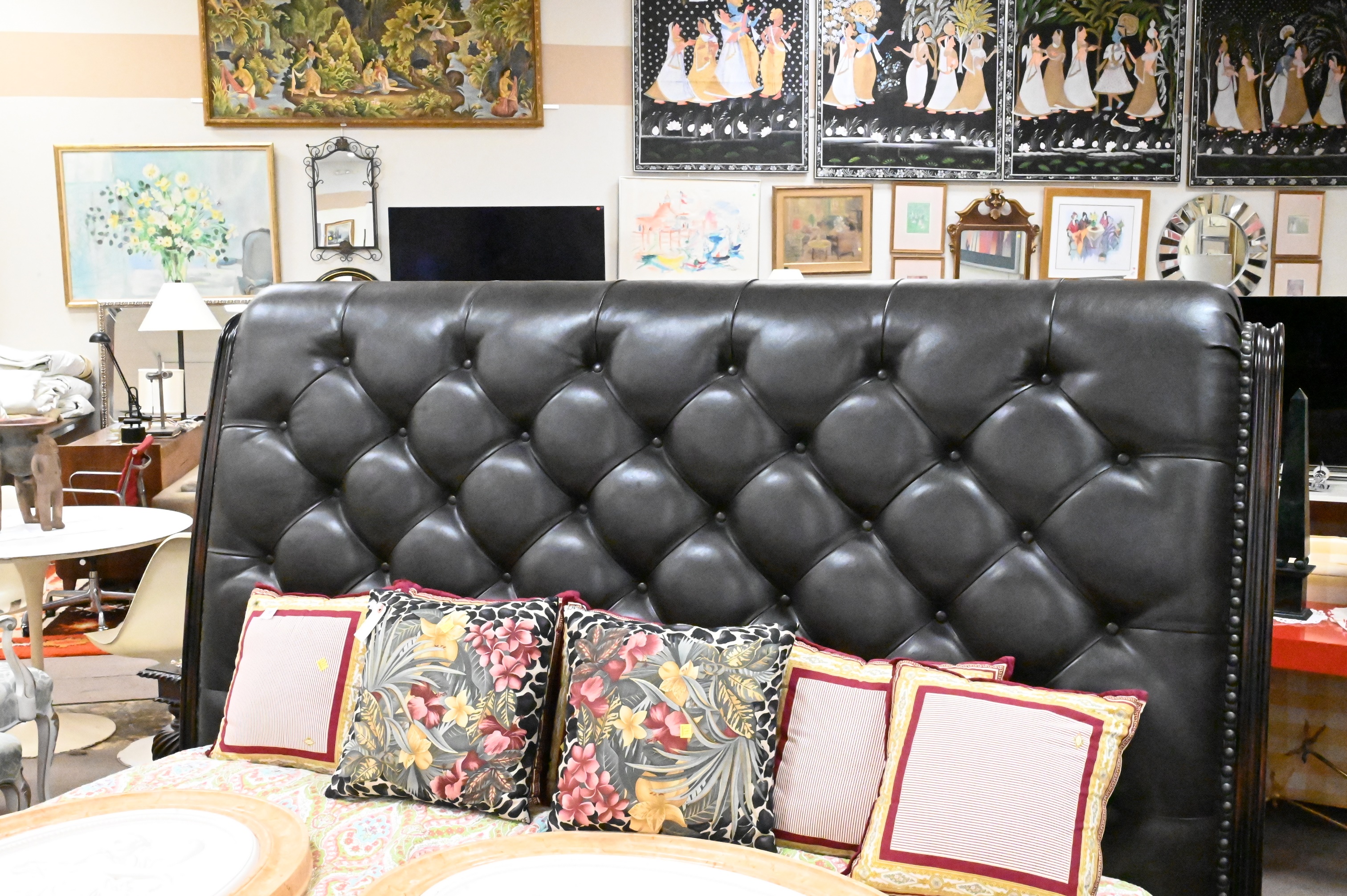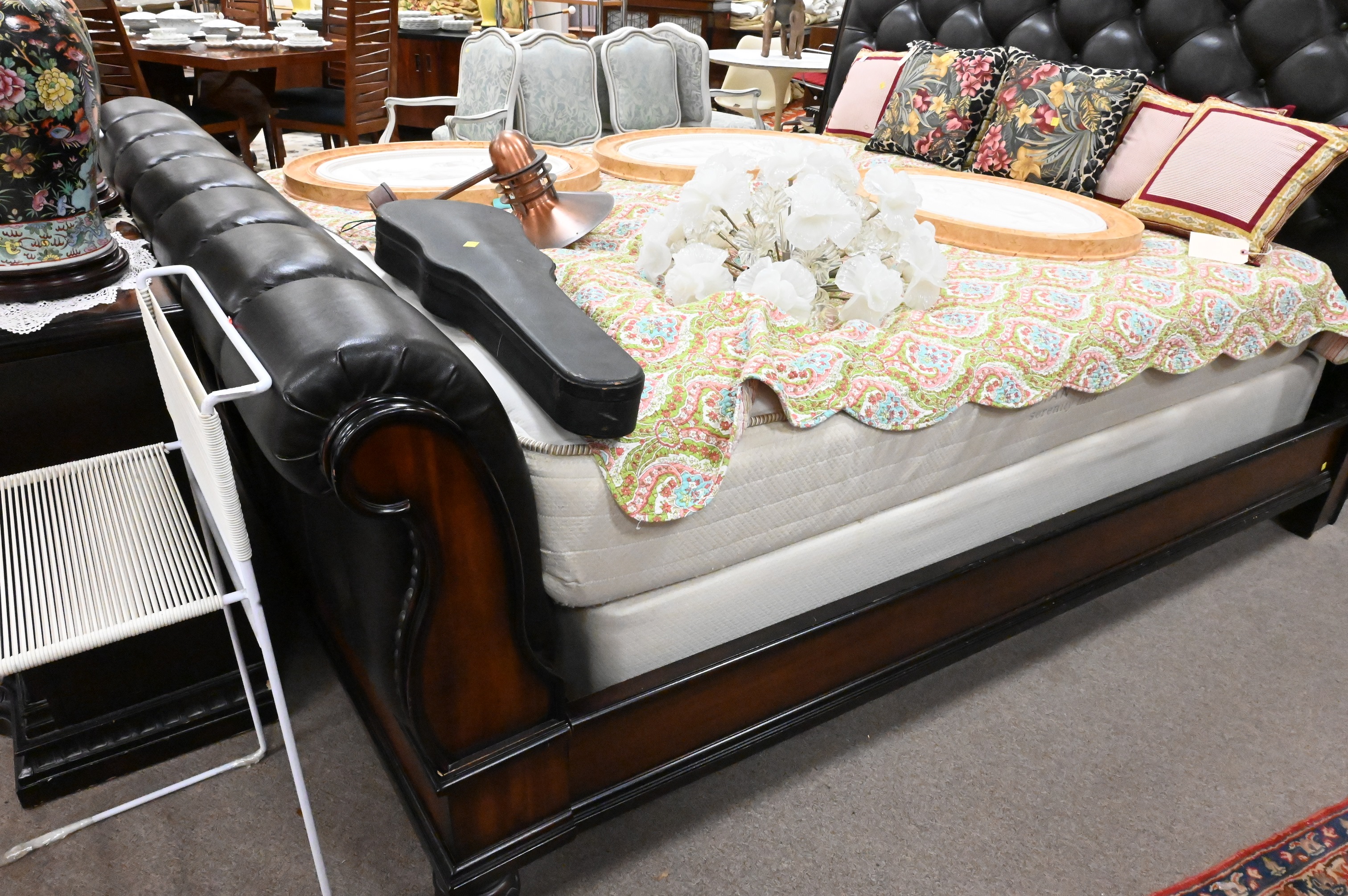 Three Piece Bedroom Set, to include a leather upholstered tufted king size sleigh bed, a night stand/chest, along with a triple chest, height 63 inches.