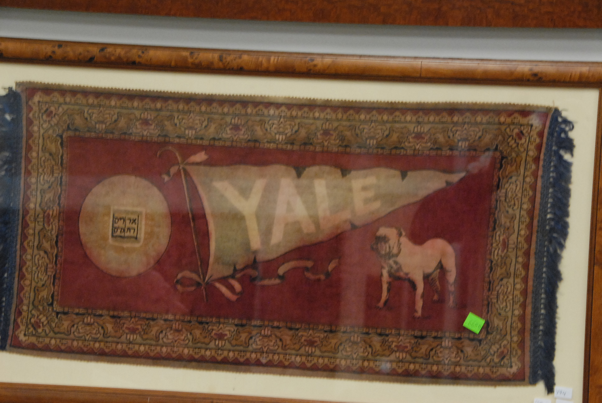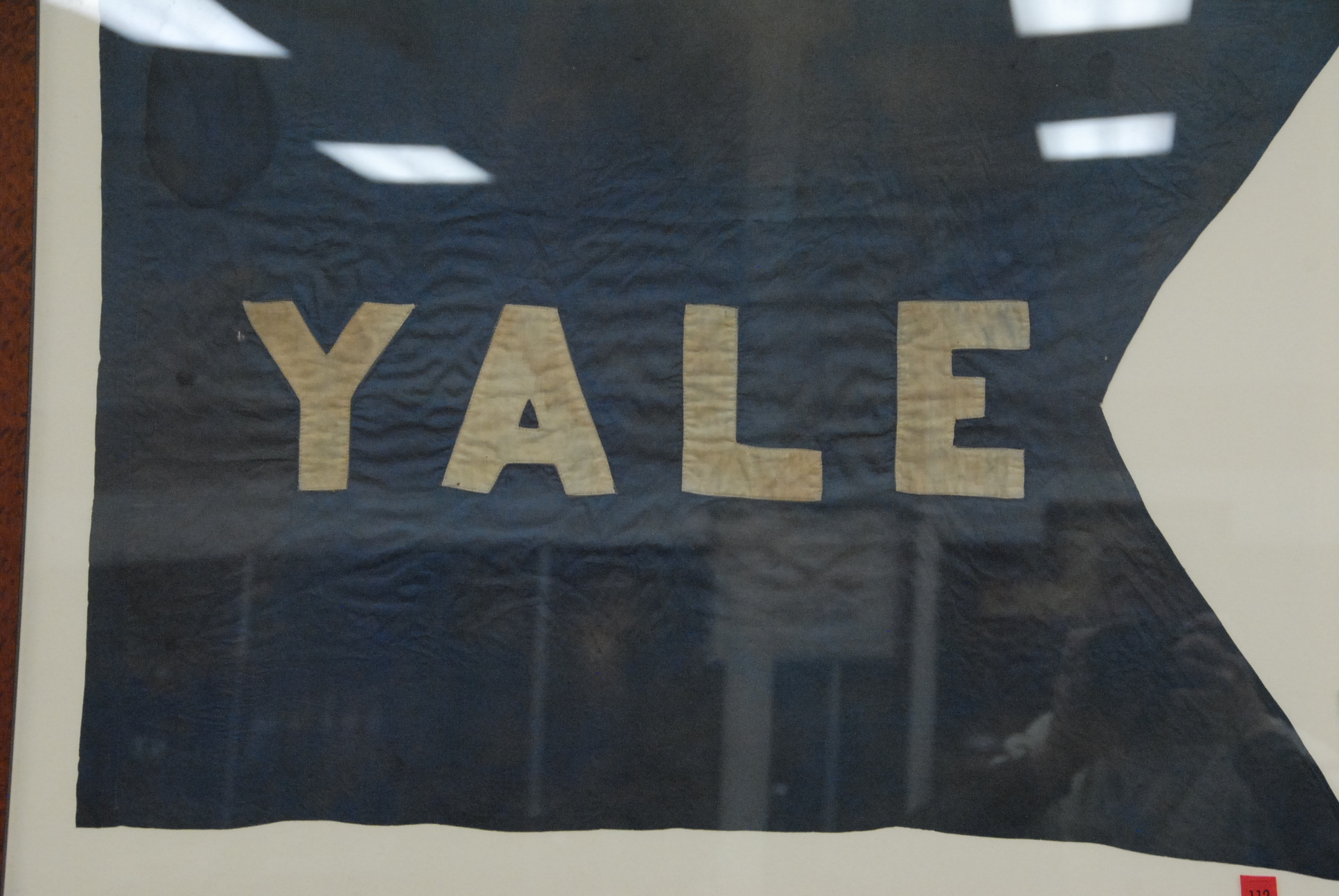 Lot 112: Two piece lot Yale guidon in blue silk with sewn white lettering circa1895-1899, framed and Yale large tobacco pennant 28 Murad 19…