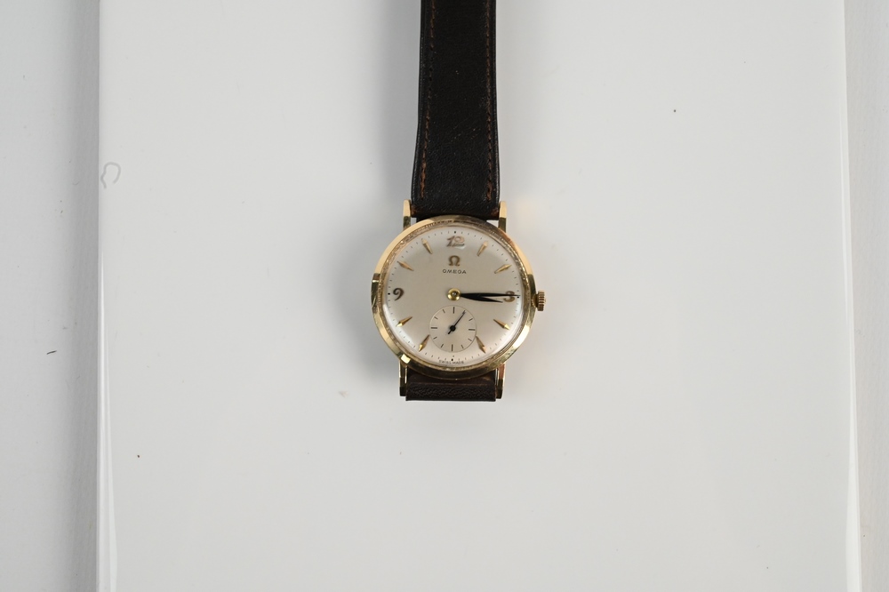 Lot 113: 14 Karat Gold Omega Vintage Mens Watch, having leather band.