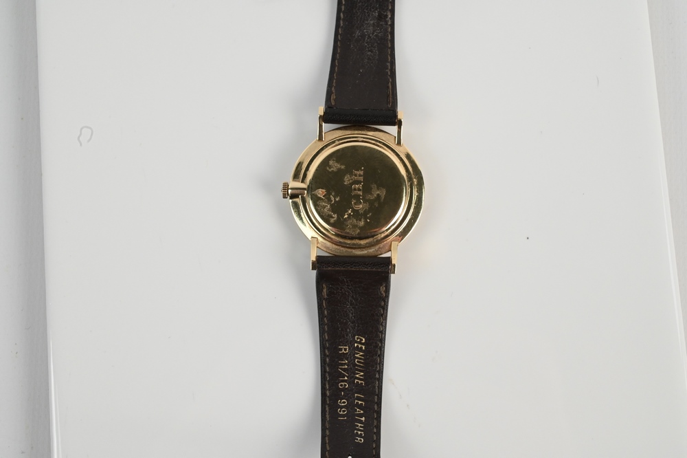 14 Karat Gold Omega Vintage Mens Watch, having leather band.