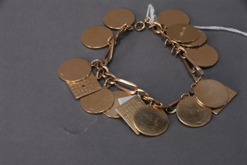 14K gold charm bracelet with charms, 67.8 grams.