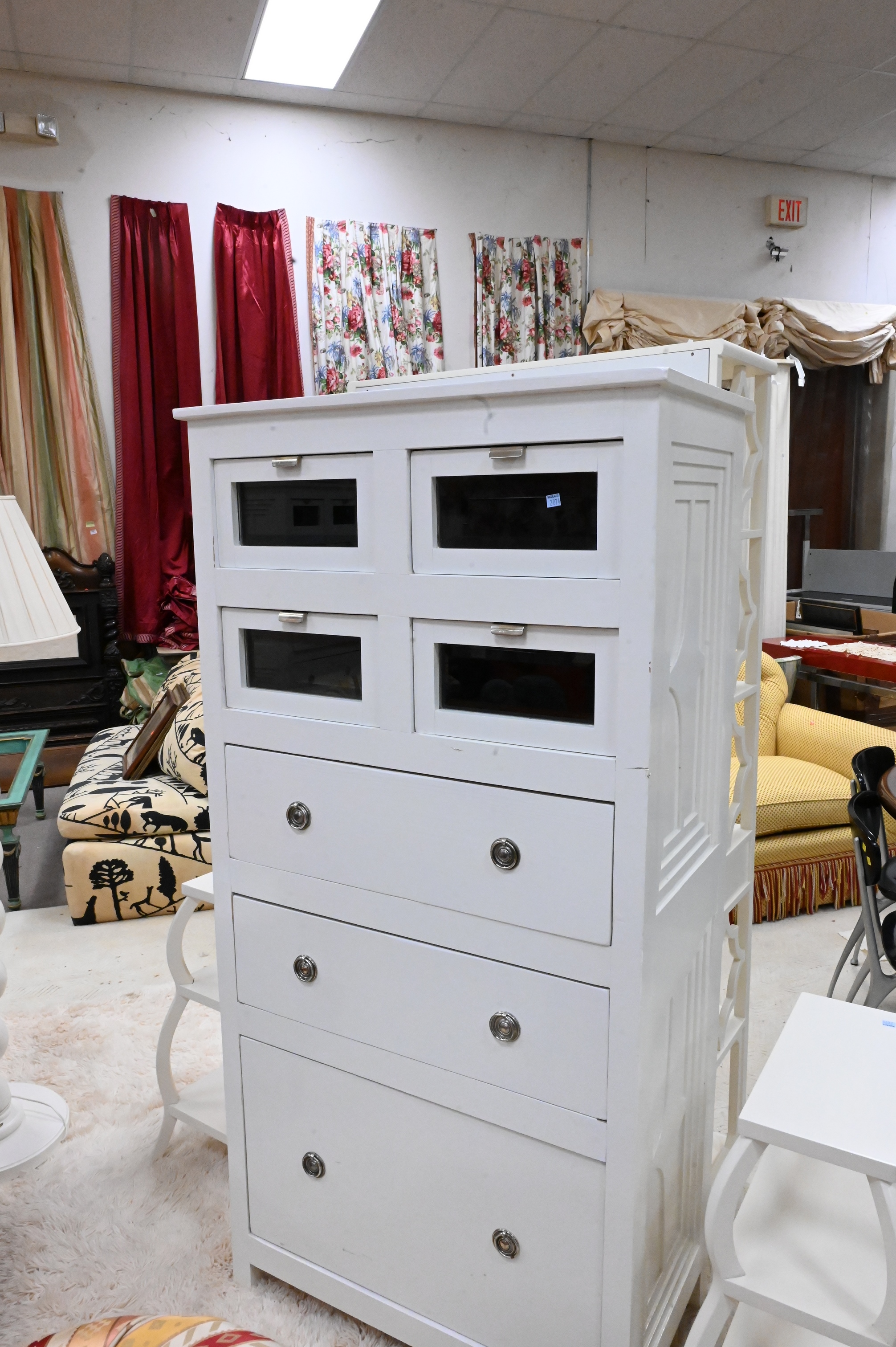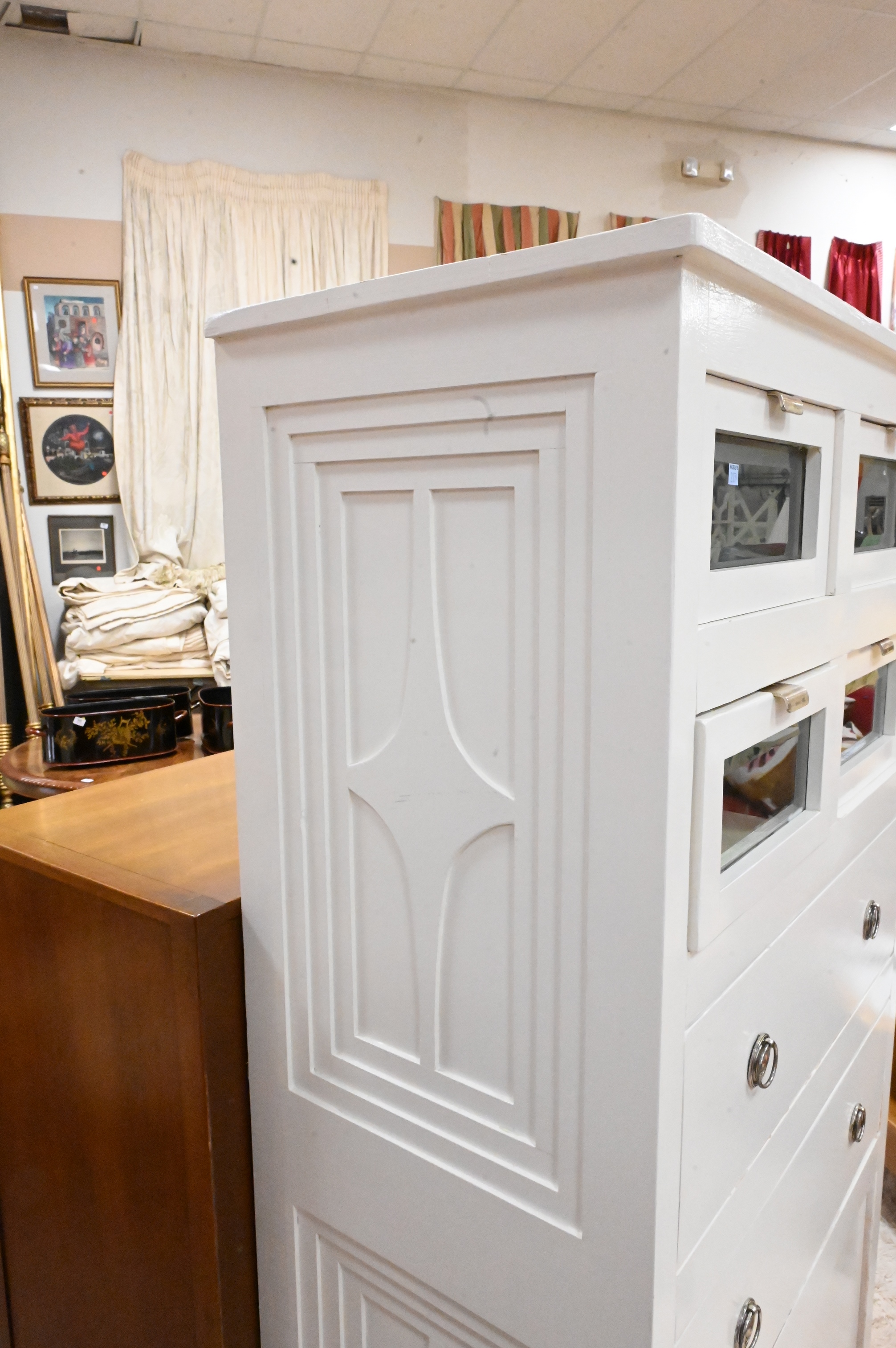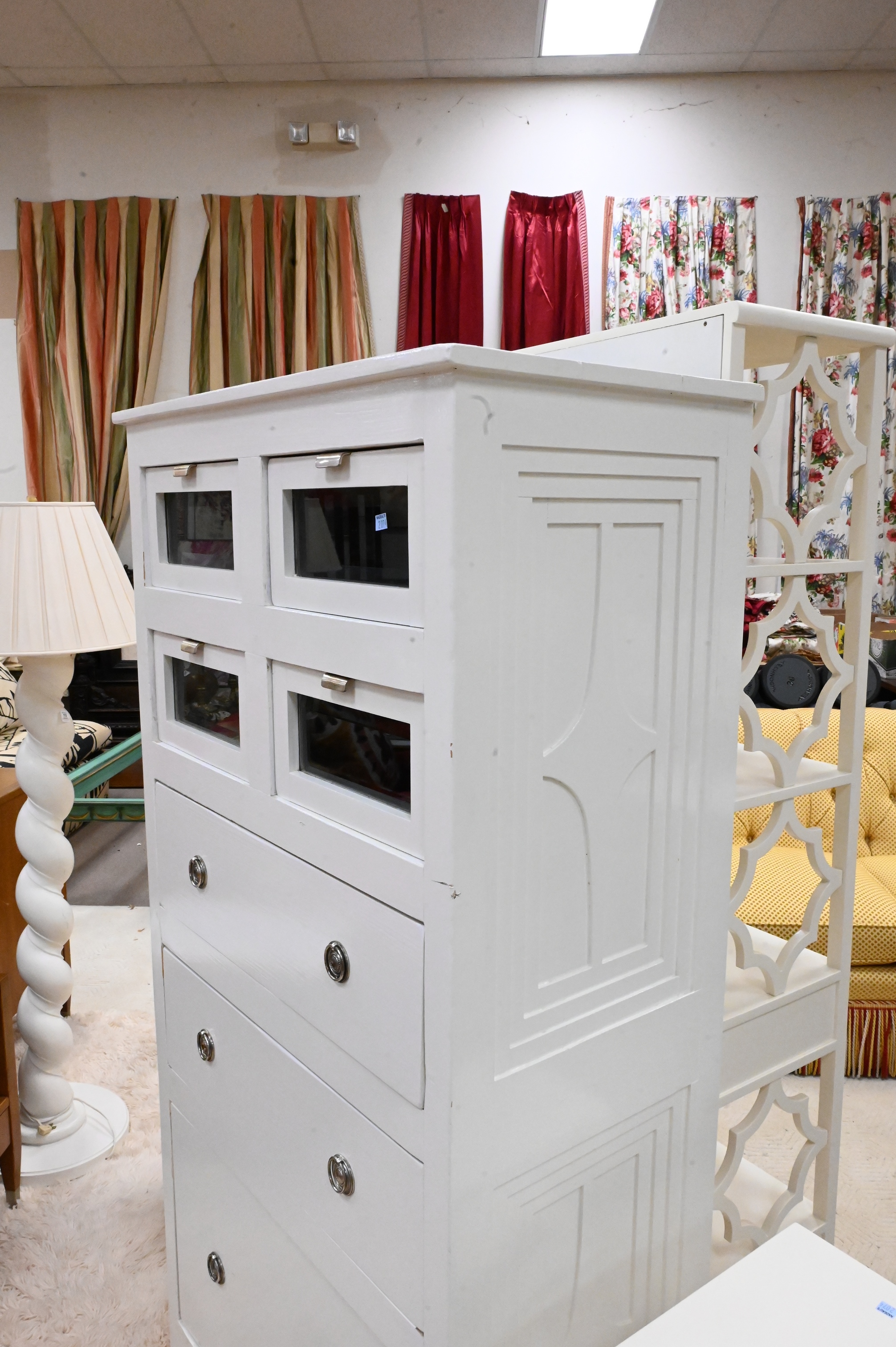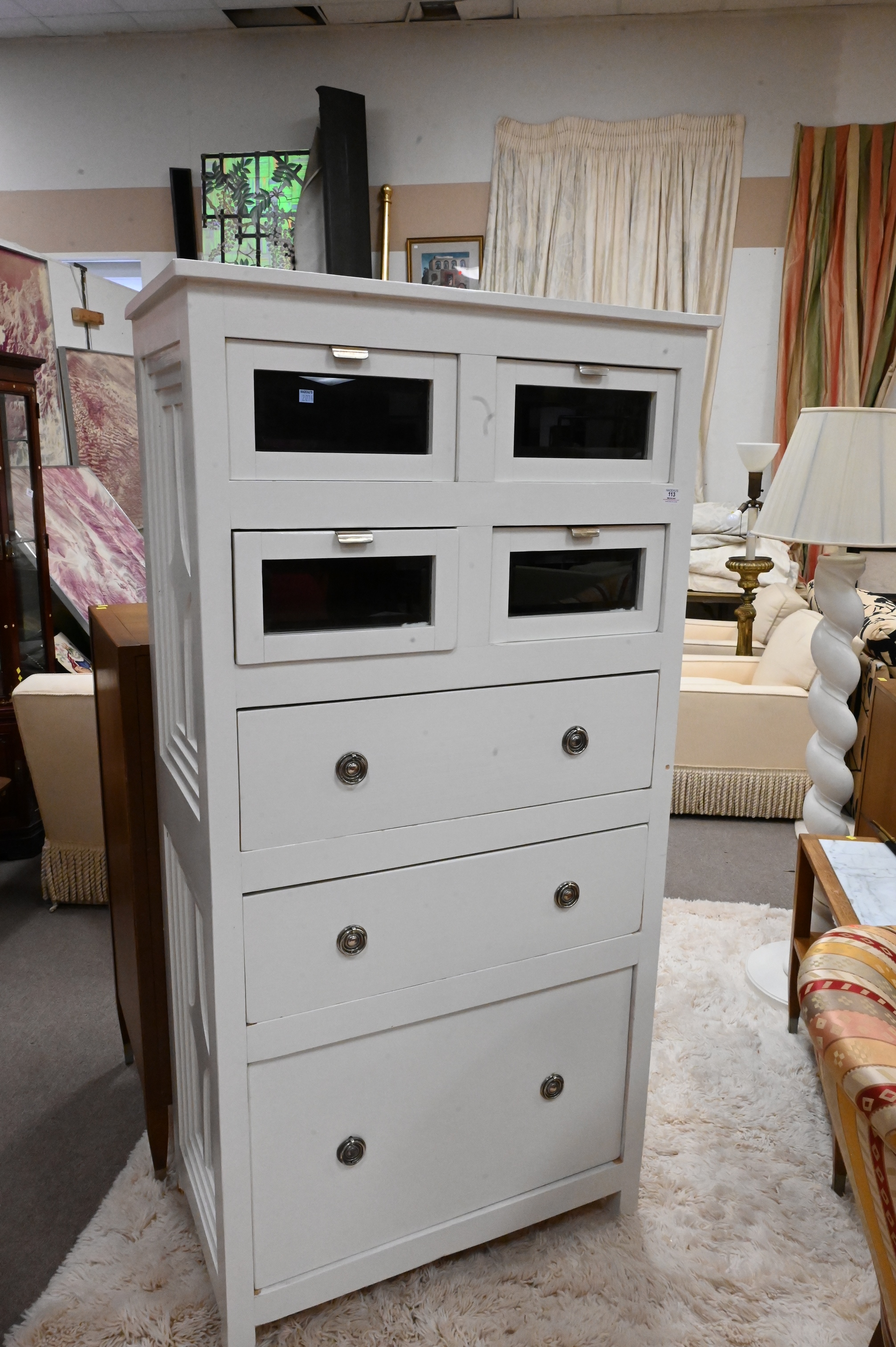 A Pair of White Painted Chests, having glass front top drawers, height 67 inches, top 18 1/2″ x 37″.