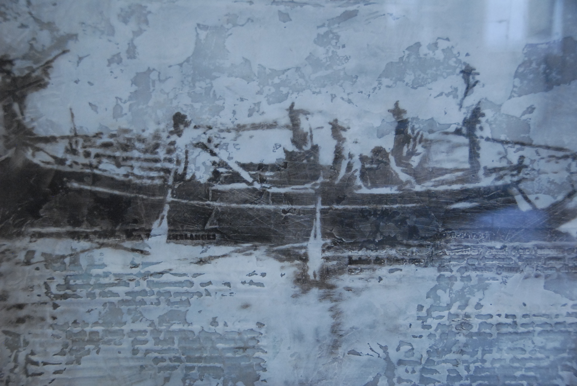 Lot 113: Abstract mixed media on cardboard unsigned having Delf Cadres d’Art label on reverse, 23 x 23.