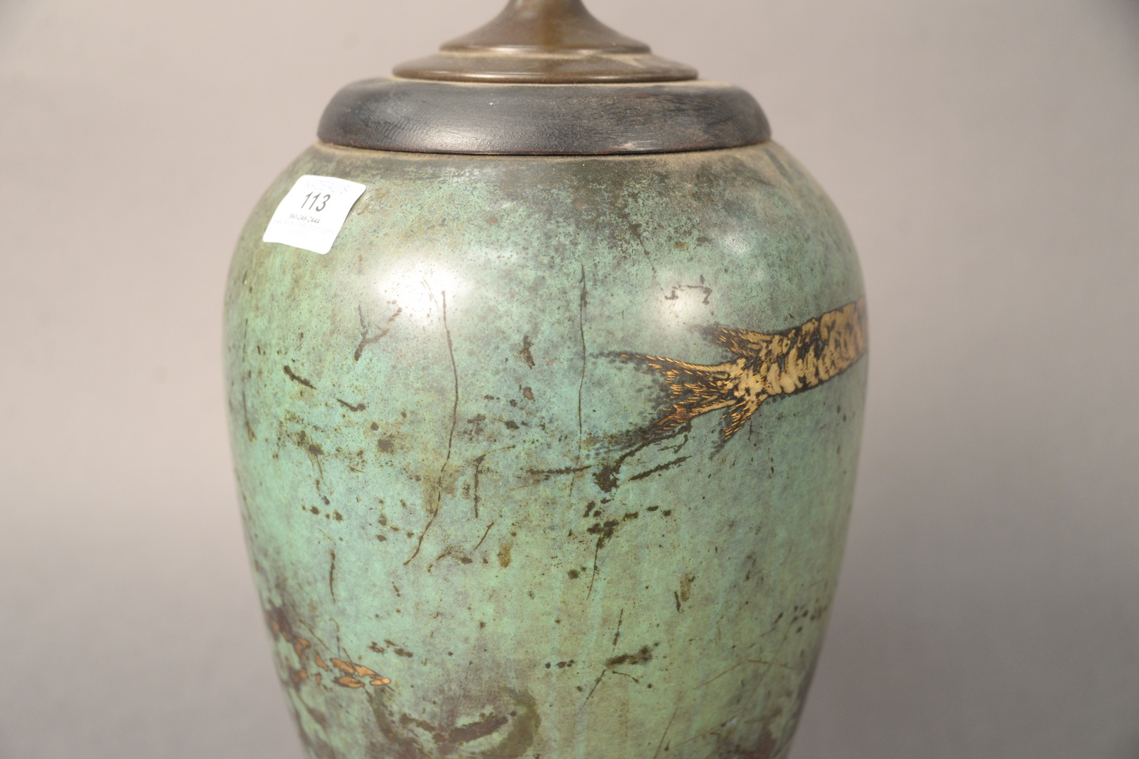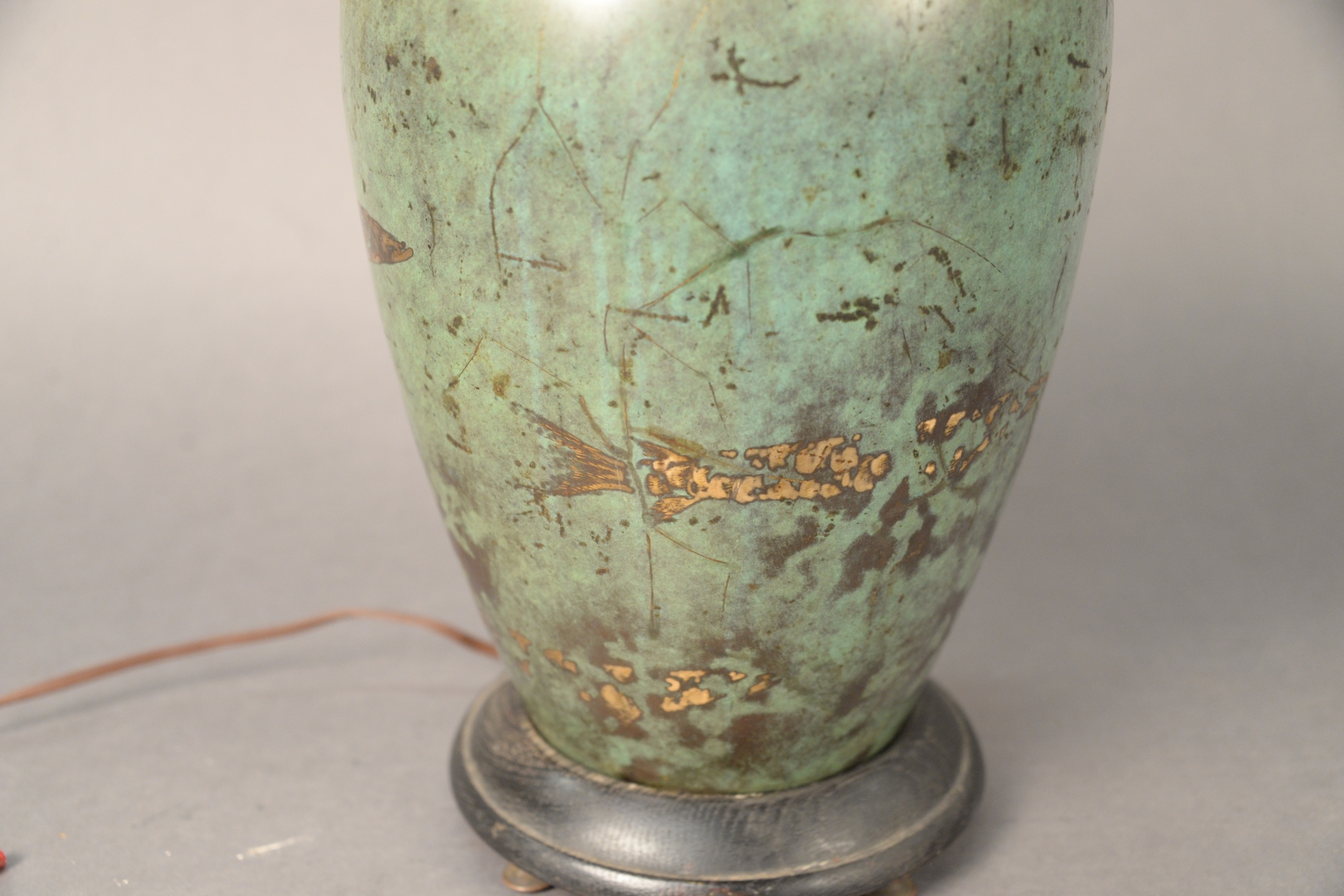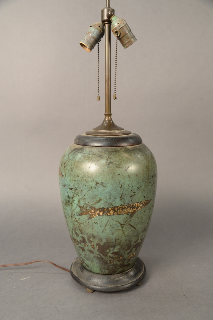 Lot 113: Arts and Crafts Patinated Copper Lamp, height 28 1/2 inches, height of vase 11 inches.