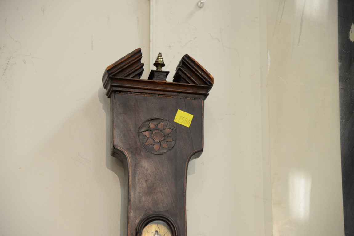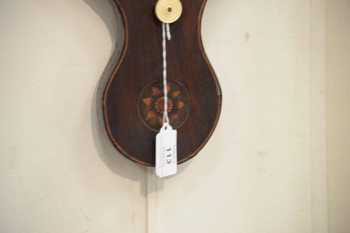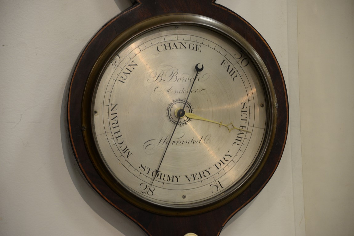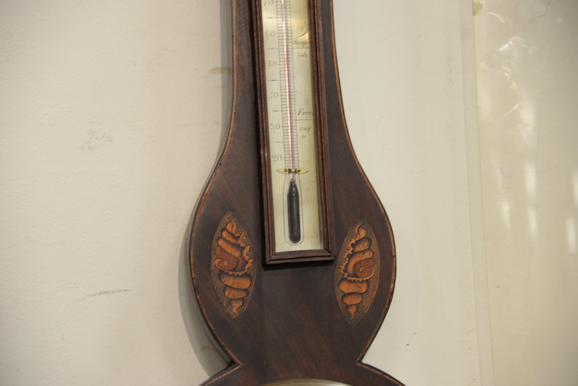 Lot 113: B. Bordoli wheel barometer having inlaid mahogany case with conch shell and sun inlay, dial marked B. Bordoli Andover Warranted. ht. 38 1/2 in. wd. 10 in.