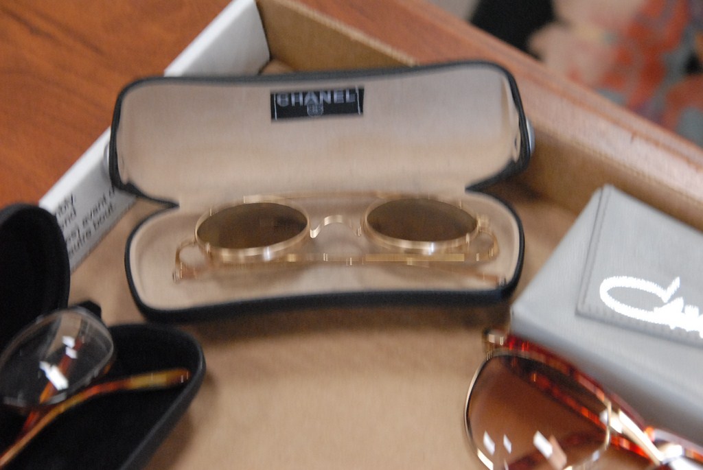 Lot 113: Box lot of five pairs of prescription glasses Chanel with sunglass attachment, three Gazelles, and Jean Lafont.
