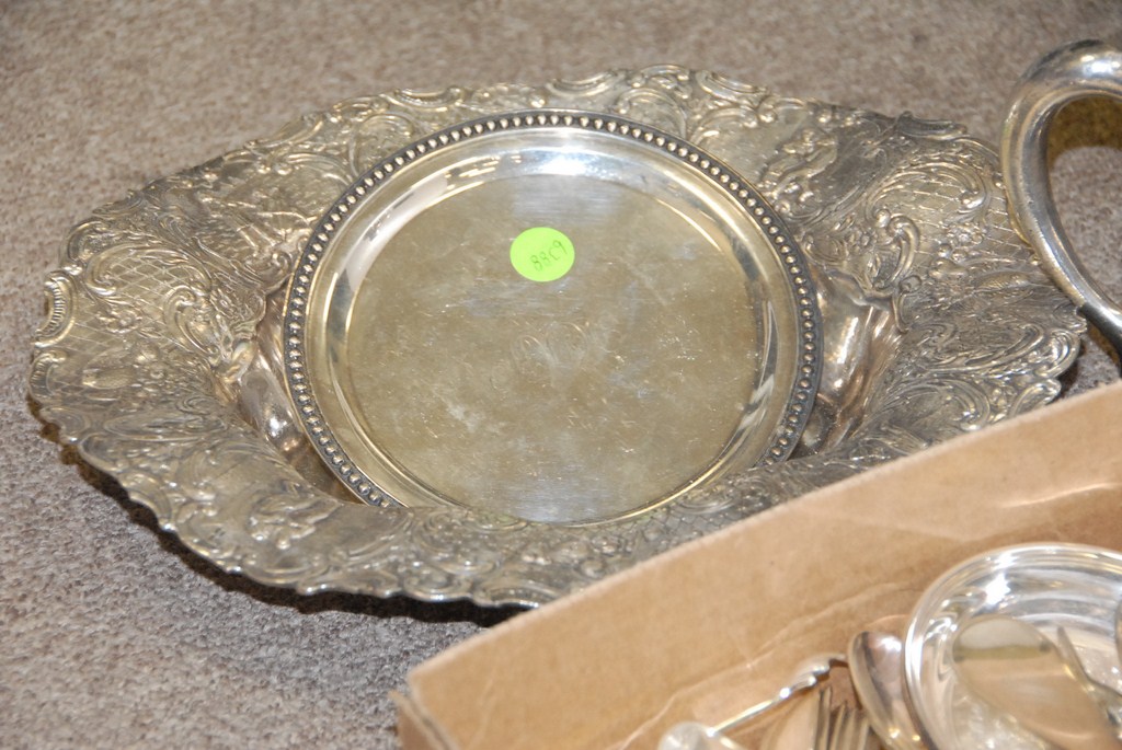 Box lot of silverplate four ladles, repousse style bowl, utensils, mug, etc.
