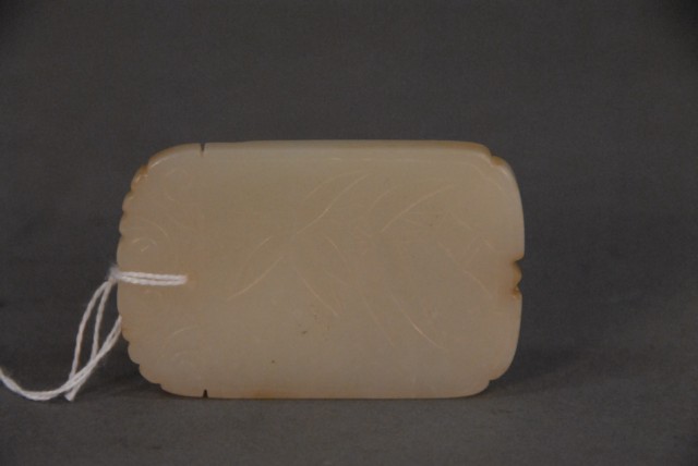 celadon jade pendent having incised bamboo and flower decorations on each side