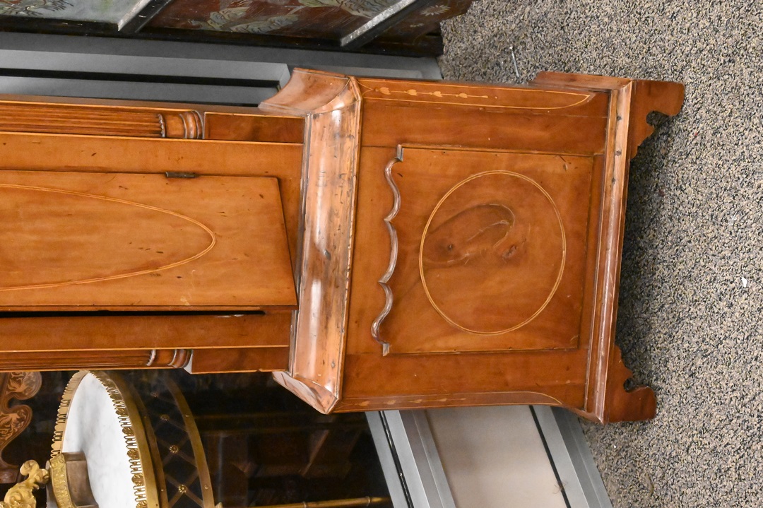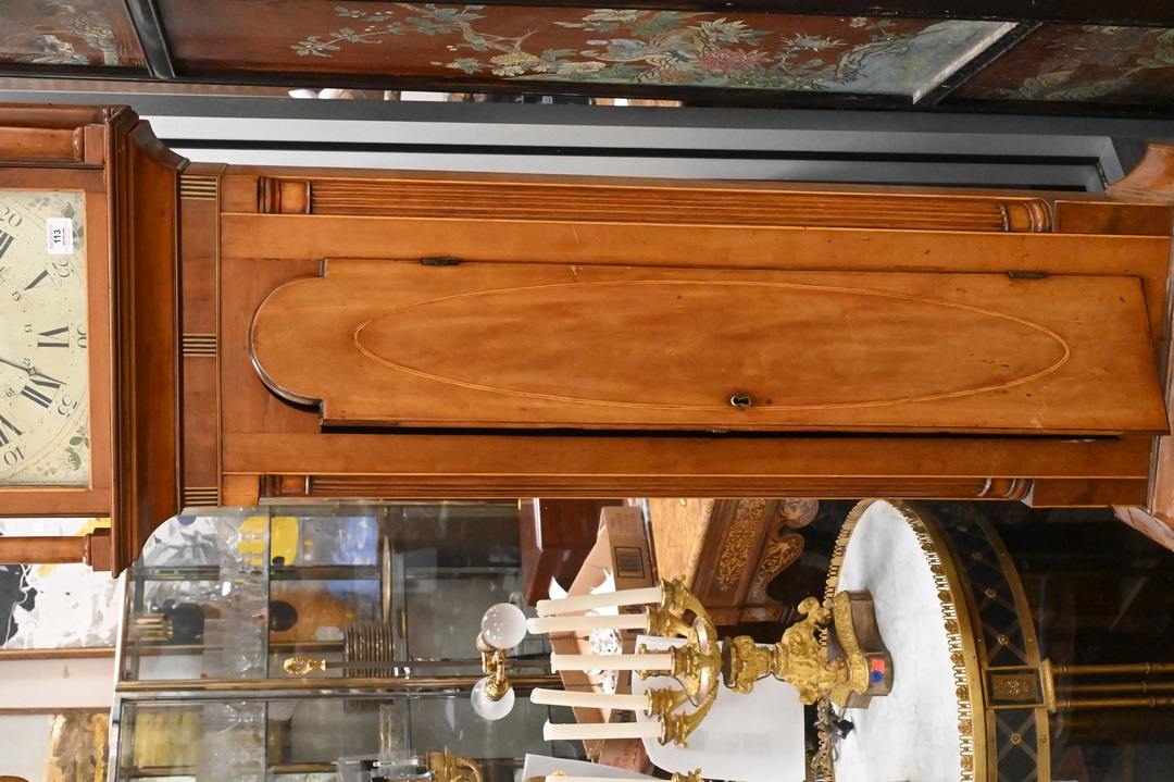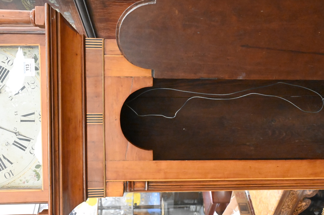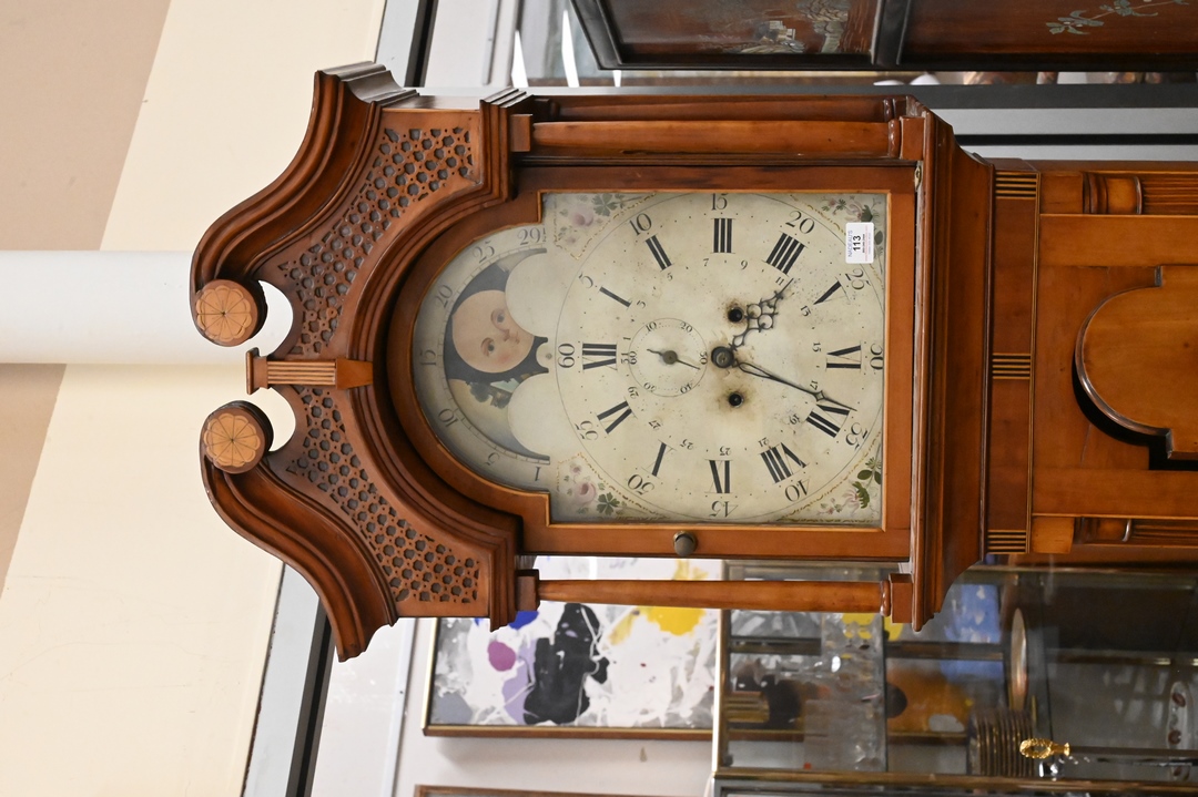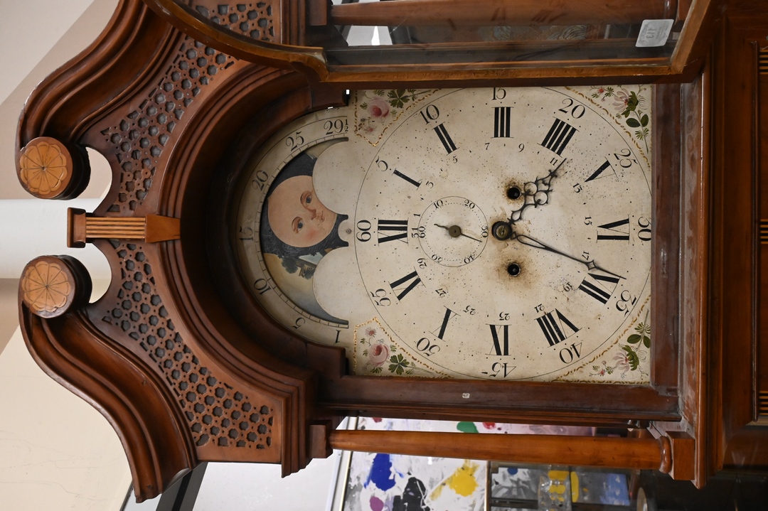 Chippendale Cherry Tall Case Clock, having inlaid rosettes above blind carved pediment, over tombstone door over arched top door, flanked by fluted quarter columns, line inlay on base with bellflower inlays, on bracket base, enameled metal dial with moon phases and brass works, probably Pennsylvania, 18th century, height 96 inches.