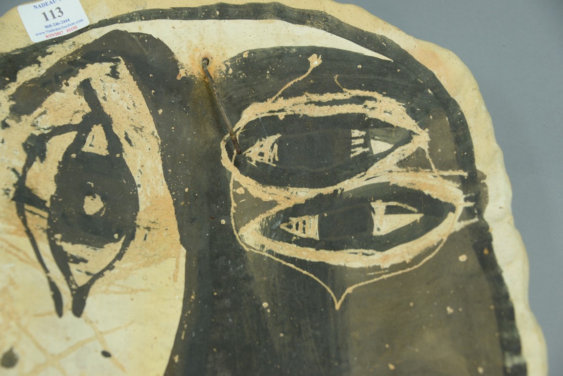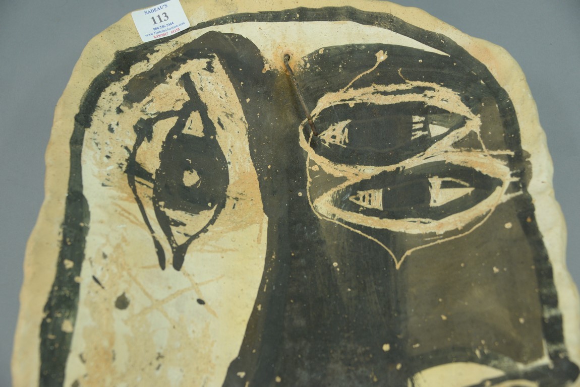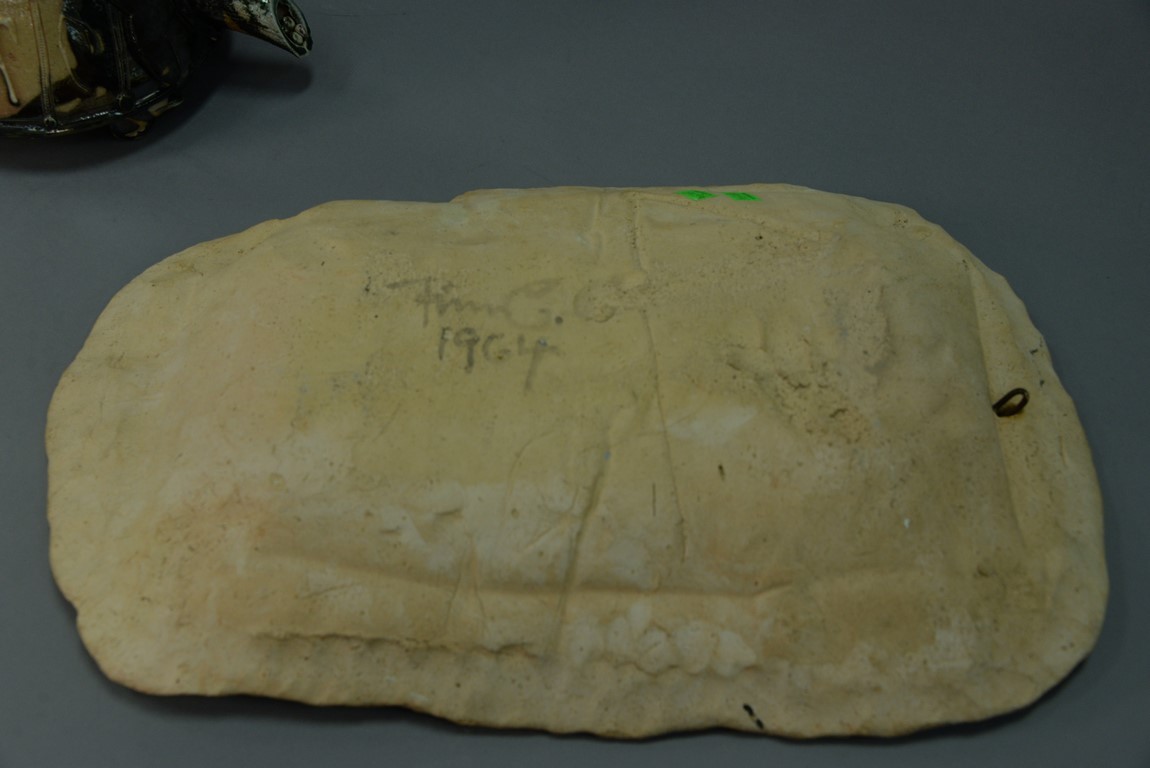 Lot 113: Clay plaque in the style of Picasso, signed illegibly on verso 1964. ht. 20 1/2in., wd. 13 1/2in.