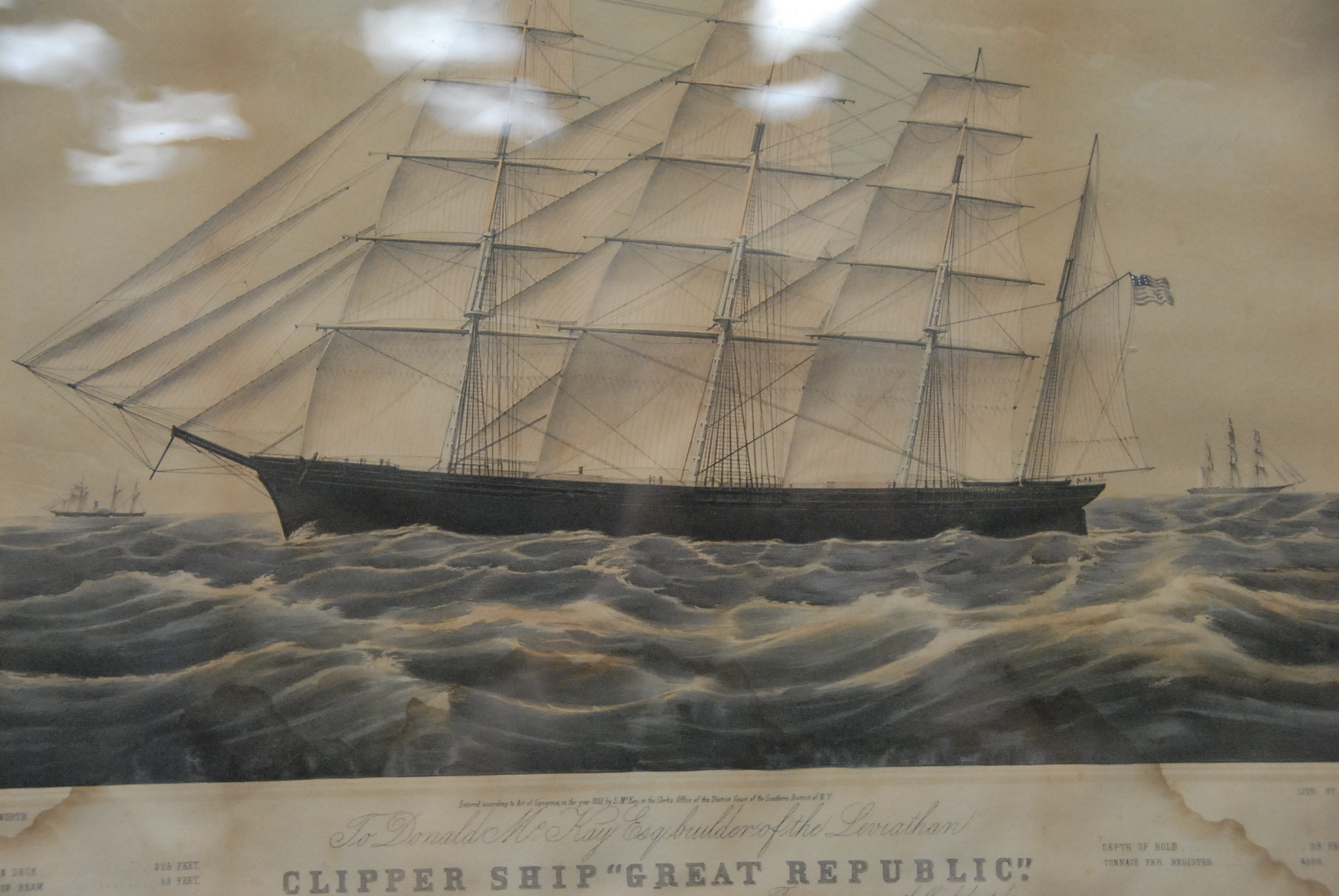 Lot 113: Clipper Ship GREAT REPUBLIC lithograph marked lower left Painted by J. F. Butterworth marked lower right Lith By N. Currier NY marked bottom center To Donald M. Kay Esq, builder of the Leviathan Clipper Ship Great Republic water staining bottom ce