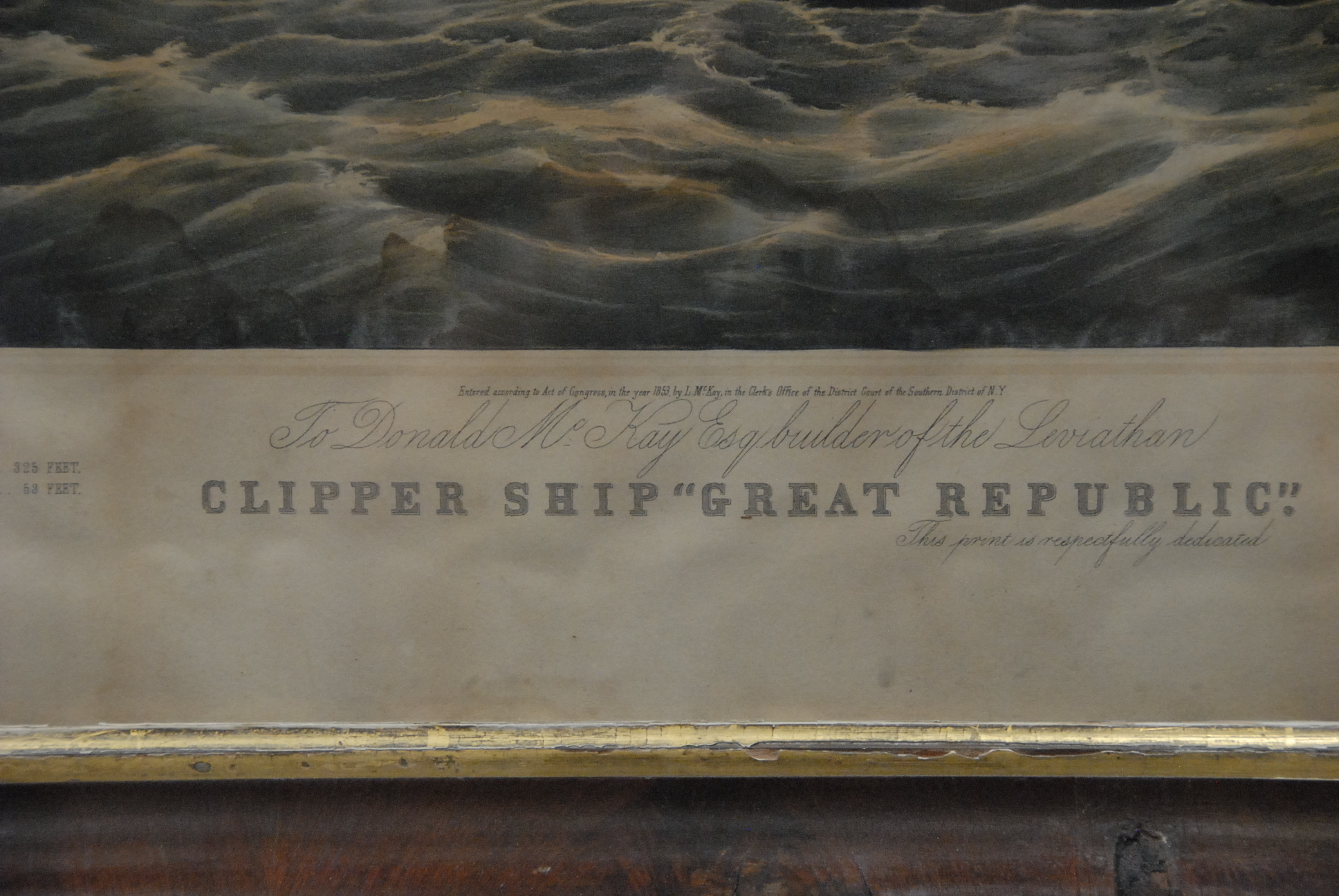 Clipper Ship GREAT REPUBLIC lithograph marked lower left Painted by J. F. Butterworth marked lower right Lith By N. Currier NY marked bottom center To Donald M. Kay Esq, builder of the Leviathan Clipper Ship Great Republic water staining bottom center 16 x 23 sight size