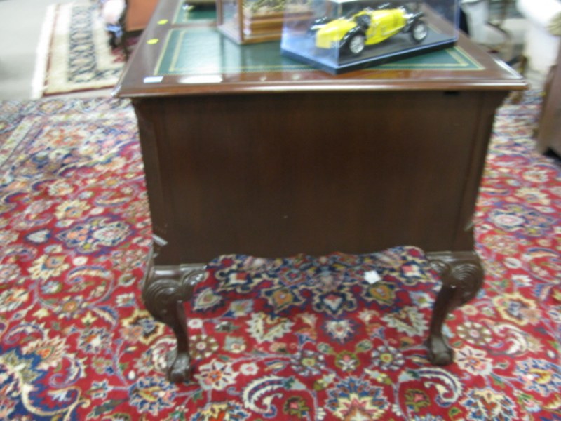 Contemporary mahogany Chippendale style desk with leather top, and ball and claw feet.