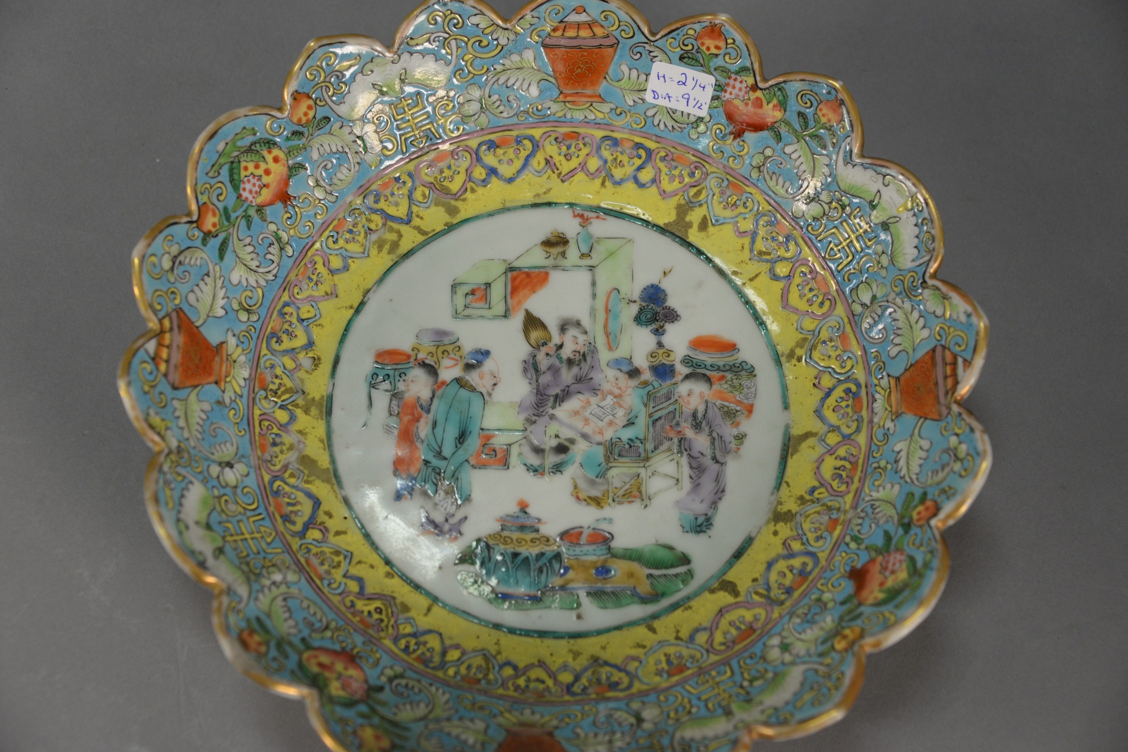 Lot 113: Famille Verte dish having scalloped border depicting pomegranate, bats, and covered urns, 19th century or earlier one small chip on…
