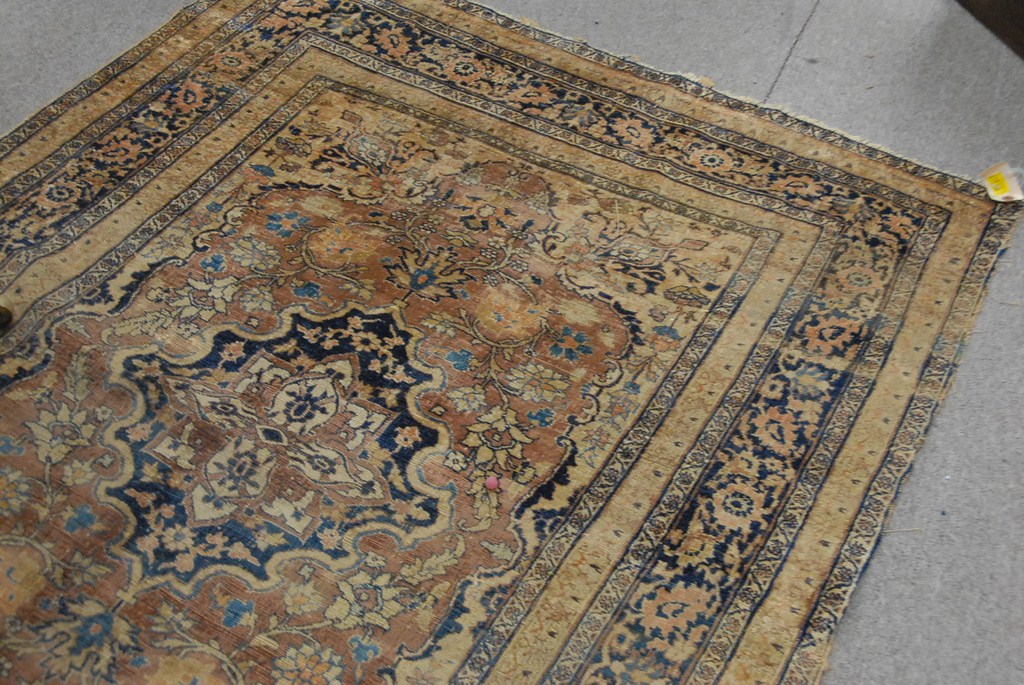 Lot 113: Farahan Sarouk Oriental rug worn, edge problems, small hole, 3’9 x 5’3, late 19th – early 20th century.