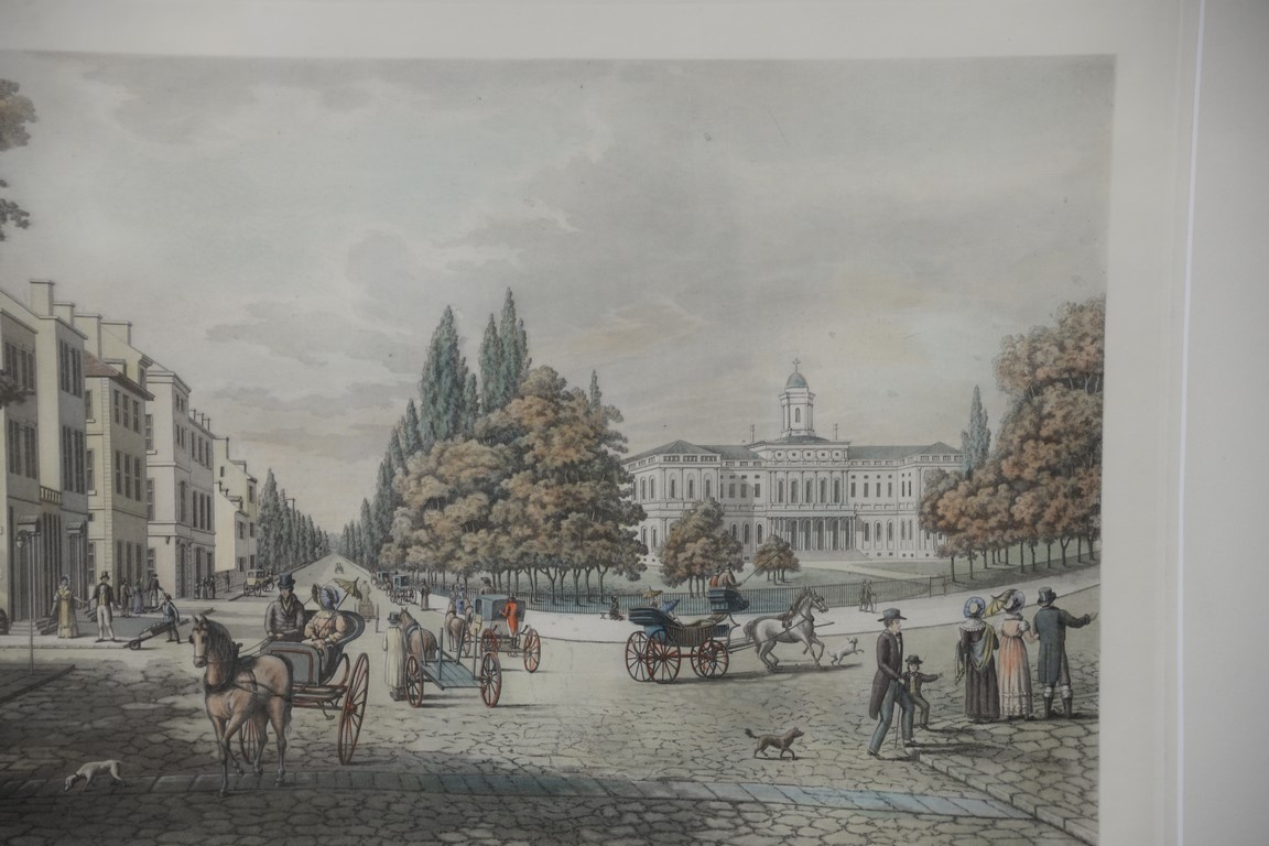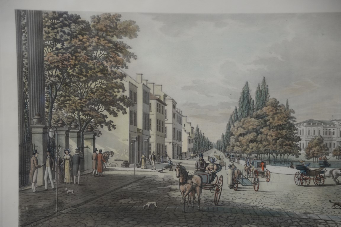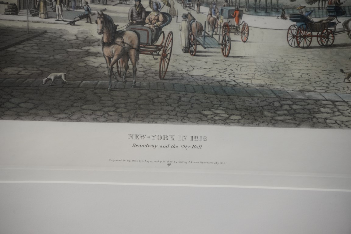 Louis Augier, New-York in 1819, Broadway and the City Hall, engraved in Aquatint by L. Augier and published by Sidney Z. Lucas New York City 1936, plate size 17 3/4 x 29. Provenance: Property from Credit Suisse’s Americana Collection