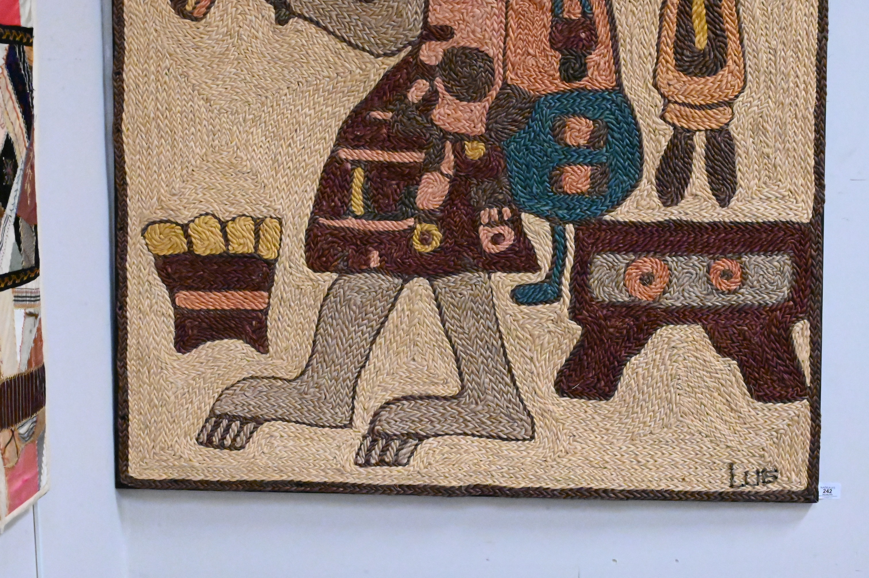 Hand-constructed wall hanging of coiled natural fibers, worked in high relief to form an abstracted figural composition of a demi god or deity. The earthy palette and sculptural surface reflect the mid-20th-century Latin American blend of folk tradition and modernist design.
