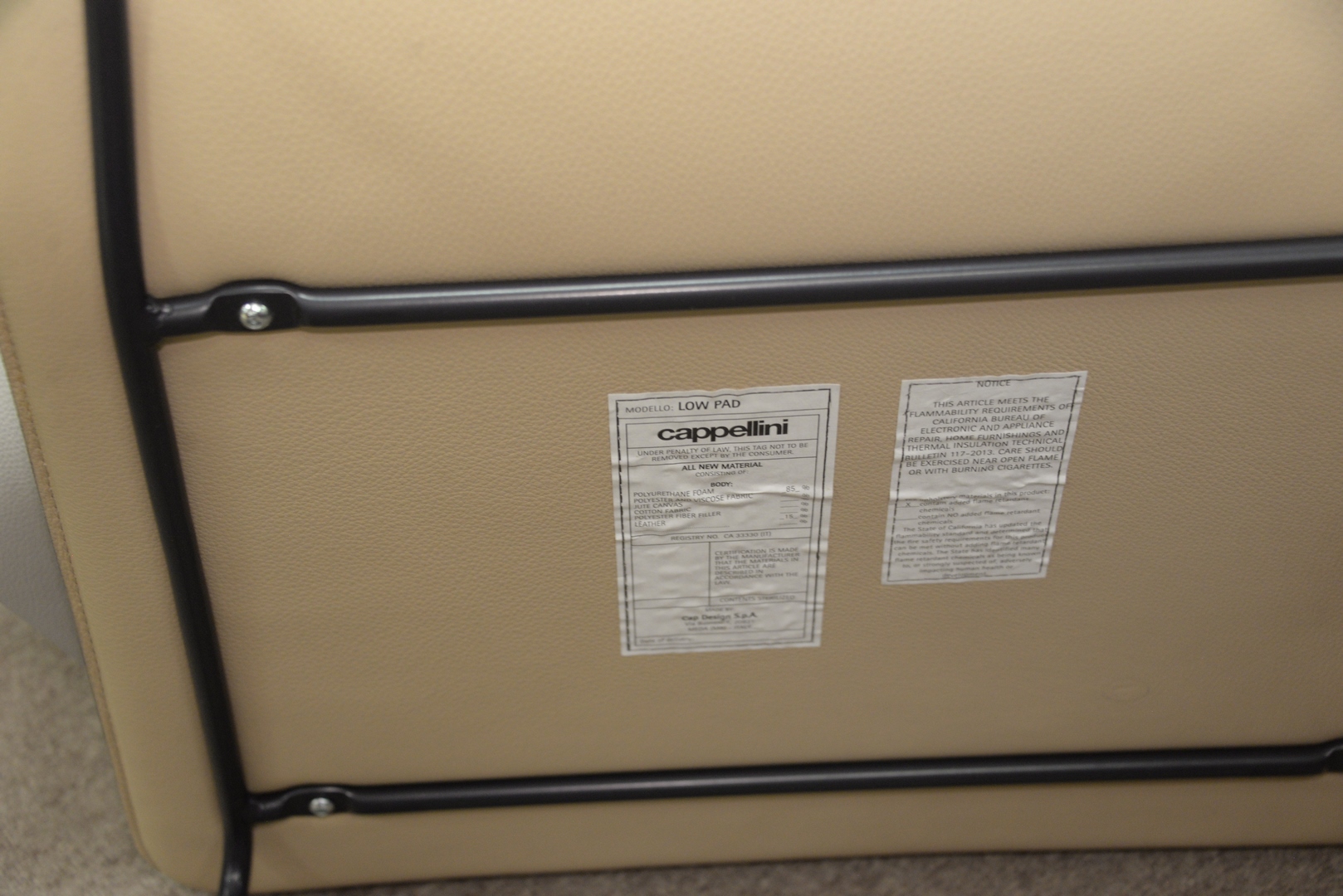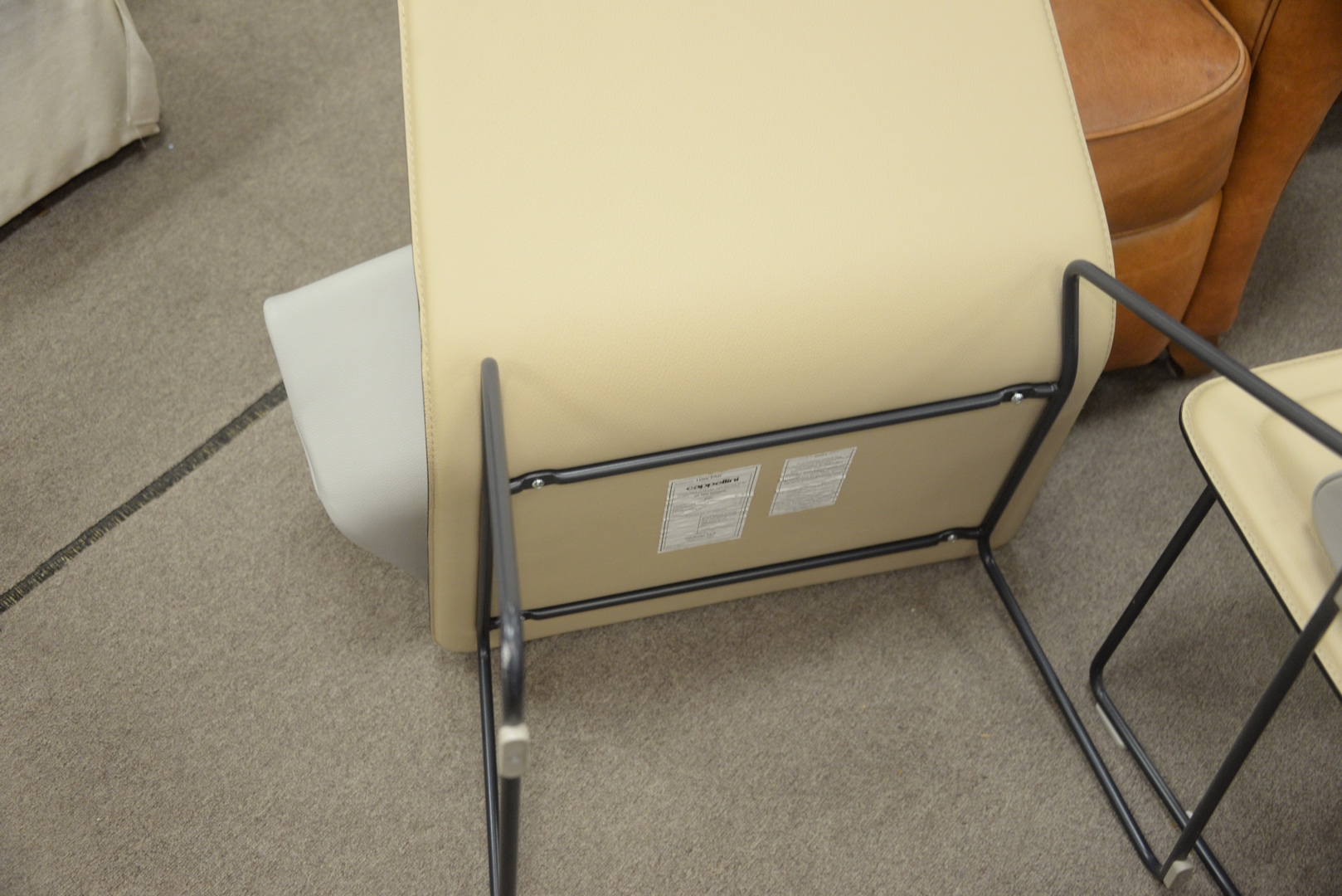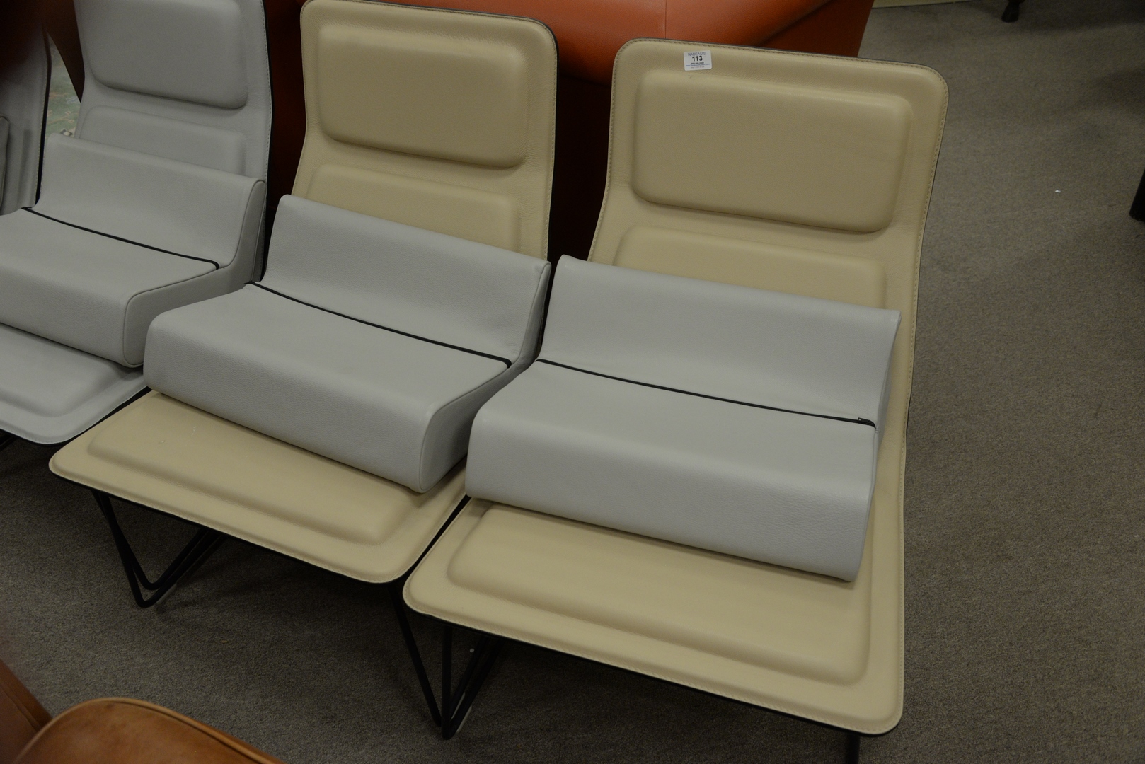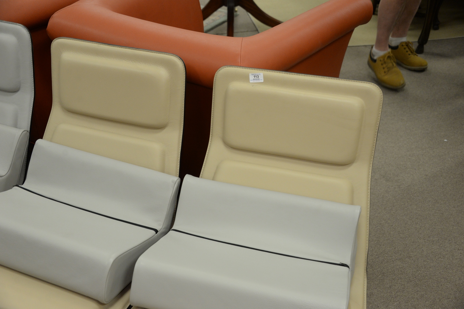 Lot 113: Pair of Jasper Morrison “Low Pad” Chairs, made by Cappellini Millan, tan leather with extra grey leather pad, height 31 1/2 inches.
