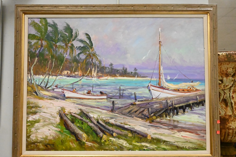 Robert Charles Gruppe (American, born 1944), “Yucatan Lagoon”, oil on canvas, signed lower right, having Robert Charles Gruppe Gallery label on verso, 30″ x 40″. Provenance: Waterfront Estate, Stamford, Connecticut.