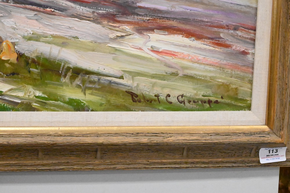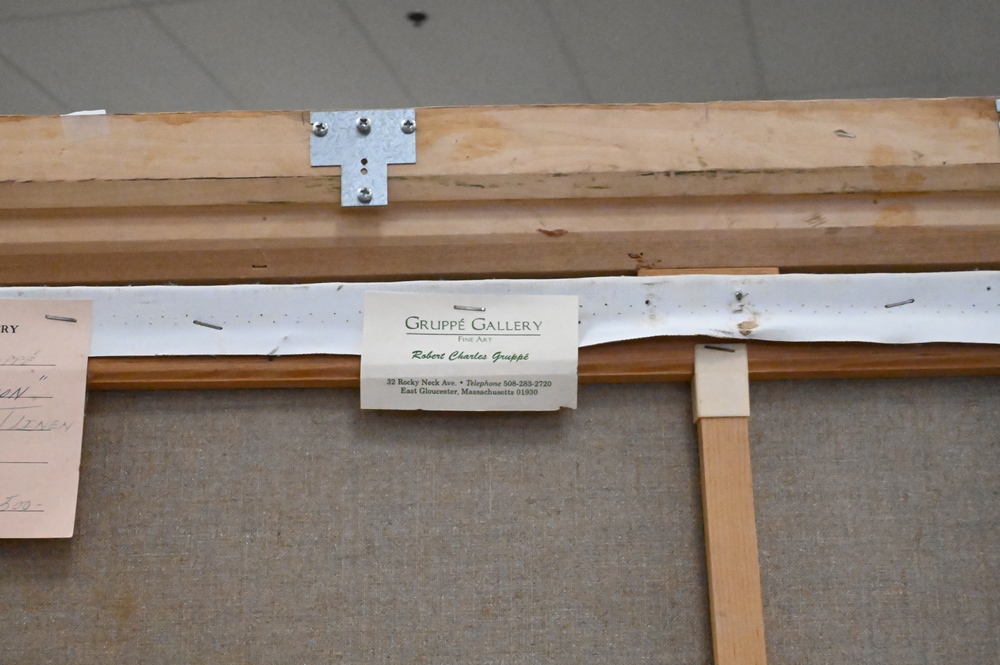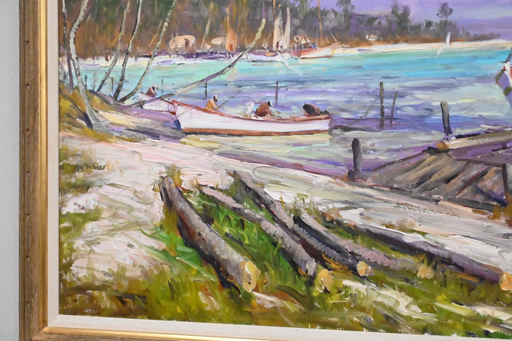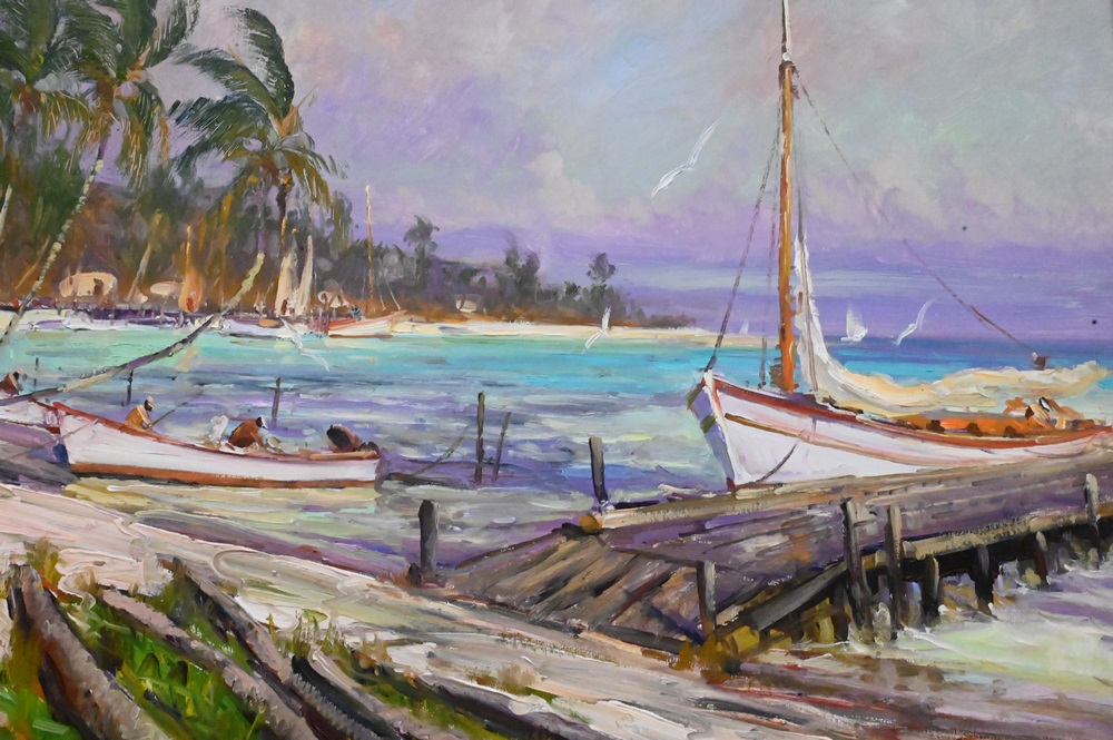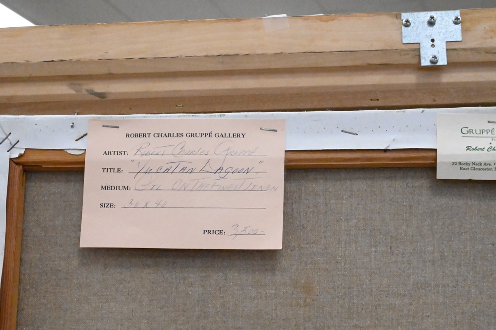 Lot 113: Robert Charles Gruppe (American, born 1944), “Yucatan Lagoon”, oil on canvas, signed lower right, having Robert Charles Gruppe Gallery label on verso, 30″ x 40″. Provenance: Waterfront Estate, Stamford, Connecticut.