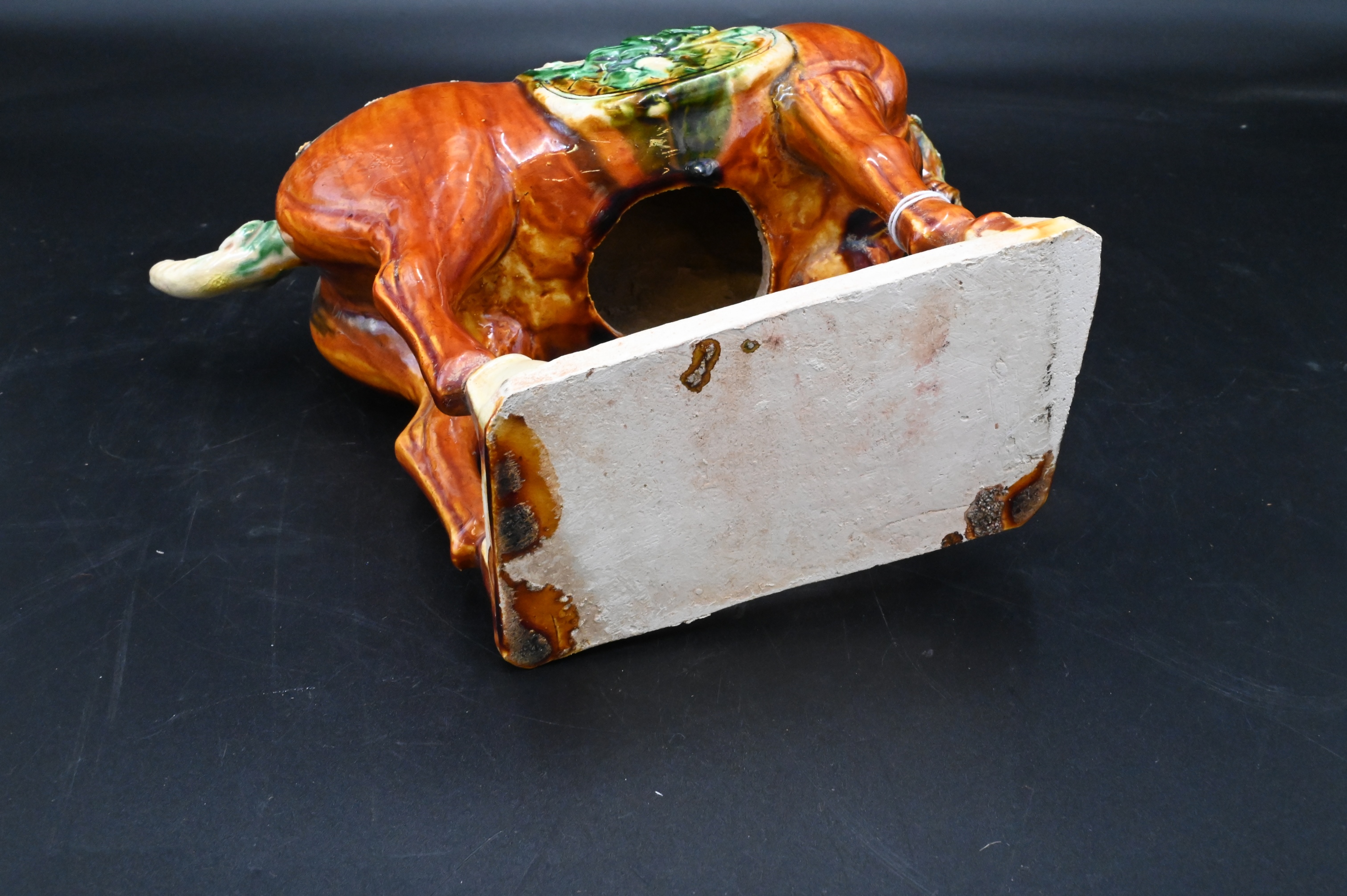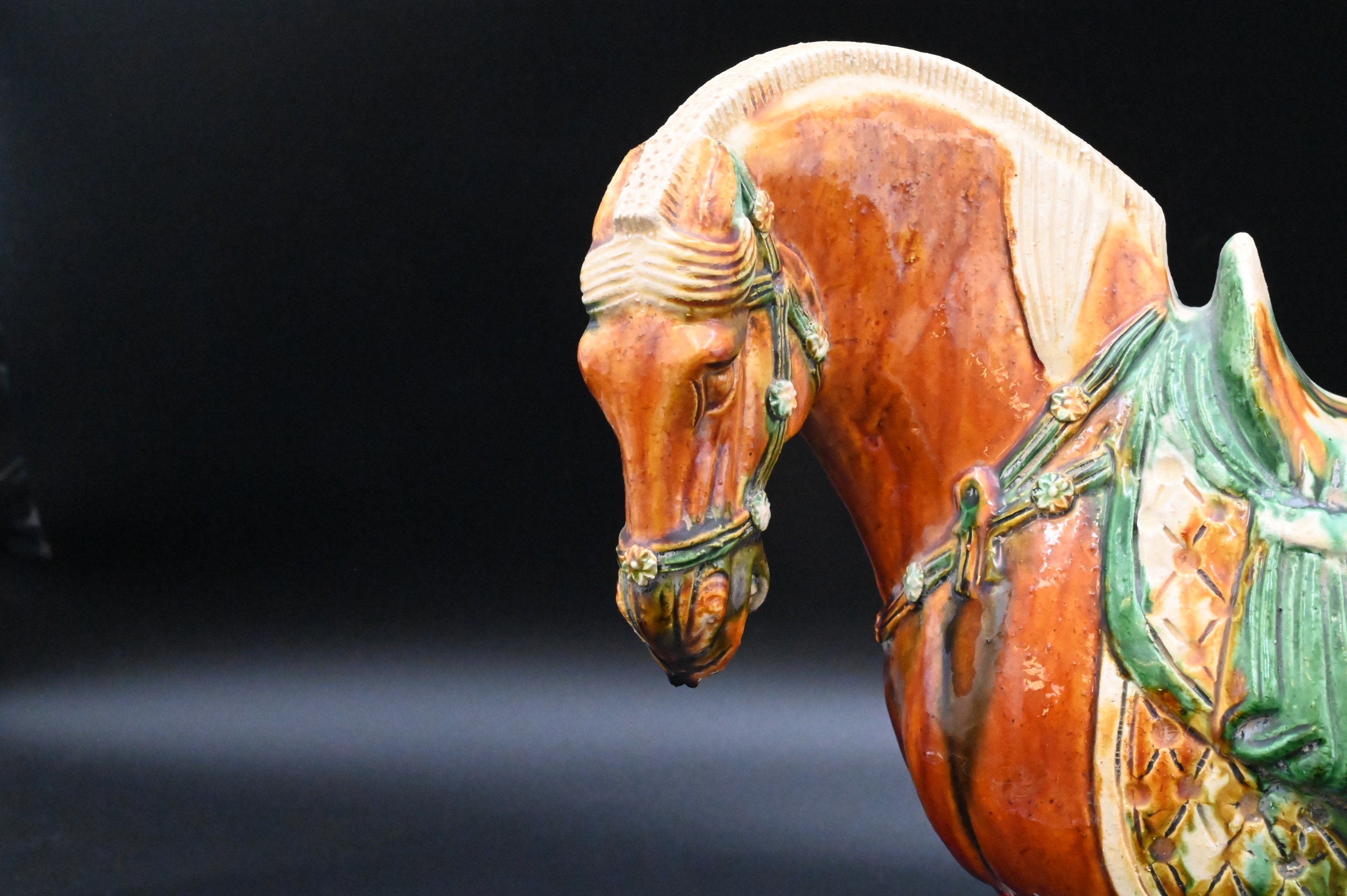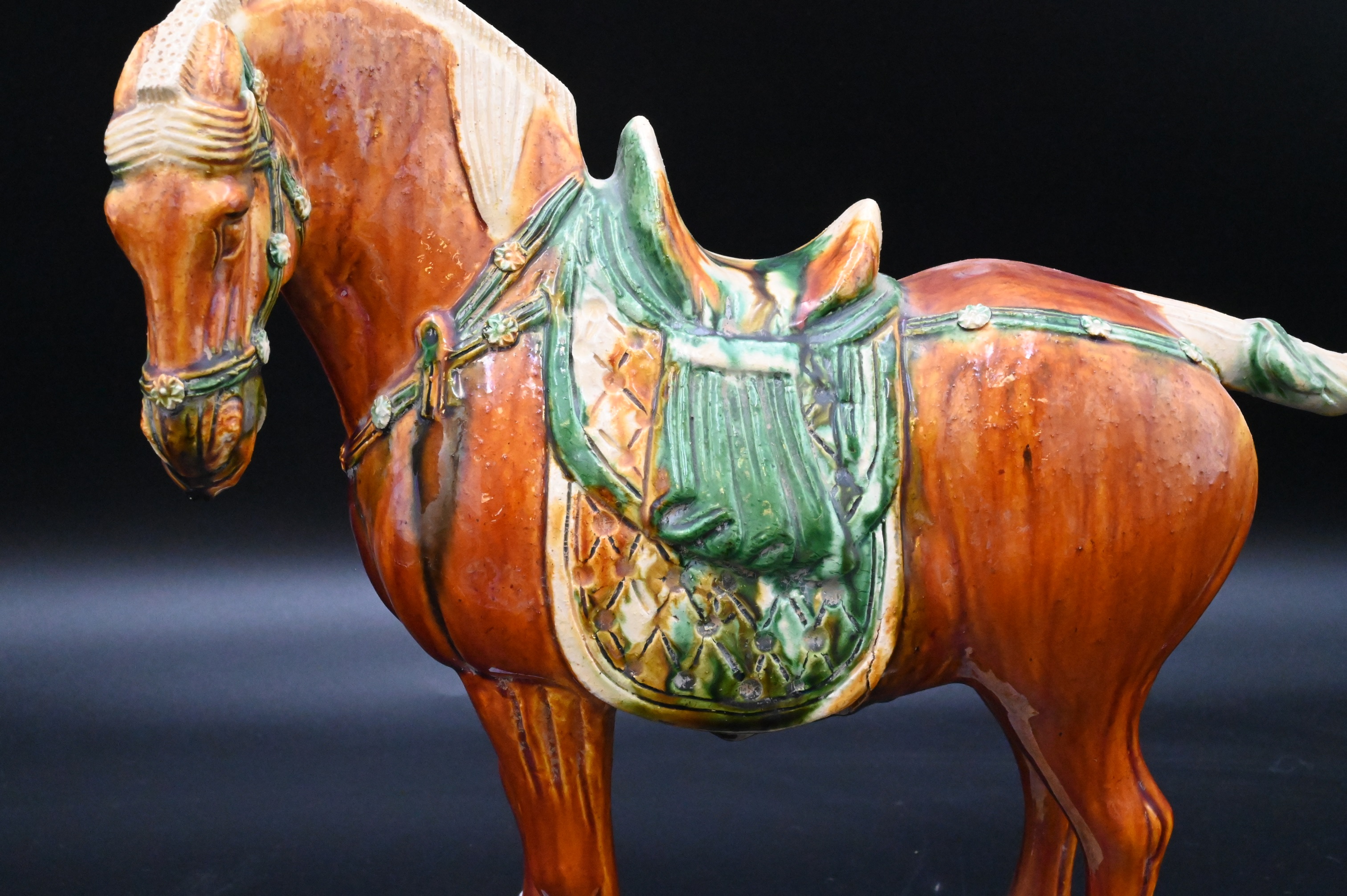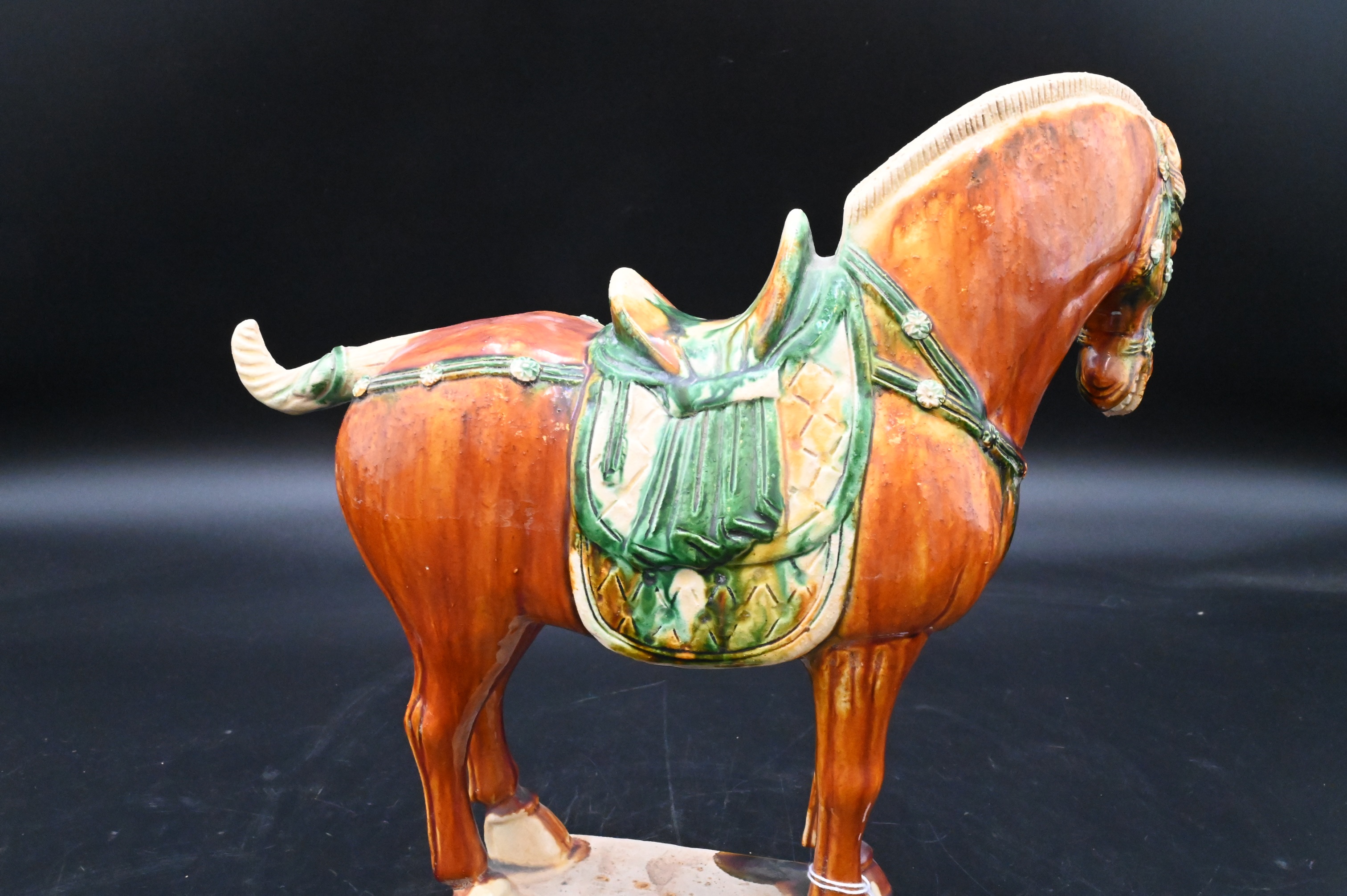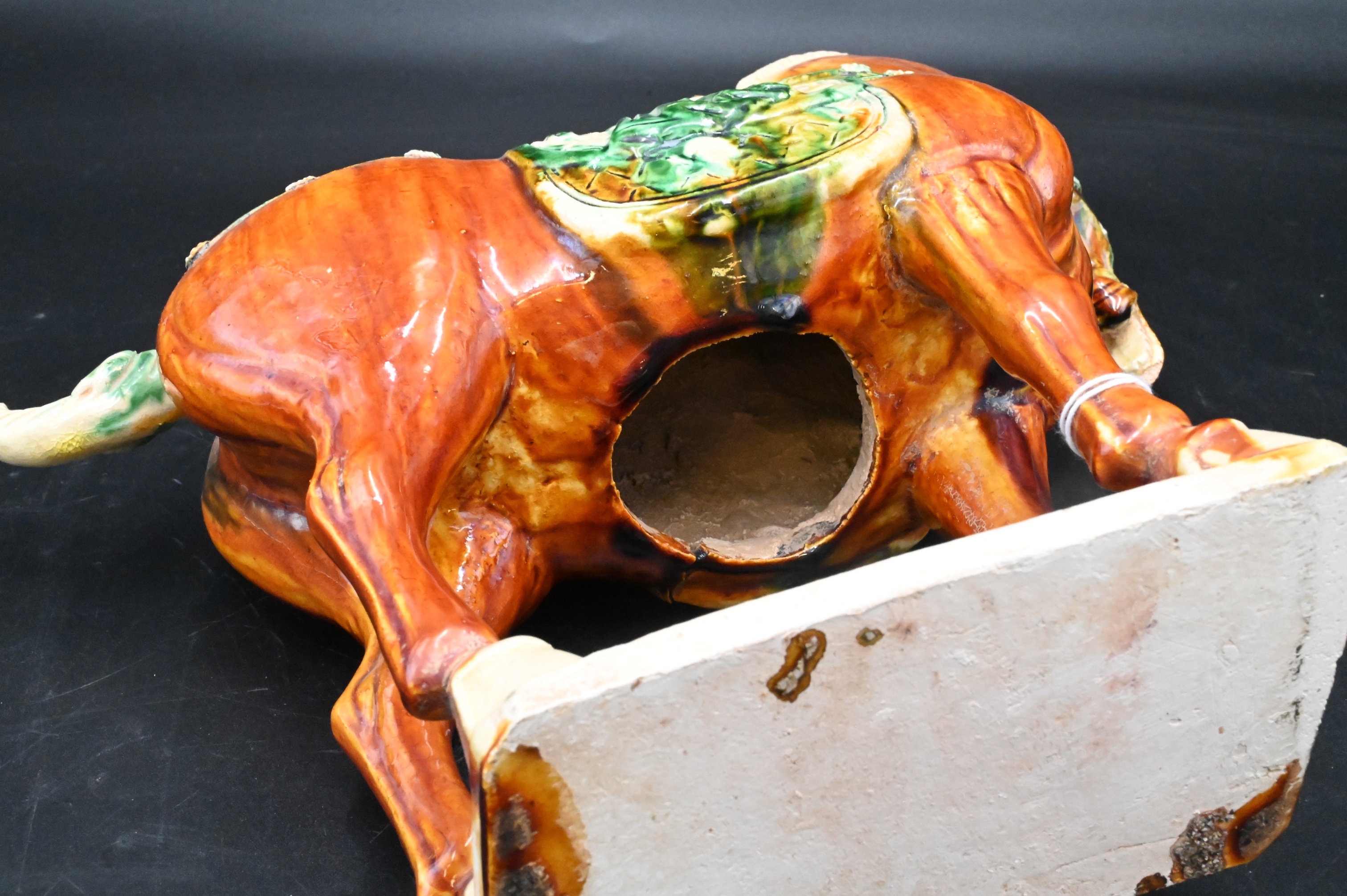 Tang Dynasty Style Pottery Horse, brown and green glaze on rectangular base, height 11 1/2 inches, length 13 inches, Provenance: Julius H Jacobson II a Fifth Avenue Estate.