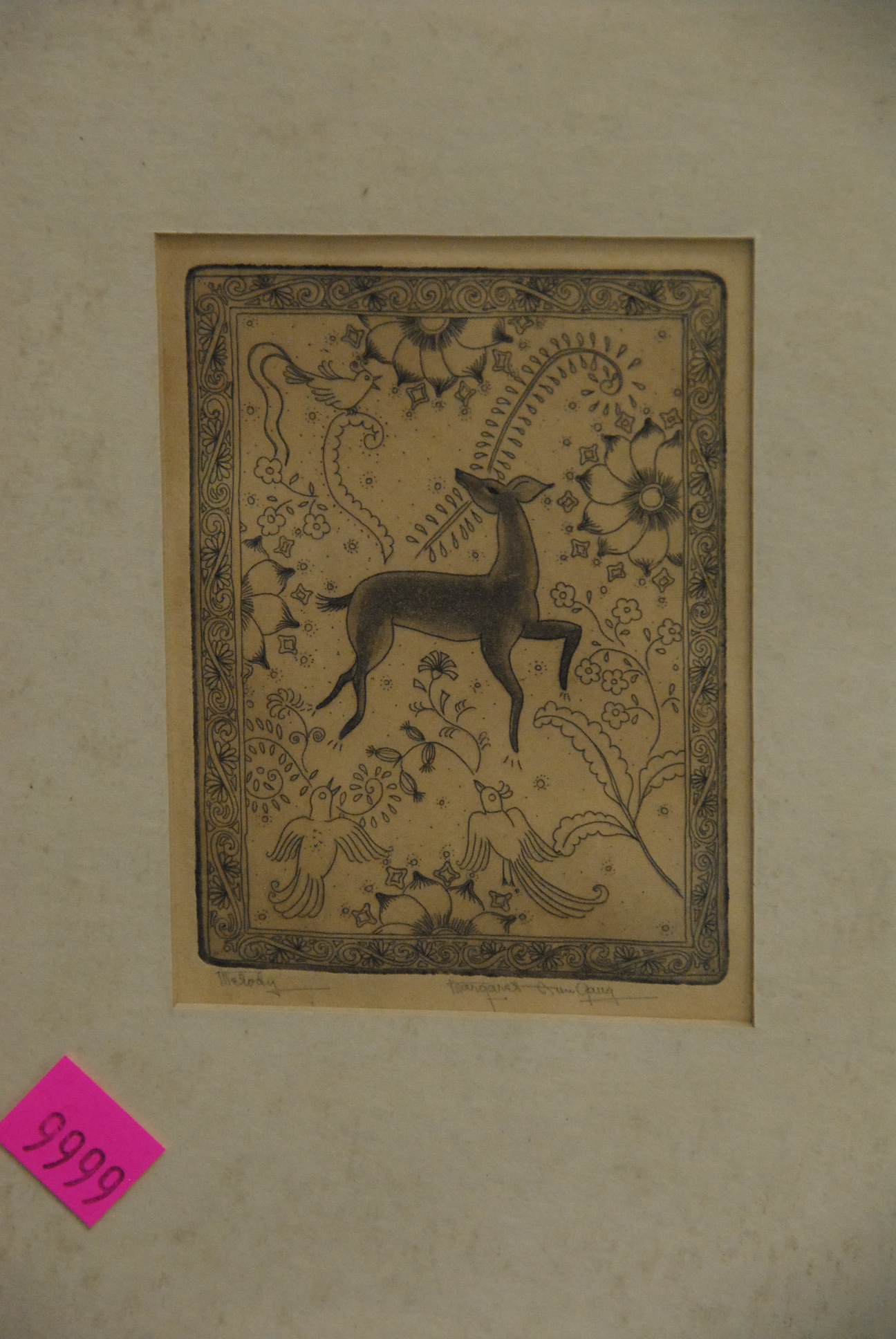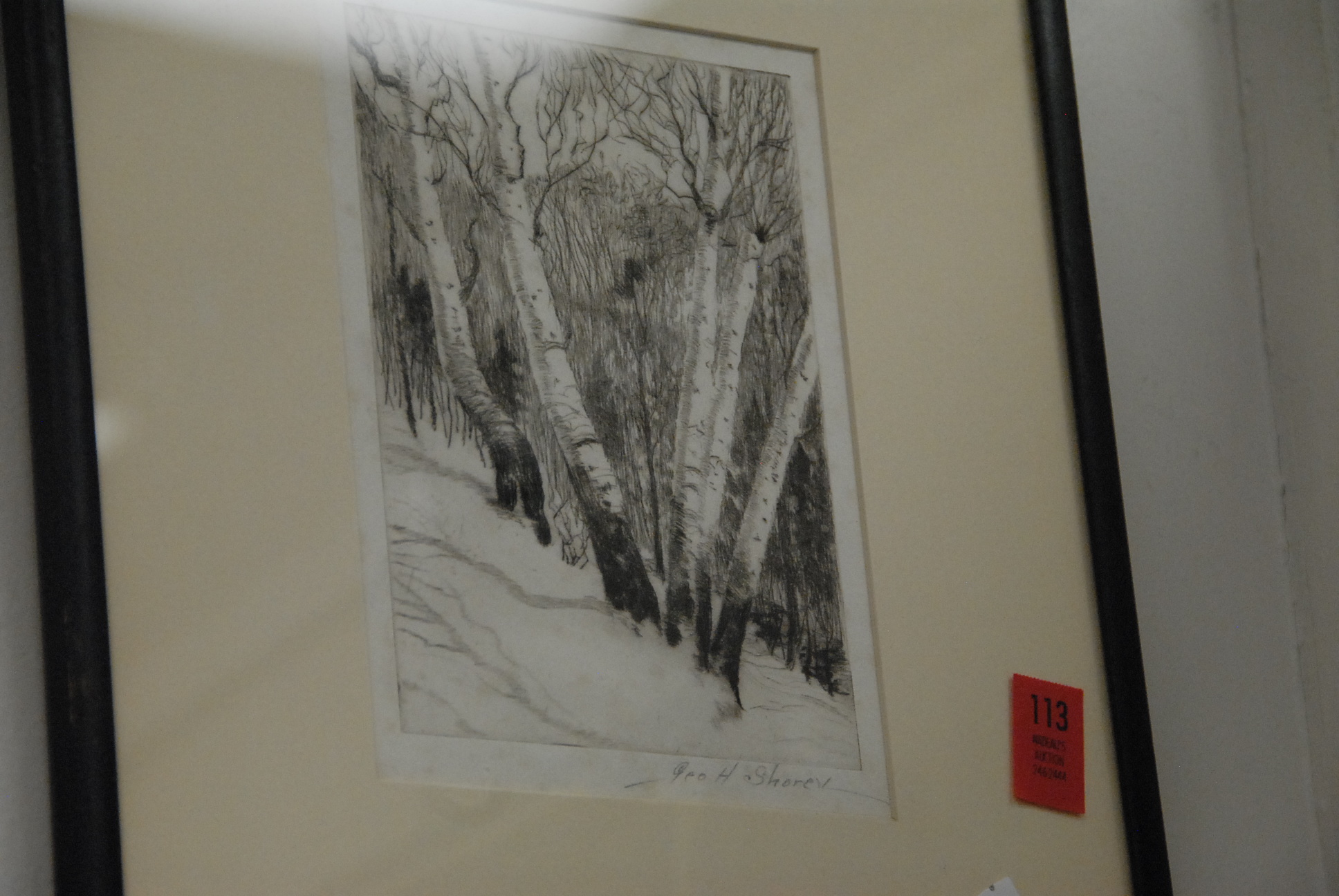 Three etchings to include Sir David Young Cameron 1865-1945 YPRES etching with Kennedy Prints label on reverse 8 x 6, Margorie Ann Guay 1909-1983 MELODY etching 4 x 3, and George H. Shorey 1870-1944 etching of winter landscape with Frederick Keppel label on reverse 6 1/2 x 5.