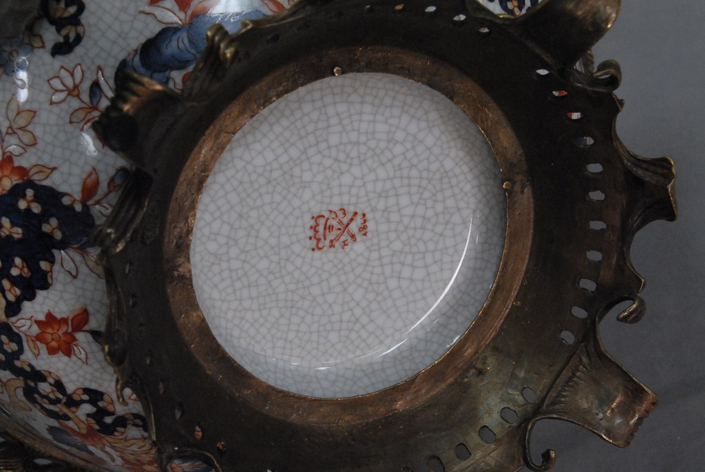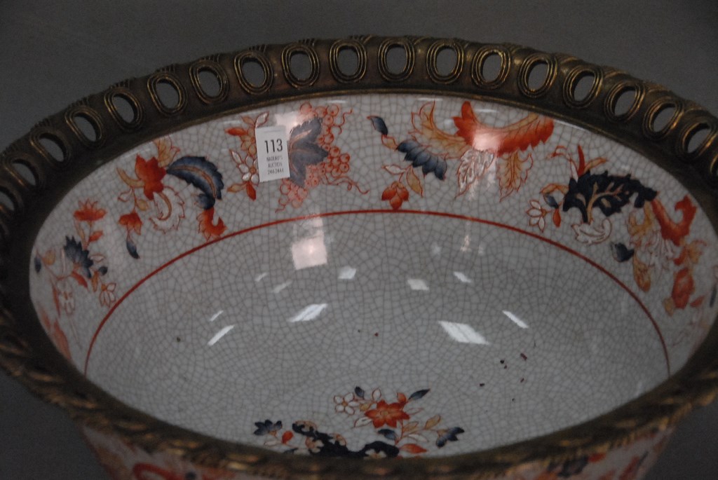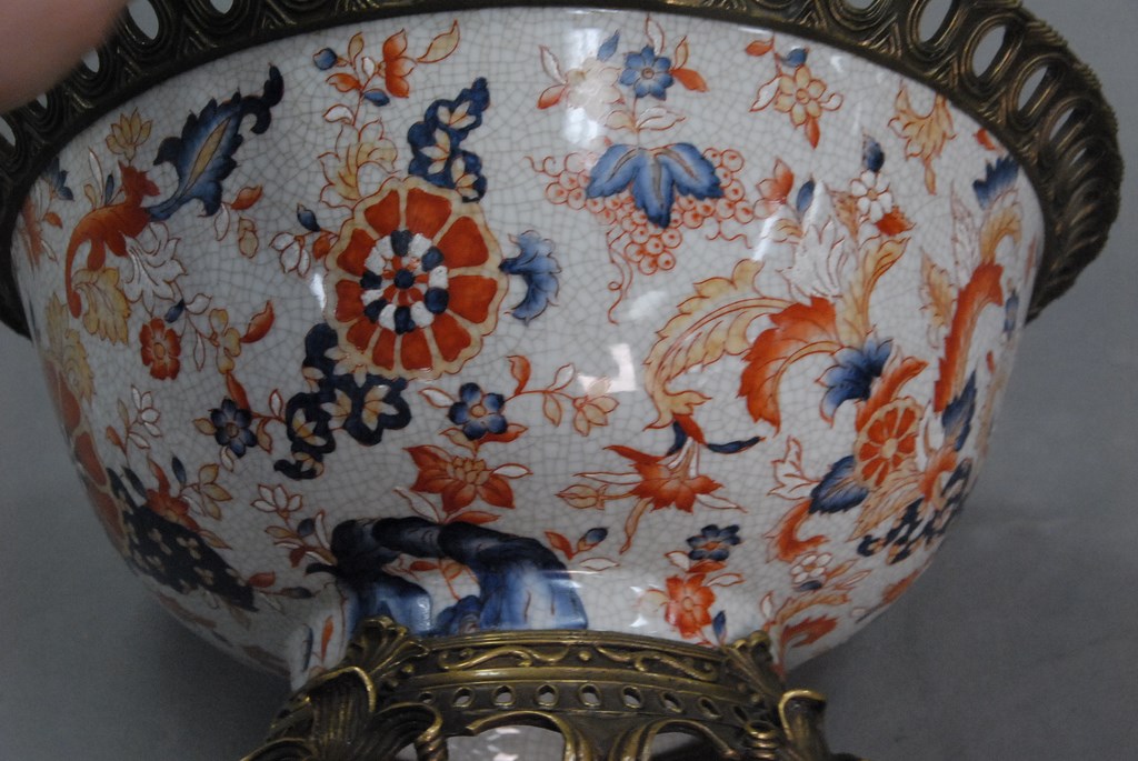 Lot 113: Three piece lot: decorative porcelain bowl mounted on brass stand with brass trim, and pair of blue and white porcelain urns.