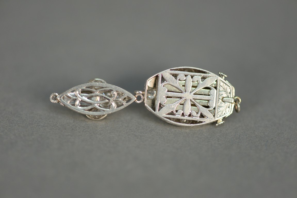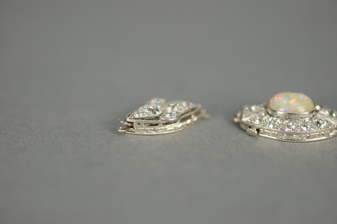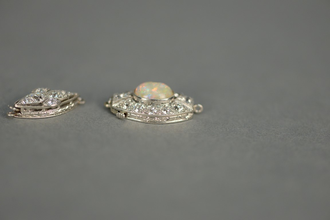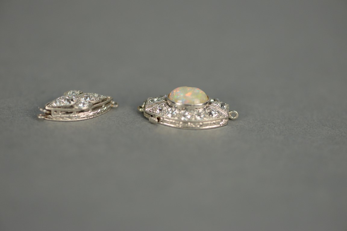 Lot 113: Two necklace clasps, one clasp set with center oval opal surrounded by twelve diamonds opal chipped and one clasp with six diamond…
