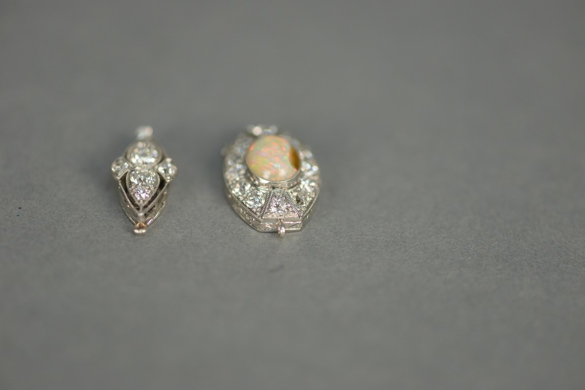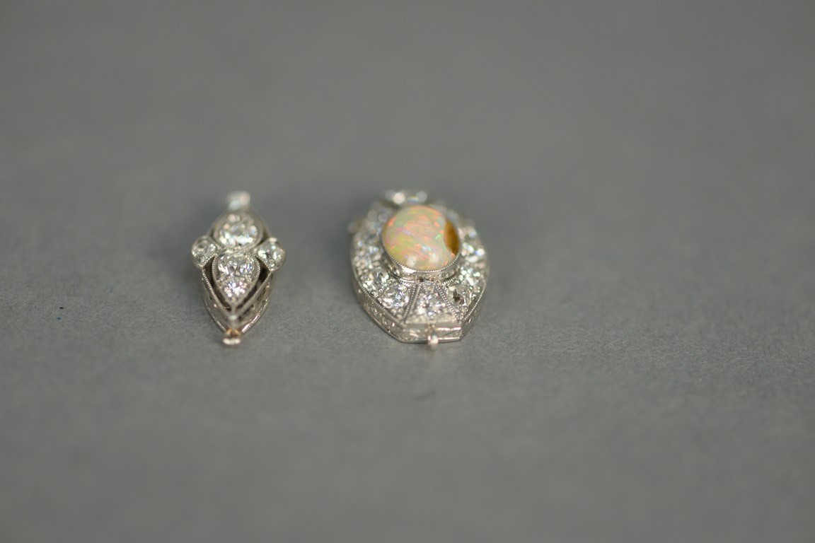 Two necklace clasps, one clasp set with center oval opal surrounded by twelve diamonds opal chipped and one clasp with six diamonds largest two at .35cts each.