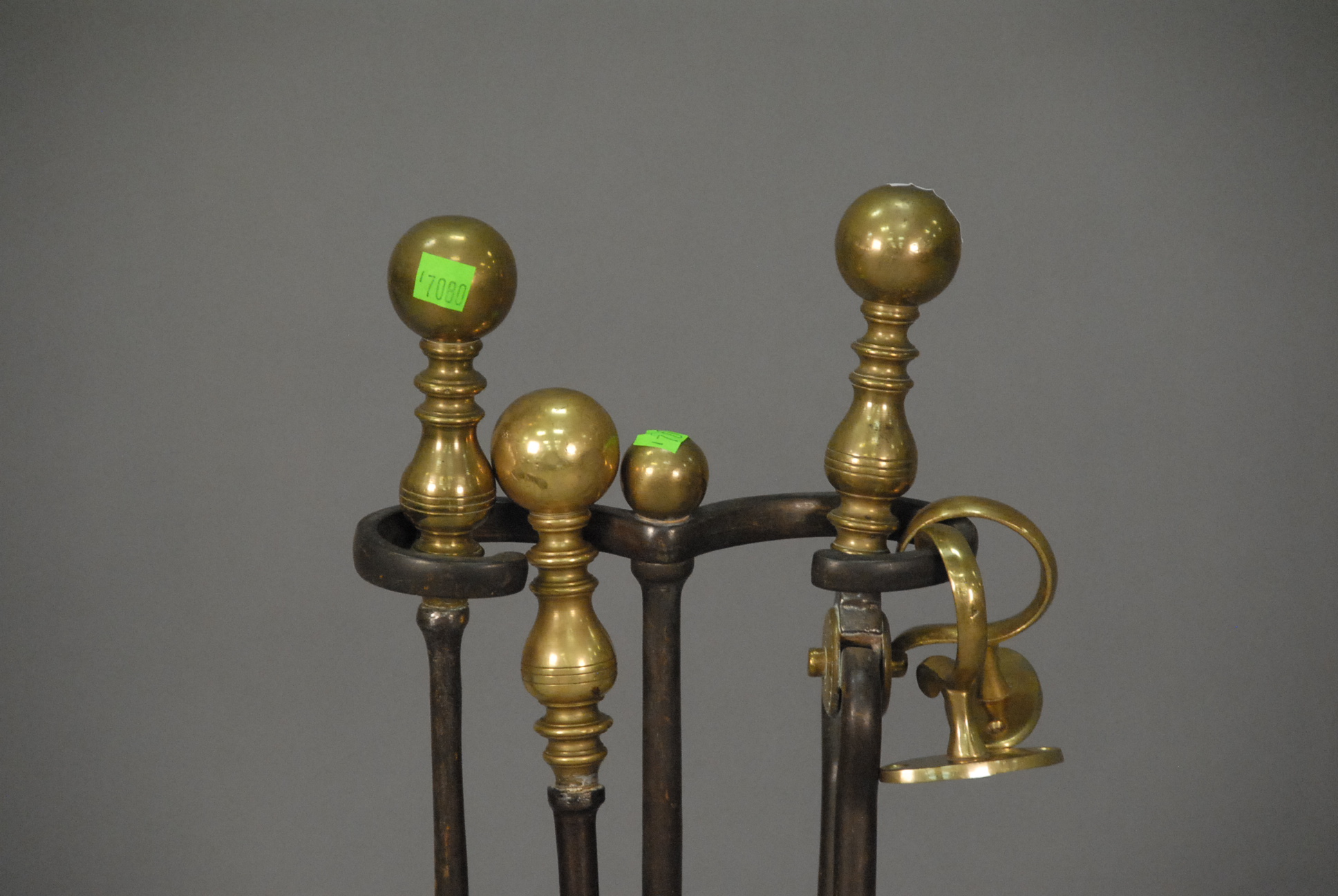 Lot 113G: Three Federal brass top fire tools, tool holder, and two jam hooks.